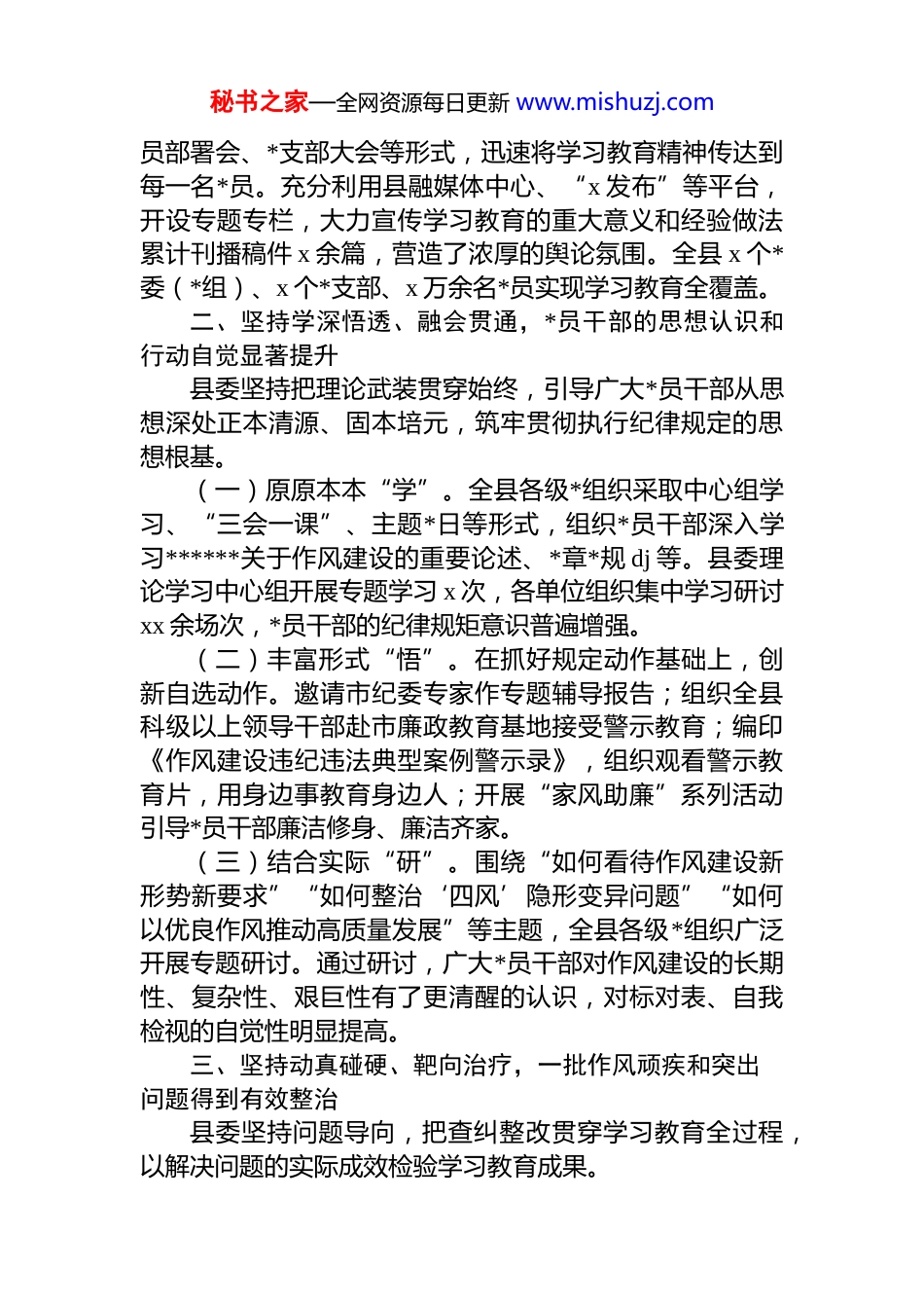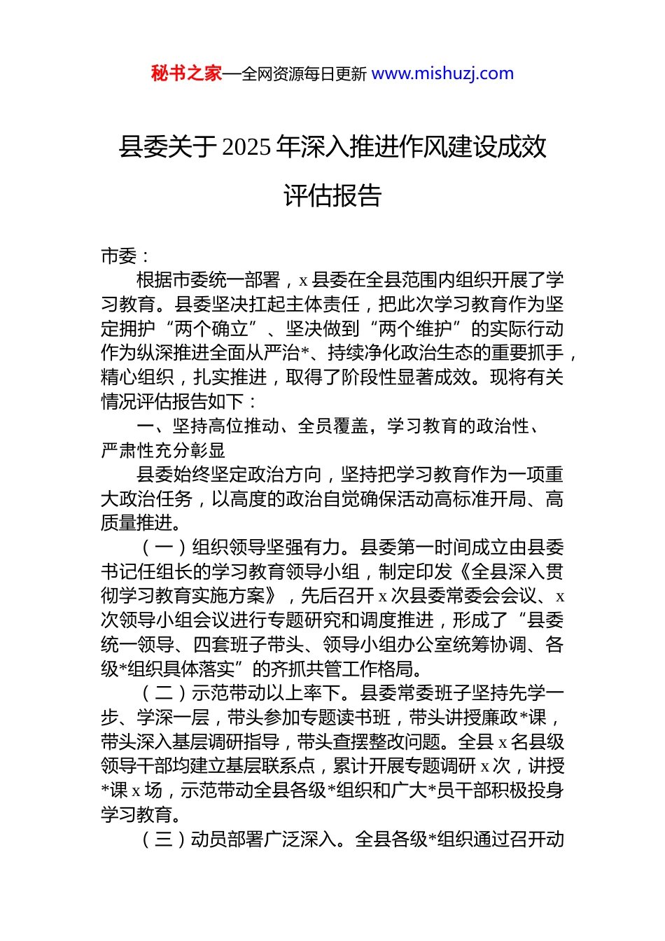 秘书之家—全网资源每日更新 www.mishuzj.com县委关于 2025 年深入推进作风建设成效评估报告市委:根据市委统一部署,x 县委在全县范围内组织开展了学习教育。县委坚决扛起主体责任,把此次学习教育作为坚定拥护“两个确立”、坚决做到“两个维护”的实际行动作为纵深推进全面从严治*、持续净化政治生态的重要抓手,精心组织,扎实推进,取得了阶段性显著成效。现将有关情况评估报告如下:一、坚持高位推动、全员覆盖,学习教育的政治性、严肃性充分彰显县委始终坚定政治方向,坚持把学习教育作为一项重大政治任务,以高度的政治自觉确保活动高标准开局、高质量推进。(一)组织领导坚强有力。县委第一时间成立由县委书记任组长的学习教育领导小组,制定印发《全县深入贯彻学习教育实施方案》,先后召开 x 次县委常委会会议、x次领导小组会议进行专题研究和调度推进,形成了“县委统一领导、四套班子带头、领导小组办公室统筹协调、各级*组织具体落实”的齐抓共管工作格局。(二)示范带动以上率下。县委常委班子坚持先学一步、学深一层,带头参加专题读书班,带头讲授廉政*课,带头深入基层调研指导,带头查摆整改问题。全县 x 名县级领导干部均建立基层联系点,累计开展专题调研 x 次,讲授*课 x 场,示范带动全县各级*组织和广大*员干部积极投身学习教育。(三)动员部署广泛深入。全县各级*组织通过召开动秘书之家—全网资源每日更新 www.mishuzj.com员部署会、*支部大会等形式,迅速将学习教育精神传达到每一名*员。充分利用县融媒体中心、“x 发布”等平台,开设专题专栏,大力宣传学习教育的重大意义和经验做法累计刊播稿件 x 余篇,营造了浓厚的舆论氛围。全县 x 个*委(*组)、x 个*支部、x 万余名*员实现学习教育全覆盖。二、坚持学深悟透、融会贯通,*员干部的思想认识和行动自觉显著提升县委坚持把理论武装贯穿始终,引导广大*员干部从思想深处正本清源、固本培元,筑牢贯彻执行纪律规定的思想根基。(一)原原本本“学”。全县各级*组织采取中心组学习、“三会一课”、主题*日等形式,组织*员干部深入学习******关于作风建设的重要论述、*章*规 dj 等。县委理论学习中心组开展专题学习 x 次,各单位组织集中学习研讨xx 余场次,*员干部的纪律规矩意识普遍增强。(二)丰富形式“悟”。在抓好规定动作基础上,创新自选动作。邀请市纪委专家作专题辅导报告;组织全县科级以上领导干部赴市廉政教育基地接受警示教育;编印《作风建设违纪违法典型案例警示录》,组织观看警示教育片,用身边事教育身边人;开展“家风助廉”系列活动引导*员干部廉洁修身、廉洁齐家。(三)结合实际“研”。围绕“如何看待作风建设新形势新要求”“如何整治‘四风’隐形变异问题”“如何以优良作风推动高质量发展”等主题,全县各级*组织广泛开展专题研讨。通过研讨,广大*员干部对作风建设的长期性、复杂性、艰巨性有了更清醒的认识,对标对表、自我检视的自觉性明显提高。三、坚持动真碰硬、靶向治疗,一批作风顽疾和突出问题得到有效整治县委坚持问题导向,把查纠整改贯穿学习教育全过程,以解决问题的实际成效检验学习教育成果。秘书之家—全网资源每日更新 www.mishuzj.com(一)全面深入查摆问题。坚持“开门纳谏”,通过设立意见箱、发放征求意见表、召开座谈会等方式,广泛征求“两代表一委员”、服务对象、基层群众的意见建议全县累计征集到涉及“四风”、营商环境、基层负担等方面的意见建议 x 条。各级领导班子和*员干部分层分类召开专题民主生活会和组织生活会,深入开展*性分析和自我剖析,形成问题清单。(二)分类施策精准整改。针对查摆出的问题,县委制定“总台账”,各单位建立“分台账”,逐项明确责任单位、整改措施和完成时限,实行销号管理。对共性问题开展专项整治。如,针对文山会海问题,县委带头精简会议文件,上半年全县性会议同比减少 x%,发文数量同比减少 x%。针对营商环境中的“中梗阻”问题,开展“局股长”作风专项评议,对排名靠后的 x 名干部进行约谈。针对基层反映的检查考核过多过频问题,全面清理和规范督查检查考核...