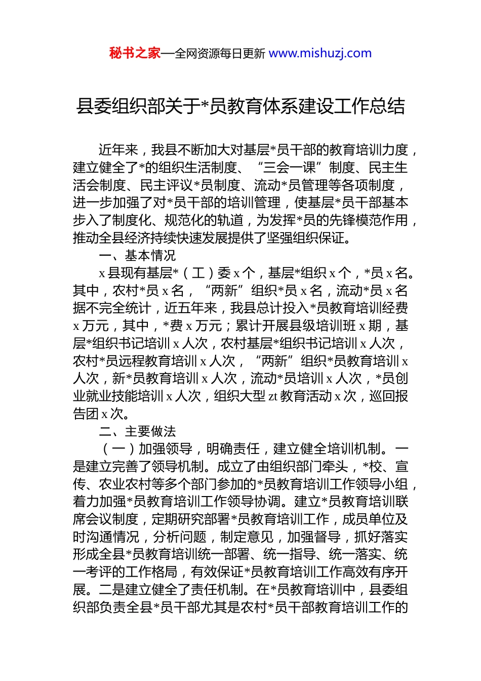 秘书之家—全网资源每日更新 www.mishuzj.com县委组织部关于*员教育体系建设工作总结近年来,我县不断加大对基层*员干部的教育培训力度,建立健全了*的组织生活制度、“三会一课”制度、民主生活会制度、民主评议*员制度、流动*员管理等各项制度,进一步加强了对*员干部的培训管理,使基层*员干部基本步入了制度化、规范化的轨道,为发挥*员的先锋模范作用,推动全县经济持续快速发展提供了坚强组织保证。一、基本情况x 县现有基层*(工)委 x 个,基层*组织 x 个,*员 x 名。其中,农村*员 x 名,“两新”组织*员 x 名,流动*员 x 名据不完全统计,近五年来,我县总计投入*员教育培训经费x 万元,其中,*费 x 万元;累计开展县级培训班 x 期,基层*组织书记培训 x 人次,农村基层*组织书记培训 x 人次,农村*员远程教育培训 x 人次,“两新”组织*员教育培训 x人次,新*员教育培训 x 人次,流动*员培训 x 人次,*员创业就业技能培训 x 人次,组织大型 zt 教育活动 x 次,巡回报告团 x 次。二、主要做法(一)加强领导,明确责任,建立健全培训机制。一是建立完善了领导机制。成立了由组织部门牵头,*校、宣传、农业农村等多个部门参加的*员教育培训工作领导小组,着力加强*员教育培训工作领导协调。建立*员教育培训联席会议制度,定期研究部署*员教育培训工作,成员单位及时沟通情况,分析问题,制定意见,加强督导,抓好落实形成全县*员教育培训统一部署、统一指导、统一落实、统一考评的工作格局,有效保证*员教育培训工作高效有序开展。二是建立健全了责任机制。在*员教育培训中,县委组织部负责全县*员干部尤其是农村*员干部教育培训工作的秘书之家—全网资源每日更新 www.mishuzj.com组织实施,县委宣传部负责县乡两级理论学习中心组学习计划的制定,以及县委中心组集中学习的组织,并对全县*员政治理论教育培训工作进行指导,县委*校负责*员培训师资配备及教材资料编印等相关工作。坚持把*员教育培训纳入年度 dj 责任目标,明确全县 x 个*委负责人要作为第一责任人亲自抓,形成组织部门牵头抓总、协调督导,各相关单位积极协作、扎实推行的*员教育培训责任机制。(二)纳入预算,加大投入,确保培训经费到位。把全县*员教育培训工作经费纳入财政预算,按时、足额拨付专项资金;明确县管*费向*员教育培训重点倾斜,确保*员教育培训工作正常开展。各部门单位专门安排*员教育经费,完善各种保障措施。通过上级拨付、财政投入、*费补充的办法,建立全县*员教育培训基金,由组织部门统一管理使用,集中用于举办各类培训、订购 dj 书刊、购置电教设备等*员教育培训工作。(三)统筹兼顾,分类施教,积极丰富培训内容。结合*员干部自身需要和岗位需求,按照“干什么学什么、缺什么补什么”的原则,坚持“菜单式”选学培训法,统筹兼顾,分类施教,确定不同的培训内容。对*员领导干部突出重大战略思想、形势政策、*风廉政等方面知识的培训;对农村*员重点进行*员先进性教育和农村政策法规、农业实用技术、卫生保健等方面知识的培训;对机关*员干部进行*的基本理论、基本路线及法律法规、行政管理、电子政务等方面知识的培训;对企业*员进行企业管理、专业技能、安全常识等方面知识的培训;对下岗失业*员进行焊工、钳工、电工、厨师、家电维修、电脑操作等专业技能培训。对年老体弱、行动不便*员,与年轻*员结成帮学对子,定期“上门送学”;对文化程度低、理解能力差的*员,运用文艺演出、课件等*员喜闻乐见的方式进行“感官助学”。近年来,共举办*的政治理论、创先争优活动、信息化与电子政务、农村政策法规、农业科技与实用技术等培训班 x 余秘书之家—全网资源每日更新 www.mishuzj.com期。(四)转变观念,拓宽渠道,不断创新培训方式。立足实际,转变观念,积极拓宽培训渠道,努力创新培训方式。专家授课与学员体验相结合。努力克服“满堂灌”“填鸭式”等单一的培训方式,采取情景式教学、体验式教学、案例式教学、现场式教学等多种教学方式,构建复合型培训模式,提升培训效果。县内培训和县外学习相结合。充分发挥县、乡*...