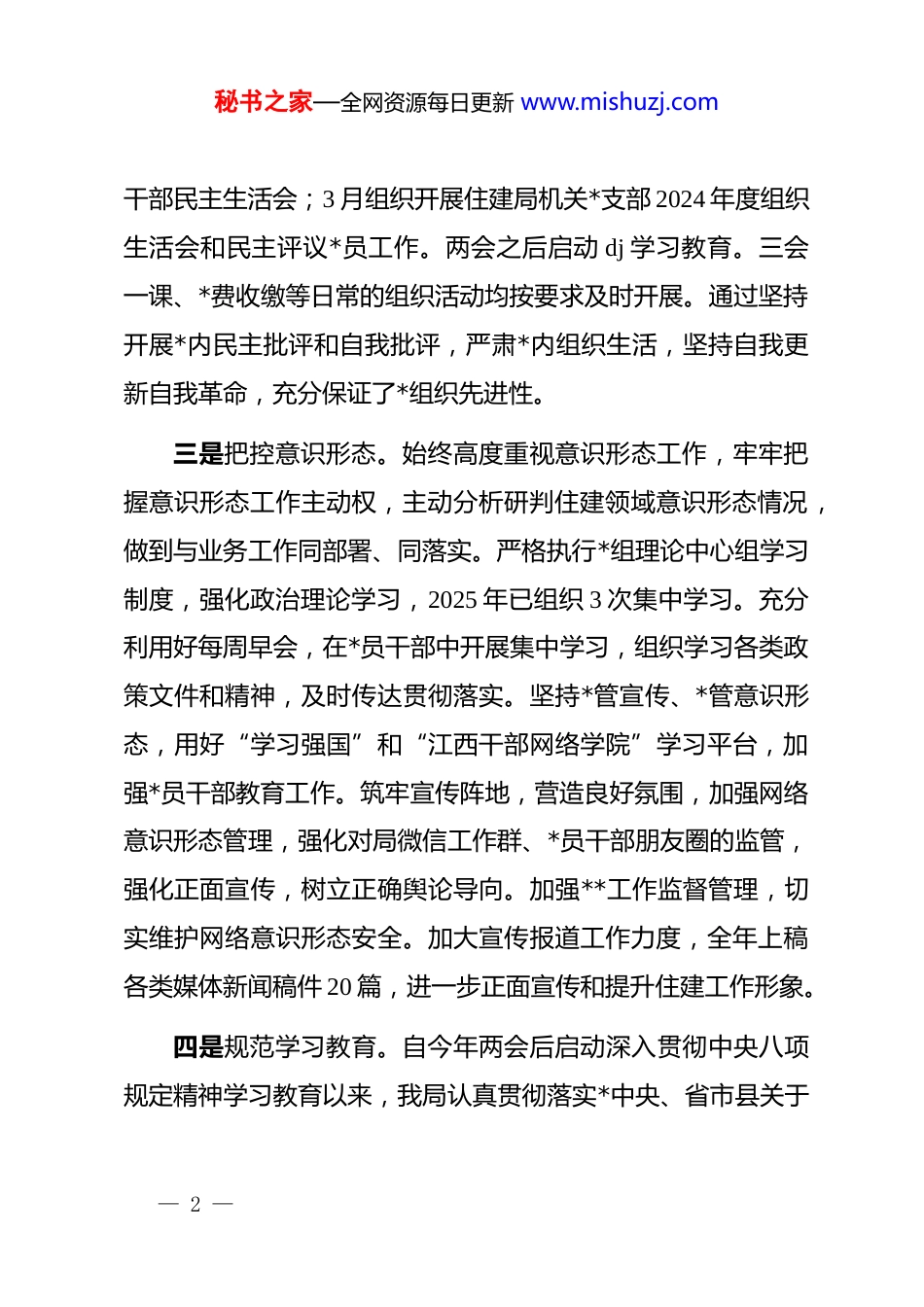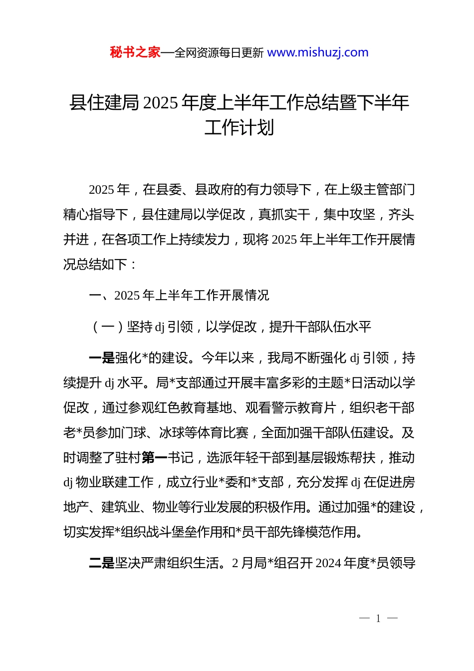 秘书之家—全网资源每日更新 www.mishuzj.com县住建局 2025 年度上半年工作总结暨下半年工作计划2025 年,在县委、县政府的有力领导下,在上级主管部门精心指导下,县住建局以学促改,真抓实干,集中攻坚,齐头并进,在各项工作上持续发力,现将 2025 年上半年工作开展情况总结如下:一、2025 年上半年工作开展情况(一)坚持 dj 引领,以学促改,提升干部队伍水平一是强化*的建设。今年以来,我局不断强化 dj 引领,持续提升 dj 水平。局*支部通过开展丰富多彩的主题*日活动以学促改,通过参观红色教育基地、观看警示教育片,组织老干部老*员参加门球、冰球等体育比赛,全面加强干部队伍建设。及时调整了驻村第一书记,选派年轻干部到基层锻炼帮扶,推动dj 物业联建工作,成立行业*委和*支部,充分发挥 dj 在促进房地产、建筑业、物业等行业发展的积极作用。通过加强*的建设,切实发挥*组织战斗堡垒作用和*员干部先锋模范作用。二是坚决严肃组织生活。2 月局*组召开 2024 年度*员领导— 1 —秘书之家—全网资源每日更新 www.mishuzj.com干部民主生活会;3 月组织开展住建局机关*支部 2024 年度组织生活会和民主评议*员工作。两会之后启动 dj 学习教育。三会一课、*费收缴等日常的组织活动均按要求及时开展。通过坚持开展*内民主批评和自我批评,严肃*内组织生活,坚持自我更新自我革命,充分保证了*组织先进性。三是把控意识形态。始终高度重视意识形态工作,牢牢把握意识形态工作主动权,主动分析研判住建领域意识形态情况,做到与业务工作同部署、同落实。严格执行*组理论中心组学习制度,强化政治理论学习,2025 年已组织 3 次集中学习。充分利用好每周早会,在*员干部中开展集中学习,组织学习各类政策文件和精神,及时传达贯彻落实。坚持*管宣传、*管意识形态,用好“学习强国”和“江西干部网络学院”学习平台,加强*员干部教育工作。筑牢宣传阵地,营造良好氛围,加强网络意识形态管理,强化对局微信工作群、*员干部朋友圈的监管,强化正面宣传,树立正确舆论导向。加强**工作监督管理,切实维护网络意识形态安全。加大宣传报道工作力度,全年上稿各类媒体新闻稿件 20 篇,进一步正面宣传和提升住建工作形象。四是规范学习教育。自今年两会后启动深入贯彻中央八项规定精神学习教育以来,我局认真贯彻落实*中央、省市县关于— 2 —秘书之家—全网资源每日更新 www.mishuzj.com学习教育工作部署要求,认真学习贯彻中央八项规定精神及其实施细则。局*组于 3 月 31 日召开了*组会和专题会,对学习教育工作进行研究部署和安排,制定了《xx 县住建局深入贯彻中央八项规定精神学习教育工作安排建议》,机关*支部制定了学习计划,成立了工作领导小组和工作专班,4 月至 6 月机关*支部共进行了 3 次集中学习。通过学习教育,*员干部的纪律意识和规矩意识不断提升。五是优化工作氛围。不断丰富职工集体活动,通过组织体检、“嘉游赣”、春游、参加拔河、羽毛球、台球比赛等方式,强化干部职工的全局意识、团结意识,有力提升全局干事创业士气。积极引导干部职工在项目建设、行业监管、优化营商环境、招商引资、为群众排忧解难等方面主动作为,促使全局上下形成风清气正和积极向上的工作氛围。(二)狠抓作风建设,强化教育,有效凝聚工作合力一是坚决压实责任。今年以来,我局始终坚持全面从严治*,及时传达学习了中央、省、市、县纪委全会精神和各项工作要求。局主要领导坚决履行全面从严治*及*风廉政建设工作主体责任,分管领导加强对所分管股室和干部的日常监督管理、谈话提醒,有效落实*风廉政建设“一岗双责”,全局全面从严治— 3 —秘书之家—全网资源每日更新 www.mishuzj.com*责任得到有效压实。二是坚持制度办事。严格按照*内政治生活准则和*的各项规定办事,坚持贯彻民主集中制,凡是大额资金使用、重大人事任免、重大事项决策等“三重一大”事项均严格按照程序报局*组集体研究讨论后实施。今年我局共召开*组会 15 次,研究讨论“三重一大”事项 116 件。同时通过完善风险廉能管理,加强日常考勤通报,严格执行内部...