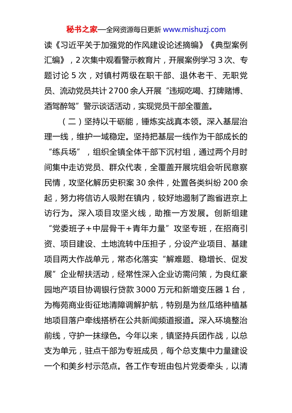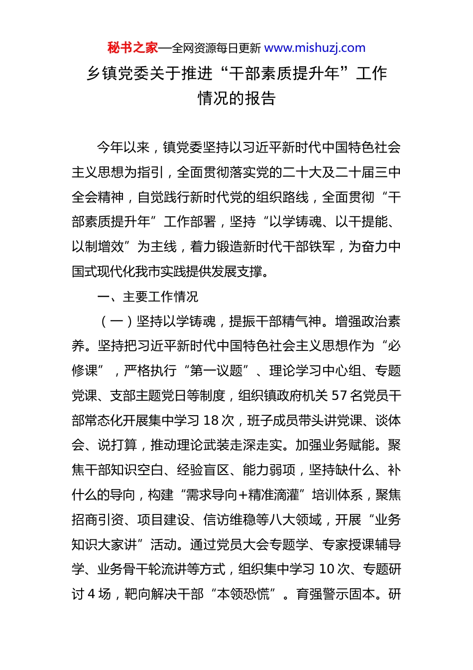 秘书之家—全网资源每日更新 www.mishuzj.com乡镇党委关于推进“干部素质提升年”工作情况的报告 今年以来,镇党委坚持以习近平新时代中国特色社会主义思想为指引,全面贯彻落实党的二十大及二十届三中全会精神,自觉践行新时代党的组织路线,全面贯彻“干部素质提升年”工作部署,坚持“以学铸魂、以干提能、以制增效”为主线,着力锻造新时代干部铁军,为奋力中国式现代化我市实践提供发展支撑。一、主要工作情况(一)坚持以学铸魂,提振干部精气神。增强政治素养。坚持把习近平新时代中国特色社会主义思想作为“必修课”,严格执行“第一议题”、理论学习中心组、专题党课、支部主题党日等制度,组织镇政府机关 57 名党员干部常态化开展集中学习 18 次,班子成员带头讲党课、谈体会、说打算,推动理论武装走深走实。加强业务赋能。聚焦干部知识空白、经验盲区、能力弱项,坚持缺什么、补什么的导向,构建“需求导向+精准滴灌”培训体系,聚焦招商引资、项目建设、信访维稳等八大领域,开展“业务知识大家讲”活动。通过党员大会专题学、专家授课辅导学、业务骨干轮流讲等方式,组织集中学习 10 次、专题研讨 4 场,靶向解决干部“本领恐慌”。育强警示固本。研秘书之家—全网资源每日更新 www.mishuzj.com读《习近平关于加强党的作风建设论述摘编》《典型案例汇编》,2 次集中观看警示教育片,开展案例学习 3 次、专题讨论 5 次,对镇村两级在职干部、退休老干、无职党员、流动党员共计 2700 余人开展“违规吃喝、打牌赌博、酒驾醉驾”警示谈话活动,实现党员干部全覆盖。(二)坚持以干砺能,锤炼实战真本领。深入基层治理一线,维护一域稳定。坚持把基层一线作为干部成长的“练兵场”,组织全镇全体干部下沉村组,通过两个月时间集中走访党员、群众代表,全覆盖开展垸组会听民意察民情,攻坚化解历史积案 30 余件,处置各类纠纷 200 余起,努力将信访人吸附在镇内,较好地遏制了跑省进京上访行为。深入项目攻坚火线,助推一方发展。创新组建“党委班子+中层骨干+青年力量”攻坚专班,在招商引资、项目建设、土地流转中压担子,分设产业项目、基建项目两大作战单元,常态化落实“解难题、稳增长、促发展”企业帮扶活动,经常性深入企业访需问策,为良红豪园地产项目协调银行贷款 3000 万元和新增变压器 1 台,为梅苑商业街征地清障调解护航,特别是为丝瓜络种植基地项目落户牵线搭桥在公共新闻频道报道。深入环境整治前线,守护一抹绿色。今年以来,镇坚持兵团作战,以总支为单元,驻点干部为专班成员,每个总支集中力量建设一个和美乡村示范点。各工作专班由包片党委牵头,以清秘书之家—全网资源每日更新 www.mishuzj.com洁家园为重要抓手,聚焦群众急难愁盼问题,持续开展环境整治提升行动,示范组面貌逐渐改变,群众幸福感、获得感显著提升。(三)坚持以制增效,打造干事强引擎。正向激励鼓干劲。将政治标准作为硬杠杠,强化平时考核结果运用,与评优评先、提拔任用直接挂钩,树立“有为者有位”的鲜明导向。大力提拔落实综合民生服务政策、防汛抗旱等急难险重工作成绩出色的干部,重点培养选拔顾大局、作风正、能吃苦、肯担当的干部,今年以来提拔 1 名干部进入党委班子,3 人获得职级晋升,3 人进行轮岗交流,干事创业环境向上向好。反向鞭策促提升。对履职不力、作风不实的驻点干部和村党支部书记在全镇大会上进行通报批评,对人居环境整治、秸秆禁烧等被动落后的村进行经济处罚和追责问责,通过责任到人传导压力的方式,推动“躺平式”干部“站起来、跑起来”。激励关爱暖人心。加强干部之间革命友谊培养,帮助干部解决实际困难,在婚育择偶、突发意外困难、家庭正当权益维护等方面予以牵线搭桥、协助支持,成功为 1 名干部家庭亲属调解经济纠纷,为 2 名年轻干部申请乡村干部关爱资金 8 千元,举办 1 期青年人才联谊会。二、下一步工作打算下一步,镇党委将进一步聚焦“干部素质提升年”目秘书之家—全网资源每日更新 www.mishuzj.com标要求,持续加强干部队伍建设,为奋力推进中国式现代化我市实践提供坚强的组织保障。(...