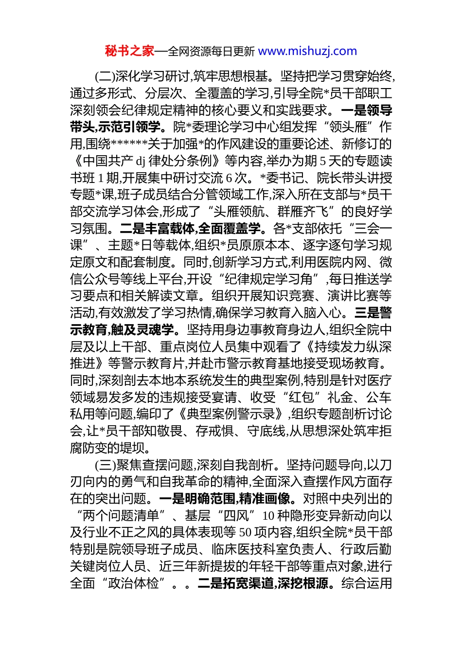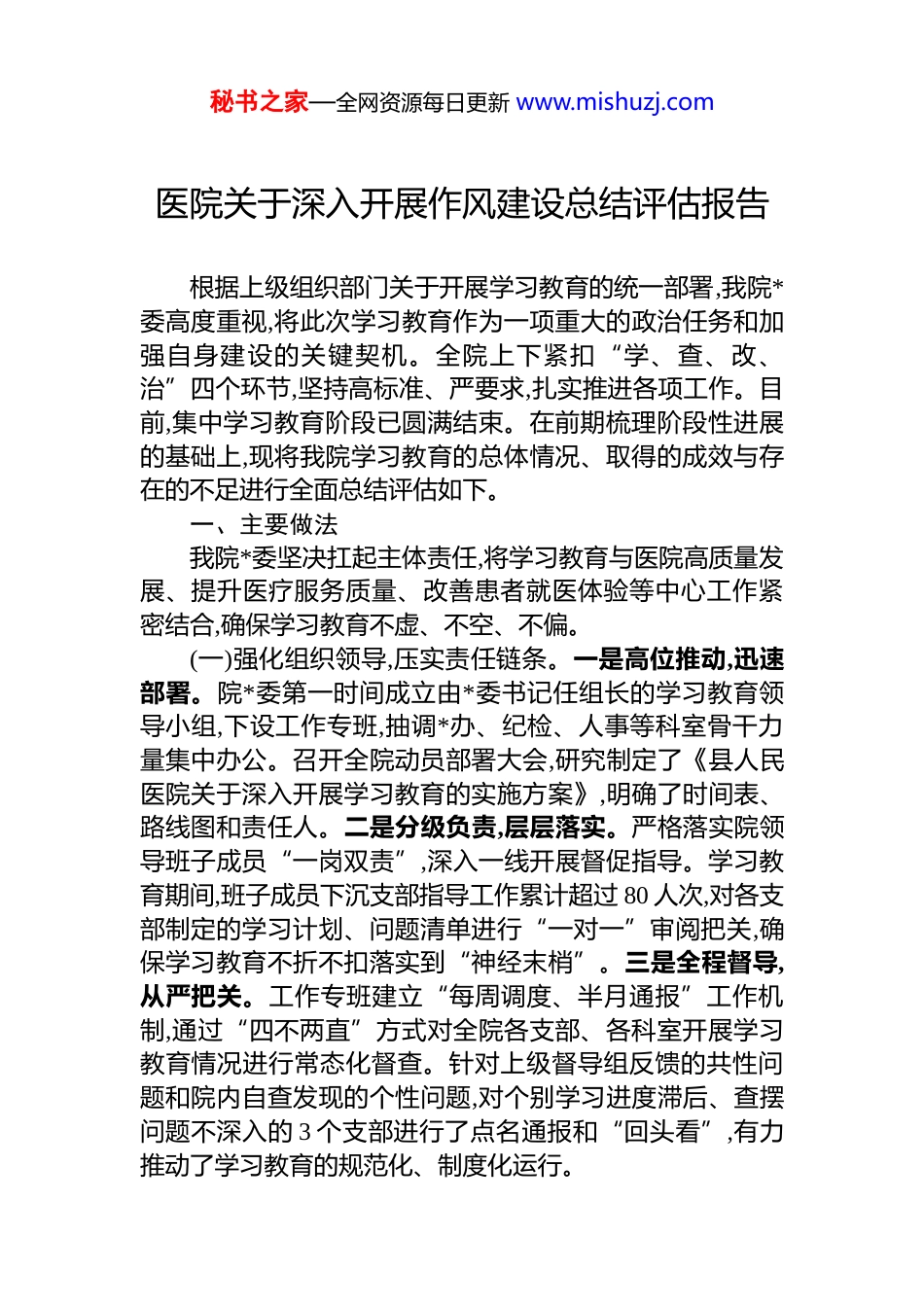 秘书之家—全网资源每日更新 www.mishuzj.com医院关于深入开展作风建设总结评估报告根据上级组织部门关于开展学习教育的统一部署,我院*委高度重视,将此次学习教育作为一项重大的政治任务和加强自身建设的关键契机。全院上下紧扣“学、查、改、治”四个环节,坚持高标准、严要求,扎实推进各项工作。目前,集中学习教育阶段已圆满结束。在前期梳理阶段性进展的基础上,现将我院学习教育的总体情况、取得的成效与存在的不足进行全面总结评估如下。一、主要做法我院*委坚决扛起主体责任,将学习教育与医院高质量发展、提升医疗服务质量、改善患者就医体验等中心工作紧密结合,确保学习教育不虚、不空、不偏。(一)强化组织领导,压实责任链条。一是高位推动,迅速部署。院*委第一时间成立由*委书记任组长的学习教育领导小组,下设工作专班,抽调*办、纪检、人事等科室骨干力量集中办公。召开全院动员部署大会,研究制定了《县人民医院关于深入开展学习教育的实施方案》,明确了时间表、路线图和责任人。二是分级负责,层层落实。严格落实院领导班子成员“一岗双责”,深入一线开展督促指导。学习教育期间,班子成员下沉支部指导工作累计超过 80 人次,对各支部制定的学习计划、问题清单进行“一对一”审阅把关,确保学习教育不折不扣落实到“神经末梢”。三是全程督导,从严把关。工作专班建立“每周调度、半月通报”工作机制,通过“四不两直”方式对全院各支部、各科室开展学习教育情况进行常态化督查。针对上级督导组反馈的共性问题和院内自查发现的个性问题,对个别学习进度滞后、查摆问题不深入的 3 个支部进行了点名通报和“回头看”,有力推动了学习教育的规范化、制度化运行。秘书之家—全网资源每日更新 www.mishuzj.com(二)深化学习研讨,筑牢思想根基。坚持把学习贯穿始终,通过多形式、分层次、全覆盖的学习,引导全院*员干部职工深刻领会纪律规定精神的核心要义和实践要求。一是领导带头,示范引领学。院*委理论学习中心组发挥“领头雁”作用,围绕******关于加强*的作风建设的重要论述、新修订的《中国共产 dj 律处分条例》等内容,举办为期 5 天的专题读书班 1 期,开展集中研讨交流 6 次。*委书记、院长带头讲授专题*课,班子成员结合分管领域工作,深入所在支部与*员干部交流学习体会,形成了“头雁领航、群雁齐飞”的良好学习氛围。二是丰富载体,全面覆盖学。各*支部依托“三会一课”、主题*日等载体,组织*员原原本本、逐字逐句学习规定原文和配套制度。同时,创新学习方式,利用医院内网、微信公众号等线上平台,开设“纪律规定学习角”,每日推送学习要点和相关解读文章。组织开展知识竞赛、演讲比赛等活动,有效激发了学习热情,确保学习教育入脑入心。三是警示教育,触及灵魂学。坚持用身边事教育身边人,组织全院中层及以上干部、重点岗位人员集中观看了《持续发力纵深推进》等警示教育片,并赴市警示教育基地接受现场教育。同时,深刻剖去本地本系统发生的典型案例,特别是针对医疗领域易发多发的违规接受宴请、收受“红包”礼金、公车私用等问题,编印了《典型案例警示录》,组织专题剖析讨论会,让*员干部知敬畏、存戒惧、守底线,从思想深处筑牢拒腐防变的堤坝。(三)聚焦查摆问题,深刻自我剖析。坚持问题导向,以刀刃向内的勇气和自我革命的精神,全面深入查摆作风方面存在的突出问题。一是明确范围,精准画像。对照中央列出的“两个问题清单”、基层“四风”10 种隐形变异新动向以及行业不正之风的具体表现等 50 项内容,组织全院*员干部特别是院领导班子成员、临床医技科室负责人、行政后勤关键岗位人员、近三年新提拔的年轻干部等重点对象,进行全面“政治体检”。。二是拓宽渠道,深挖根源。综合运用秘书之家—全网资源每日更新 www.mishuzj.com上级巡察审计反馈、纪检监察建议、信访举报、患者满意度调查、院内督查、谈心谈话等多种渠道,全方位、多维度收集问题线索。院*委班子成员之间、班子成员与分管科室负责人之间、支部书记与*员之间普遍开展了一轮交心谈心活动。三是严格审核,防止“过关”。院*委对问题清单实行集体会审制度,*委书记对班子成员及科室负责人的问题清单逐一审核签字...