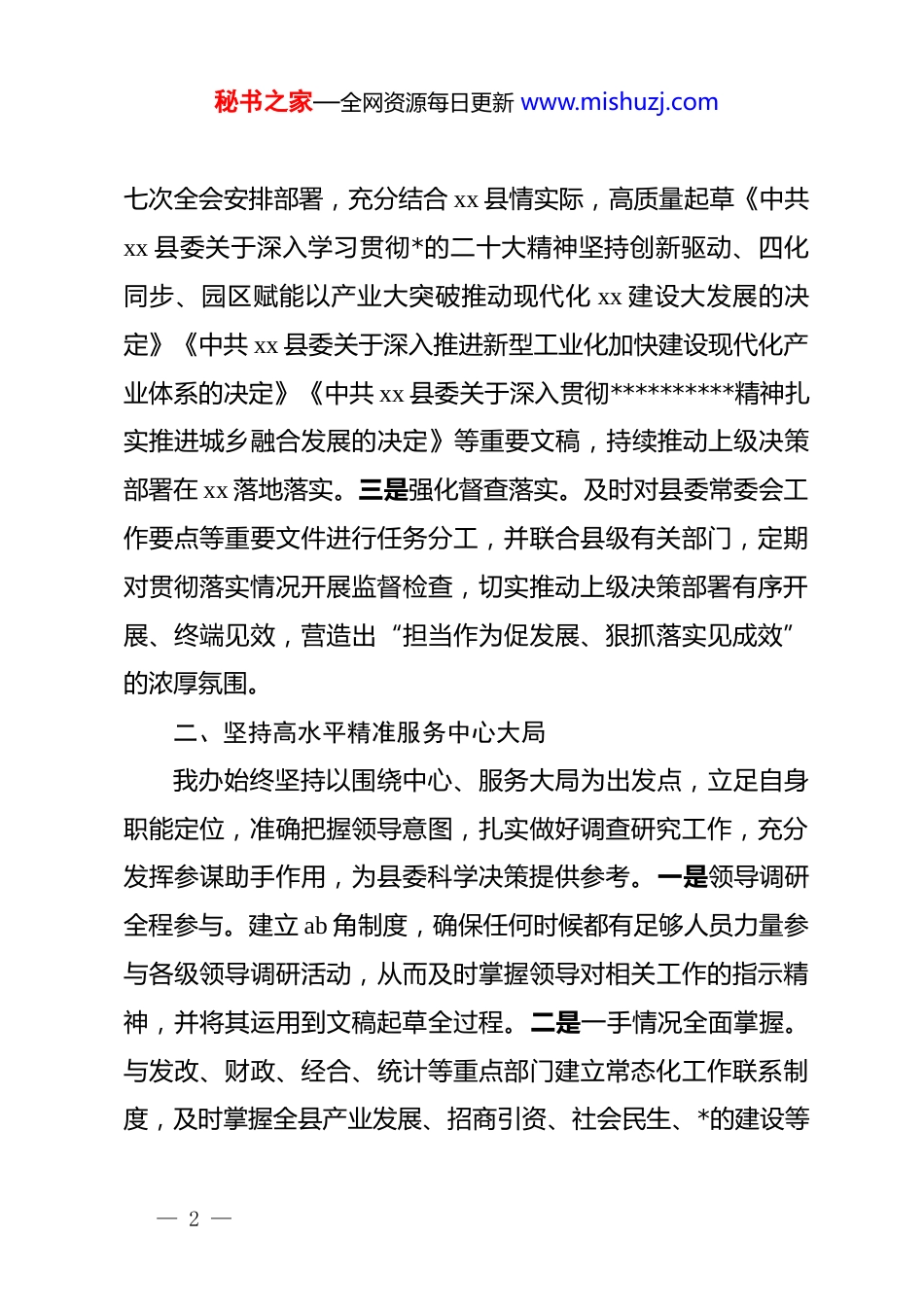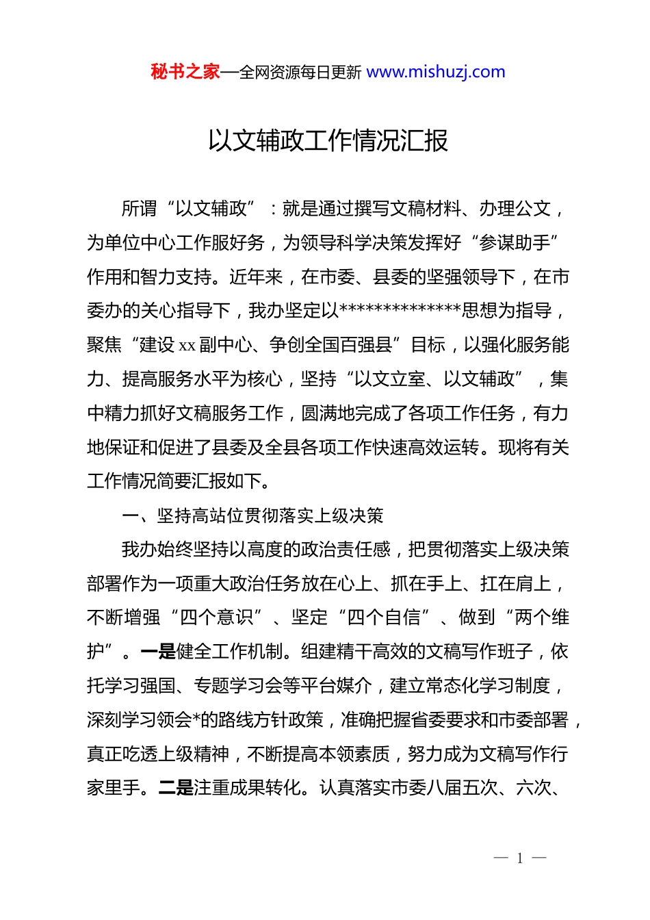 秘书之家—全网资源每日更新 www.mishuzj.com以文辅政工作情况汇报所谓“以文辅政”:就是通过撰写文稿材料、办理公文,为单位中心工作服好务,为领导科学决策发挥好“参谋助手”作用和智力支持。近年来,在市委、县委的坚强领导下,在市委办的关心指导下,我办坚定以**************思想为指导,聚焦“建设 xx 副中心、争创全国百强县”目标,以强化服务能力、提高服务水平为核心,坚持“以文立室、以文辅政”,集中精力抓好文稿服务工作,圆满地完成了各项工作任务,有力地保证和促进了县委及全县各项工作快速高效运转。现将有关工作情况简要汇报如下。一、坚持高站位贯彻落实上级决策我办始终坚持以高度的政治责任感,把贯彻落实上级决策部署作为一项重大政治任务放在心上、抓在手上、扛在肩上,不断增强“四个意识”、坚定“四个自信”、做到“两个维护”。一是健全工作机制。组建精干高效的文稿写作班子,依托学习强国、专题学习会等平台媒介,建立常态化学习制度,深刻学习领会*的路线方针政策,准确把握省委要求和市委部署,真正吃透上级精神,不断提高本领素质,努力成为文稿写作行家里手。二是注重成果转化。认真落实市委八届五次、六次、— 1 —秘书之家—全网资源每日更新 www.mishuzj.com七次全会安排部署,充分结合 xx 县情实际,高质量起草《中共xx 县委关于深入学习贯彻*的二十大精神坚持创新驱动、四化同步、园区赋能以产业大突破推动现代化 xx 建设大发展的决定》《中共 xx 县委关于深入推进新型工业化加快建设现代化产业体系的决定》《中共 xx 县委关于深入贯彻**********精神扎实推进城乡融合发展的决定》等重要文稿,持续推动上级决策部署在 xx 落地落实。三是强化督查落实。及时对县委常委会工作要点等重要文件进行任务分工,并联合县级有关部门,定期对贯彻落实情况开展监督检查,切实推动上级决策部署有序开展、终端见效,营造出“担当作为促发展、狠抓落实见成效”的浓厚氛围。二、坚持高水平精准服务中心大局我办始终坚持以围绕中心、服务大局为出发点,立足自身职能定位,准确把握领导意图,扎实做好调查研究工作,充分发挥参谋助手作用,为县委科学决策提供参考。一是领导调研全程参与。建立 ab 角制度,确保任何时候都有足够人员力量参与各级领导调研活动,从而及时掌握领导对相关工作的指示精神,并将其运用到文稿起草全过程。二是一手情况全面掌握。与发改、财政、经合、统计等重点部门建立常态化工作联系制度,及时掌握全县产业发展、招商引资、社会民生、*的建设等— 2 —秘书之家—全网资源每日更新 www.mishuzj.com各方面情况,分门别类建立材料素材库,为领导决策提供详实可靠的科学依据。三是重点工作全程跟进。深度参与全县重点工作,扎实做好十二届省委第四轮巡视、省级巩固脱贫成果实地考核评估等督查考核的情况汇报起草工作,全方位展示 xx 工作成果。全年共组织开展实地调研活动 20 余次,起草撰写《关于以产业大突破推动现代化 xx 建设大发展的路径研究》《关于推动纺织鞋服产业高质量发展的对策研究——以 xx 县为例》等调研报告 10 余篇。三、坚持高质量撰写文稿推出精品我办始终坚持学通弄懂、学精吃透,不断强化精品意识,以务实之举践行参谋之路,切实做到文稿写作符合文件要求、符合领导要求。一是精心做好综合文稿服务。坚持刻苦钻研、精益求精,准确把握领导意图,充分发挥“以文辅政”职能职责,高质量撰写各类文稿 200 余篇,按时保质整理编发县委常委会会议纪要 47 期,编发《工作通报》12 期,全面参与县委全会、县“两会”、县委经济工作会议、县委农村工作会议等重要会议材料撰写工作,按时按质完成省、市各级领导调研检查汇报材料和县委主要领导各类会议讲话材料,《关于 xx 省首个功能职业装(工装)基地落户我县情况的报告》《关于 xx 蔬菜成功出口香港相关情况的报告》等文稿材料得到市委主要领导— 3 —秘书之家—全网资源每日更新 www.mishuzj.com肯定性批示。二是深入推进政研改革工作。按照省市“清单制+责任制+督考制”要求,制定《改革工作要点》《改革落实台账》...