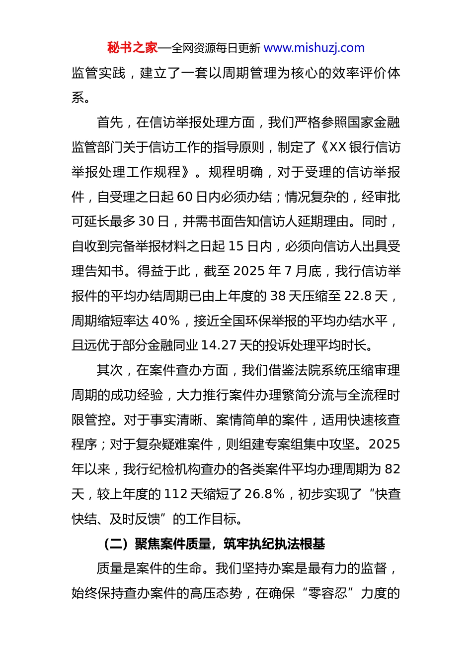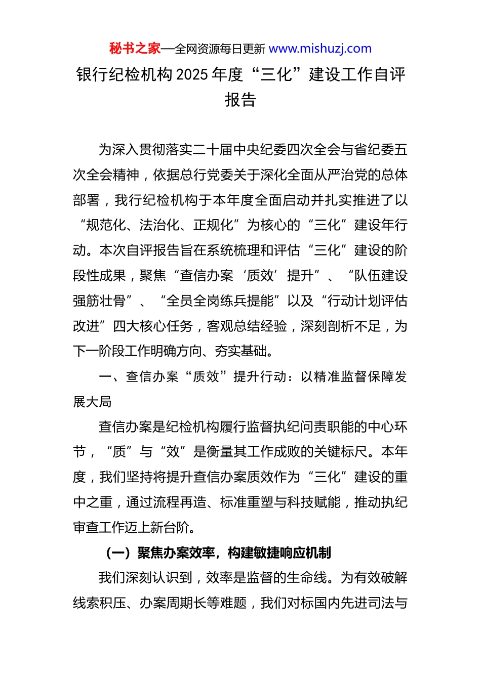 秘书之家—全网资源每日更新 www.mishuzj.com银行纪检机构 2025 年度“三化”建设工作自评报告 为深入贯彻落实二十届中央纪委四次全会与省纪委五次全会精神,依据总行党委关于深化全面从严治党的总体部署,我行纪检机构于本年度全面启动并扎实推进了以“规范化、法治化、正规化”为核心的“三化”建设年行动。本次自评报告旨在系统梳理和评估“三化”建设的阶段性成果,聚焦“查信办案‘质效’提升”、“队伍建设强筋壮骨”、“全员全岗练兵提能”以及“行动计划评估改进”四大核心任务,客观总结经验,深刻剖析不足,为下一阶段工作明确方向、夯实基础。一、查信办案“质效”提升行动:以精准监督保障发展大局查信办案是纪检机构履行监督执纪问责职能的中心环节,“质”与“效”是衡量其工作成败的关键标尺。本年度,我们坚持将提升查信办案质效作为“三化”建设的重中之重,通过流程再造、标准重塑与科技赋能,推动执纪审查工作迈上新台阶。(一)聚焦办案效率,构建敏捷响应机制我们深刻认识到,效率是监督的生命线。为有效破解线索积压、办案周期长等难题,我们对标国内先进司法与秘书之家—全网资源每日更新 www.mishuzj.com监管实践,建立了一套以周期管理为核心的效率评价体系。首先,在信访举报处理方面,我们严格参照国家金融监管部门关于信访工作的指导原则,制定了《XX 银行信访举报处理工作规程》。规程明确,对于受理的信访举报件,自受理之日起 60 日内必须办结;情况复杂的,经审批可延长最多 30 日,并需书面告知信访人延期理由。同时,自收到完备举报材料之日起 15 日内,必须向信访人出具受理告知书。得益于此,截至 2025 年 7 月底,我行信访举报件的平均办结周期已由上年度的 38 天压缩至 22.8 天,周期缩短率达 40%,接近全国环保举报的平均办结水平,且远优于部分金融同业 14.27 天的投诉处理平均时长。其次,在案件查办方面,我们借鉴法院系统压缩审理周期的成功经验,大力推行案件办理繁简分流与全流程时限管控。对于事实清晰、案情简单的案件,适用快速核查程序;对于复杂疑难案件,则组建专案组集中攻坚。2025年以来,我行纪检机构查办的各类案件平均办理周期为 82天,较上年度的 112 天缩短了 26.8%,初步实现了“快查快结、及时反馈”的工作目标。(二)聚焦案件质量,筑牢执纪执法根基质量是案件的生命。我们坚持办案是最有力的监督,始终保持查办案件的高压态势,在确保“零容忍”力度的秘书之家—全网资源每日更新 www.mishuzj.com同时,将法治思维和证据意识贯穿于执纪审查全过程,确保每一起案件都经得起历史和实践的检验。我们引入并改造了检察机关的“案-件比”质量评价指标,建立了内部的“线索-成案-处分比”分析模型,以此评估线索核查的精准度和案件办理的质量。通过该模型,我们能够有效识别线索处置中的薄弱环节,倒逼核查人员提升初核工作的精准性。本年度,我行有效线索成案率同比提升了 8 个百分点,案件办理过程中的程序性瑕疵率同比下降了 60%。我们还特别强化了对关键岗位人员、信贷审批、资产处置等重点领域和突出问题的专项整治力度。通过深化风腐同查同治,不仅严肃查处了多起典型违纪违法案件,更深入剖析了案件背后的制度漏洞和管理缺陷,向相关业务部门发出纪检监察建议书 12 份,推动建立和完善了 30 余项内控制度,真正做到了查处一案、警示一片、治理一域。(三)存在的问题与改进方向尽管质效提升行动取得了一定成效,但我们也清醒地认识到,与新时代金融反腐的要求相比,仍存在差距。主要表现在:一是面对金融创新与业务线上化带来的新型、隐性腐败问题,我们的调查取证手段和专业分析能力仍有待提升;二是案件审理的专业化水平有待加强,特别是在秘书之家—全网资源每日更新 www.mishuzj.com定性量纪的精准度方面,需要进一步深化对党纪法规和国家法律的理解与适用;三是“查”与“治”的衔接还不够顺畅,部分纪检监察建议的整改跟踪问效机制尚未完全形成闭环。二、队伍建设强筋壮骨行动:锻造忠诚干净担当的纪检铁军纪检监察工作是“得罪人”的工作,必须由最忠诚、最干净...