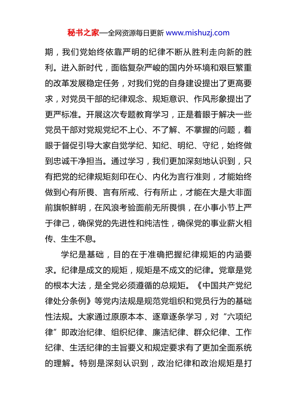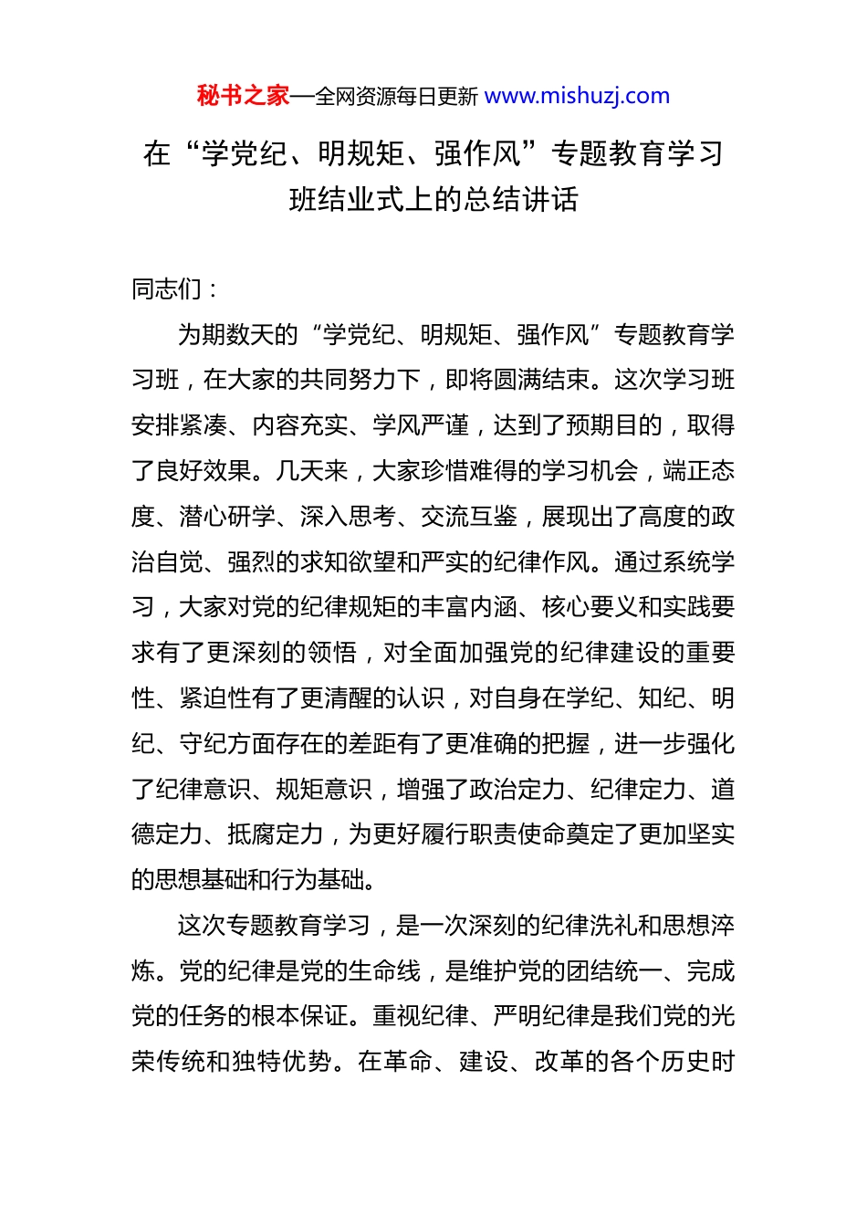 秘书之家—全网资源每日更新 www.mishuzj.com在“学党纪、明规矩、强作风”专题教育学习班结业式上的总结讲话 同志们:为期数天的“学党纪、明规矩、强作风”专题教育学习班,在大家的共同努力下,即将圆满结束。这次学习班安排紧凑、内容充实、学风严谨,达到了预期目的,取得了良好效果。几天来,大家珍惜难得的学习机会,端正态度、潜心研学、深入思考、交流互鉴,展现出了高度的政治自觉、强烈的求知欲望和严实的纪律作风。通过系统学习,大家对党的纪律规矩的丰富内涵、核心要义和实践要求有了更深刻的领悟,对全面加强党的纪律建设的重要性、紧迫性有了更清醒的认识,对自身在学纪、知纪、明纪、守纪方面存在的差距有了更准确的把握,进一步强化了纪律意识、规矩意识,增强了政治定力、纪律定力、道德定力、抵腐定力,为更好履行职责使命奠定了更加坚实的思想基础和行为基础。这次专题教育学习,是一次深刻的纪律洗礼和思想淬炼。党的纪律是党的生命线,是维护党的团结统一、完成党的任务的根本保证。重视纪律、严明纪律是我们党的光荣传统和独特优势。在革命、建设、改革的各个历史时秘书之家—全网资源每日更新 www.mishuzj.com期,我们党始终依靠严明的纪律不断从胜利走向新的胜利。进入新时代,面临复杂严峻的国内外环境和艰巨繁重的改革发展稳定任务,对我们党的自身建设提出了更高要求,对党员干部的纪律观念、规矩意识、作风形象提出了更严标准。开展这次专题教育学习,正是着眼于解决一些党员干部对党规党纪不上心、不了解、不掌握的问题,着眼于督促引导大家自觉学纪、知纪、明纪、守纪,始终做到忠诚干净担当。通过学习,我们更加深刻地认识到,只有把党的纪律规矩刻印在心、内化为言行准则,才能始终做到心有所畏、言有所戒、行有所止,才能在大是大非面前旗帜鲜明,在风浪考验面前无所畏惧,在小事小节上严于律己,确保党的先进性和纯洁性,确保党的事业薪火相传、生生不息。学纪是基础,目的在于准确把握纪律规矩的内涵要求。纪律是成文的规矩,规矩是不成文的纪律。党章是党的根本大法,是全党必须遵循的总规矩。《中国共产党纪律处分条例》等党内法规是规范党组织和党员行为的基础性法规。大家通过原原本本、逐章逐条学习,对“六项纪律”即政治纪律、组织纪律、廉洁纪律、群众纪律、工作纪律、生活纪律的主旨要义和规定要求有了更加全面系统的理解。特别是深刻认识到,政治纪律和政治规矩是打秘书之家—全网资源每日更新 www.mishuzj.com头、管总的纪律,是最重要、最根本、最关键的纪律,遵守党的政治纪律是遵守党的全部纪律的基础。必须旗帜鲜明讲政治,深刻领悟“两个确立”的决定性意义,坚决做到“两个维护”,始终在政治立场、政治方向、政治原则、政治道路上同党中央保持高度一致,决不允许自行其是、阳奉阴违,决不允许搞小山头、小圈子、小团伙,确保党的路线方针政策不折不扣得到贯彻执行。知纪是前提,目的在于牢固树立纪律规矩的权威意识。知其然,更要知其所以然。学习党纪不能仅仅停留在记住条文上,更要弄明白能干什么、不能干什么,搞清楚这些规定的背后体现的是我们党的性质宗旨、理想信念、方针政策,是为了维护什么、防止什么、惩戒什么。通过学习研讨和案例剖析,大家更加清晰地认识到,党的纪律既是“紧箍咒”,更是“护身符”,是对党员干部的严格约束,更是对党员干部的关心爱护。只有真正知纪,才能敬畏纪律、尊崇纪律,才能把遵守纪律规矩视为一种责任、一种境界、一种习惯,才能时刻感受到纪律的约束和保护,避免在纷繁复杂的形势和诱惑面前迷失方向、滑入深渊。要深刻理解严管和厚爱的辩证统一关系,自觉接受组织管理和纪律约束,习惯在受监督和约束的环境中工作生活。秘书之家—全网资源每日更新 www.mishuzj.com明纪是关键,目的在于明确言行举止的衡量标尺。明纪,就是要明确纪律的边界和底线,清楚哪些是允许的、哪些是禁止的,哪些是必须做的、哪些是决不能做的。这就要求我们必须时刻用党纪这把尺子衡量自己的言行,做到公私分明、秉公用权,做到清正廉洁、一身正气。要牢固树立正确的权力观、地位观、利益观,任何时...