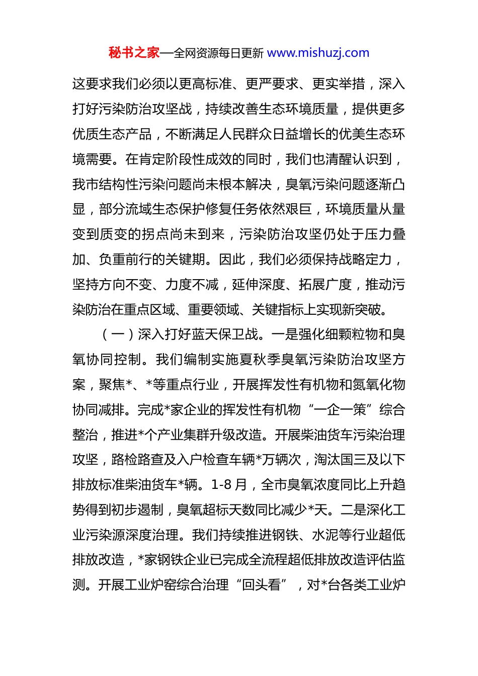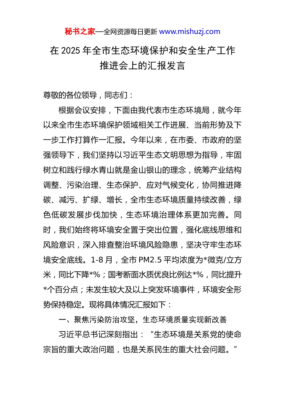 秘书之家—全网资源每日更新 www.mishuzj.com在 2025 年全市生态环境保护和安全生产工作推进会上的汇报发言 尊敬的各位领导,同志们:根据会议安排,下面由我代表市生态环境局,就今年以来全市生态环境保护领域相关工作进展、当前形势及下一步工作打算作一汇报。今年以来,在市委、市政府的坚强领导下,我们坚持以习近平生态文明思想为指导,牢固树立和践行绿水青山就是金山银山的理念,统筹产业结构调整、污染治理、生态保护、应对气候变化,协同推进降碳、减污、扩绿、增长,全市生态环境质量持续改善,绿色低碳发展步伐加快,生态环境治理体系更加完善。同时,我们始终将环境安全置于突出位置,强化底线思维和风险意识,深入排查整治环境风险隐患,坚决守牢生态环境安全底线。1-8 月,全市 PM2.5 平均浓度为*微克/立方米,同比下降*%;国考断面水质优良比例达*%,同比提升*个百分点;未发生较大及以上突发环境事件,环境安全形势保持稳定。现将具体情况汇报如下:一、聚焦污染防治攻坚,生态环境质量实现新改善习近平总书记深刻指出:“生态环境是关系党的使命宗旨的重大政治问题,也是关系民生的重大社会问题。”秘书之家—全网资源每日更新 www.mishuzj.com这要求我们必须以更高标准、更严要求、更实举措,深入打好污染防治攻坚战,持续改善生态环境质量,提供更多优质生态产品,不断满足人民群众日益增长的优美生态环境需要。在肯定阶段性成效的同时,我们也清醒认识到,我市结构性污染问题尚未根本解决,臭氧污染问题逐渐凸显,部分流域生态保护修复任务依然艰巨,环境质量从量变到质变的拐点尚未到来,污染防治攻坚仍处于压力叠加、负重前行的关键期。因此,我们必须保持战略定力,坚持方向不变、力度不减,延伸深度、拓展广度,推动污染防治在重点区域、重要领域、关键指标上实现新突破。(一)深入打好蓝天保卫战。一是强化细颗粒物和臭氧协同控制。我们编制实施夏秋季臭氧污染防治攻坚方案,聚焦*、*等重点行业,开展挥发性有机物和氮氧化物协同减排。完成*家企业的挥发性有机物“一企一策”综合整治,推进*个产业集群升级改造。开展柴油货车污染治理攻坚,路检路查及入户检查车辆*万辆次,淘汰国三及以下排放标准柴油货车*辆。1-8 月,全市臭氧浓度同比上升趋势得到初步遏制,臭氧超标天数同比减少*天。二是深化工业污染源深度治理。我们持续推进钢铁、水泥等行业超低排放改造,*家钢铁企业已完成全流程超低排放改造评估监测。开展工业炉窑综合治理“回头看”,对*台各类工业炉秘书之家—全网资源每日更新 www.mishuzj.com窑实施升级改造。强化重点行业绩效分级管理,评定 A级、B 级和引领性企业*家,推动行业整体治理水平提升。三是加强面源污染精细化管控。我们强化施工扬尘管控,利用无人机、视频监控等科技手段巡查工地*个(次),处罚扬尘污染问题*起。开展餐饮油烟专项整治行动,检查餐饮企业*家,督促安装并正常使用高效油烟净化设施。加强秸秆禁烧管控,通过卫星遥感、无人机巡查等手段,发现并处置火点*个,火点数量同比下降*%。(二)着力打好碧水保卫战。一是持续提升水环境治理效能。我们开展入河排污口排查整治专项行动,累计排查各类排污口*个,完成规范化整治*个。推进工业园区水污染整治,*个省级及以上工业园区均实现污水集中处理。加强饮用水水源地保护,完成*个“千吨万人”水源地保护区划定及环境问题整治,县级以上集中式饮用水水源地水质达标率保持 100%。二是大力推进水生态保护修复。我们实施重点流域水生态调查评估,在*河、*湖等流域布设监测点位*个,初步建立水生态监测指标体系。推进河湖缓冲带建设与修复,完成生态修复长度*公里。开展水生植被恢复试点,种植沉水、挺水植物*亩,水体自净能力得到增强。三是强化水资源节约集约利用。我们会同相关部门加强重点用水户监管,对*家重点企业开展节水诊断,推动企秘书之家—全网资源每日更新 www.mishuzj.com业中水回用,全市万元工业增加值用水量同比下降*%。加强区域再生水循环利用,推动*污水处理厂提标改造,尾水水质主要指标达到地表水 IV 类标准,用于城市杂用和生态补...
