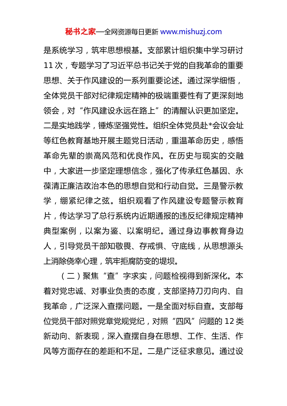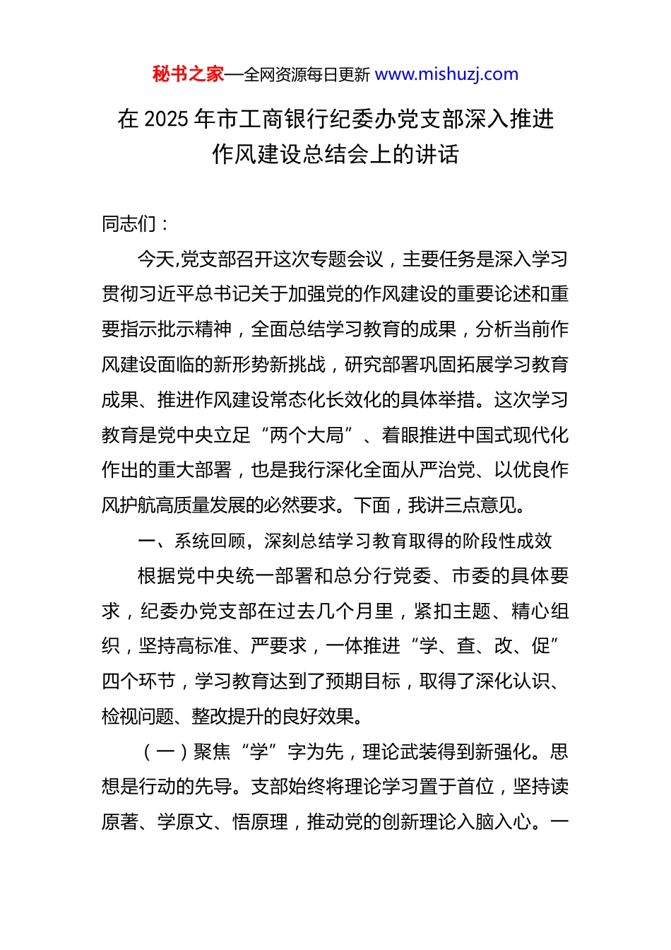 秘书之家—全网资源每日更新 www.mishuzj.com在 2025 年市工商银行纪委办党支部深入推进作风建设总结会上的讲话 同志们:今天,党支部召开这次专题会议,主要任务是深入学习贯彻习近平总书记关于加强党的作风建设的重要论述和重要指示批示精神,全面总结学习教育的成果,分析当前作风建设面临的新形势新挑战,研究部署巩固拓展学习教育成果、推进作风建设常态化长效化的具体举措。这次学习教育是党中央立足“两个大局”、着眼推进中国式现代化作出的重大部署,也是我行深化全面从严治党、以优良作风护航高质量发展的必然要求。下面,我讲三点意见。一、系统回顾,深刻总结学习教育取得的阶段性成效根据党中央统一部署和总分行党委、市委的具体要求,纪委办党支部在过去几个月里,紧扣主题、精心组织,坚持高标准、严要求,一体推进“学、查、改、促”四个环节,学习教育达到了预期目标,取得了深化认识、检视问题、整改提升的良好效果。(一)聚焦“学”字为先,理论武装得到新强化。思想是行动的先导。支部始终将理论学习置于首位,坚持读原著、学原文、悟原理,推动党的创新理论入脑入心。一秘书之家—全网资源每日更新 www.mishuzj.com是系统学习,筑牢思想根基。支部累计组织集中学习研讨11 次,专题学习了习近平总书记关于党的自我革命的重要思想、关于作风建设的一系列重要论述。通过深学细悟,全体党员干部对纪律规定精神的极端重要性有了更深刻地领会,对“作风建设永远在路上”的清醒认识更加坚定。二是实地践学,锤炼坚强党性。组织全体党员赴*会议会址等红色教育基地开展主题党日活动,重温革命历史,感悟革命先辈的崇高风范和优良作风。在历史与现实的交融中,大家进一步坚定理想信念,强化了传承红色基因、永葆清正廉洁政治本色的思想自觉和行动自觉。三是警示教学,绷紧纪律之弦。组织观看了作风建设专题警示教育片,传达学习了总行系统内近期通报的违反纪律规定精神典型案例,以案为鉴、以案明纪。通过身边事教育身边人,引导党员干部知敬畏、存戒惧、守底线,从思想源头上消除侥幸心理,筑牢拒腐防变的堤坝。(二)聚焦“查”字求实,问题检视得到新深化。本着对党忠诚、对事业负责的态度,支部坚持刀刃向内、自我革命,广泛深入查摆问题。一是全面对标自查。支部每位党员干部对照党章党规党纪,对照“四风”问题的 12 类新动向、新表现,深入查摆自身在思想、工作、生活、作风等方面存在的差距和不足。二是广泛征求意见。通过设秘书之家—全网资源每日更新 www.mishuzj.com置线上“我要说”信箱、召开座谈会、个别访谈等多种形式,主动向业务部门、基层网点和服务对象征求意见建议,把问题找准、把根源挖深。此次学习教育,党支部共计查摆梳理出 3 大类 18 个具体问题,主要集中在文山会海精简不够彻底、调查研究深入基层一线不够、服务群众和基层的主动性有待加强等方面。三是深刻剖析根源。针对查摆出的问题,党支部召开了专题组织生活会,严肃认真开展批评和自我批评,从政治站位、宗旨意识、党性修养等方面深挖问题根源,明确了整改方向。(三)聚焦“改”字动真,顽瘴痼疾得到新整治。坚持把“改”字贯穿始终,做到即知即改、立行立改、真改实改。一是建立整改台账。针对查摆出的问题和征求到的意见,制定了详细的整改方案,建立了问题清单、责任清单、任务清单“三张清单”,明确了整改措施、责任人和完成时限,实行挂图作战、销号管理,确保件件有着落、事事有回音。二是开展专项整治。聚焦形式主义、官僚主义突出问题,对行内发文、会议数量和时长进行了严格控制,2025 年上半年同比分别压降 15%和 20%。同时,针对基层反映的“指尖上的形式主义”问题,对非必要的移动办公应用进行了清理整合。三是强化监督问责。纪委办作为专责监督部门,不仅带头整改,更履行监督职责,对秘书之家—全网资源每日更新 www.mishuzj.com全行作风建设情况开展专项督查,对发现的苗头性、倾向性问题及时提醒,对顶风违纪行为坚持“零容忍”,持续释放一抓到底、一严到底的强烈信号。(四)聚焦“促”字求效,长效机制得到新构建。注重标本兼治,把学习教育中...
