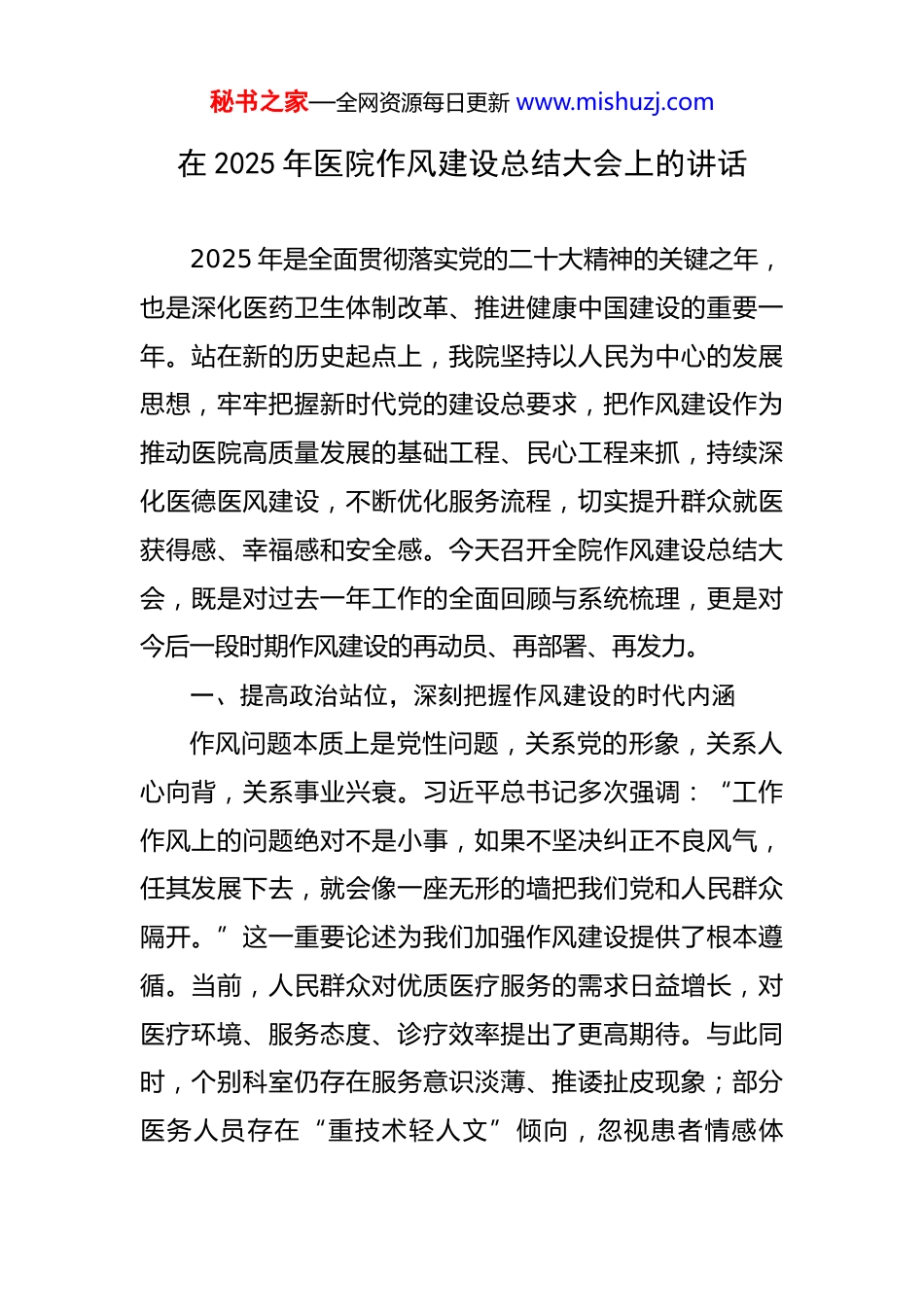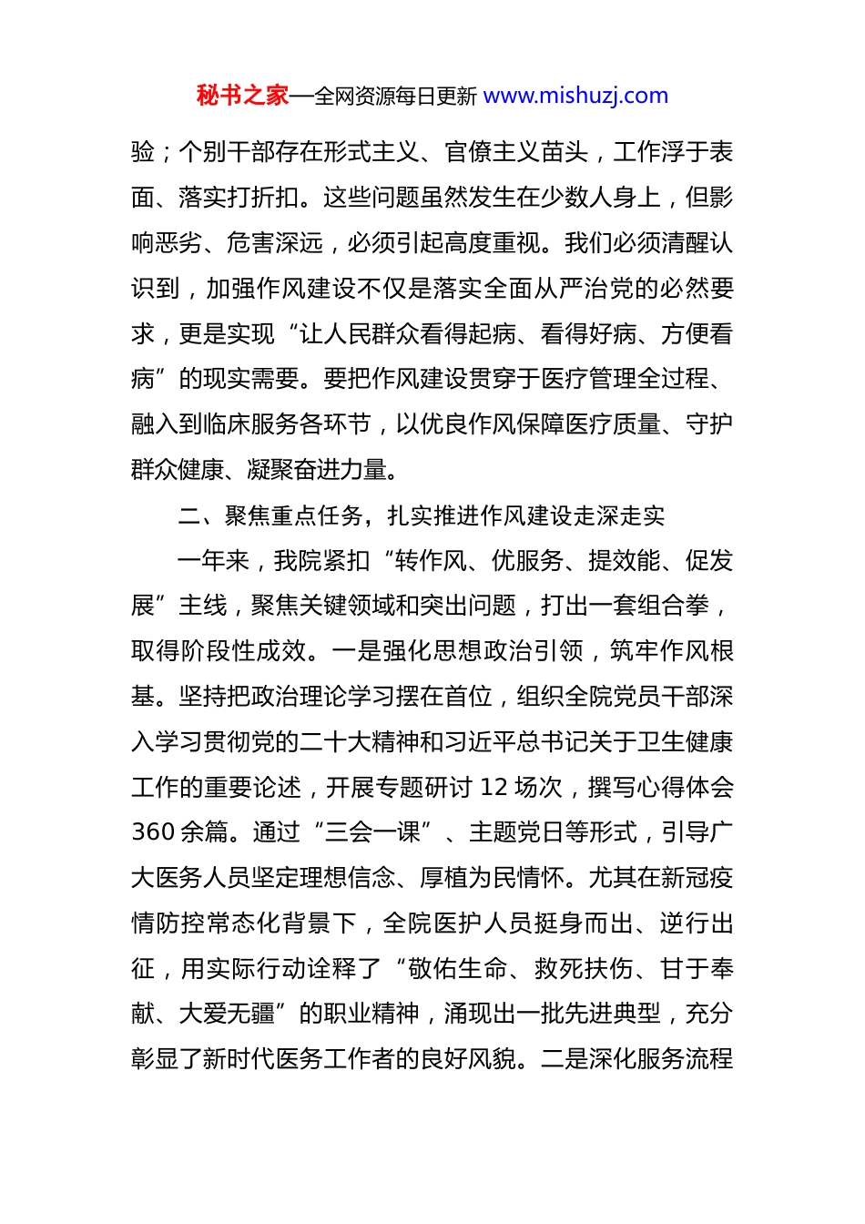 秘书之家—全网资源每日更新 www.mishuzj.com在 2025 年医院作风建设总结大会上的讲话 2025 年是全面贯彻落实党的二十大精神的关键之年,也是深化医药卫生体制改革、推进健康中国建设的重要一年。站在新的历史起点上,我院坚持以人民为中心的发展思想,牢牢把握新时代党的建设总要求,把作风建设作为推动医院高质量发展的基础工程、民心工程来抓,持续深化医德医风建设,不断优化服务流程,切实提升群众就医获得感、幸福感和安全感。今天召开全院作风建设总结大会,既是对过去一年工作的全面回顾与系统梳理,更是对今后一段时期作风建设的再动员、再部署、再发力。一、提高政治站位,深刻把握作风建设的时代内涵作风问题本质上是党性问题,关系党的形象,关系人心向背,关系事业兴衰。习近平总书记多次强调:“工作作风上的问题绝对不是小事,如果不坚决纠正不良风气,任其发展下去,就会像一座无形的墙把我们党和人民群众隔开。”这一重要论述为我们加强作风建设提供了根本遵循。当前,人民群众对优质医疗服务的需求日益增长,对医疗环境、服务态度、诊疗效率提出了更高期待。与此同时,个别科室仍存在服务意识淡薄、推诿扯皮现象;部分医务人员存在“重技术轻人文”倾向,忽视患者情感体秘书之家—全网资源每日更新 www.mishuzj.com验;个别干部存在形式主义、官僚主义苗头,工作浮于表面、落实打折扣。这些问题虽然发生在少数人身上,但影响恶劣、危害深远,必须引起高度重视。我们必须清醒认识到,加强作风建设不仅是落实全面从严治党的必然要求,更是实现“让人民群众看得起病、看得好病、方便看病”的现实需要。要把作风建设贯穿于医疗管理全过程、融入到临床服务各环节,以优良作风保障医疗质量、守护群众健康、凝聚奋进力量。二、聚焦重点任务,扎实推进作风建设走深走实一年来,我院紧扣“转作风、优服务、提效能、促发展”主线,聚焦关键领域和突出问题,打出一套组合拳,取得阶段性成效。一是强化思想政治引领,筑牢作风根基。坚持把政治理论学习摆在首位,组织全院党员干部深入学习贯彻党的二十大精神和习近平总书记关于卫生健康工作的重要论述,开展专题研讨 12 场次,撰写心得体会360 余篇。通过“三会一课”、主题党日等形式,引导广大医务人员坚定理想信念、厚植为民情怀。尤其在新冠疫情防控常态化背景下,全院医护人员挺身而出、逆行出征,用实际行动诠释了“敬佑生命、救死扶伤、甘于奉献、大爱无疆”的职业精神,涌现出一批先进典型,充分彰显了新时代医务工作者的良好风貌。二是深化服务流程秘书之家—全网资源每日更新 www.mishuzj.com再造,提升就医体验。针对群众反映强烈的“挂号难、排队久、跑路多”等问题,持续推进智慧医院建设。全年新增自助缴费终端 8 台,推广“掌上医院”App 功能,实现检查预约、报告查询、费用支付“一站式”办理;优化门诊导诊流程,在候诊区设置智能导引屏,配备志愿者引导,有效缓解高峰期拥堵现象。截至 2025 年 6 月,门诊平均等候时间较上年缩短 40%,患者满意度达 97.6%,创历史新高。三是严查不正之风,营造清朗生态。开展“整治医疗领域不正之风专项行动”,重点查处收受红包、过度检查、不合理用药、虚假宣传等违规行为。全年共受理投诉举报线索 47 件,核实处理违纪人员 12 人,其中给予党纪政务处分 6 人,通报批评 11 人次,追缴违规资金共计18.7 万元。同时,建立“医德档案”制度,将医务人员执业行为纳入信用管理体系,实行“一票否决”机制,切实增强纪律约束力。四是健全长效机制,推动常态长效。制定《关于进一步加强医院作风建设的实施意见》,明确“五个严禁”:严禁冷硬横推、严禁推诿塞责、严禁吃拿卡要、严禁滥用职权、严禁弄虚作假。出台《首问负责制实施细则》《限时办结制管理办法》《投诉处理工作规范》等配套制度 11 项,形成权责清晰、运行高效、监督有力的工作闭环。设立“院长信箱”“行风监督热线”,开秘书之家—全网资源每日更新 www.mishuzj.com通线上意见征集平台,畅通群众诉求表达渠道,全年收到意见建议 236 条,办结率 100%。五是选树先进典型,发...