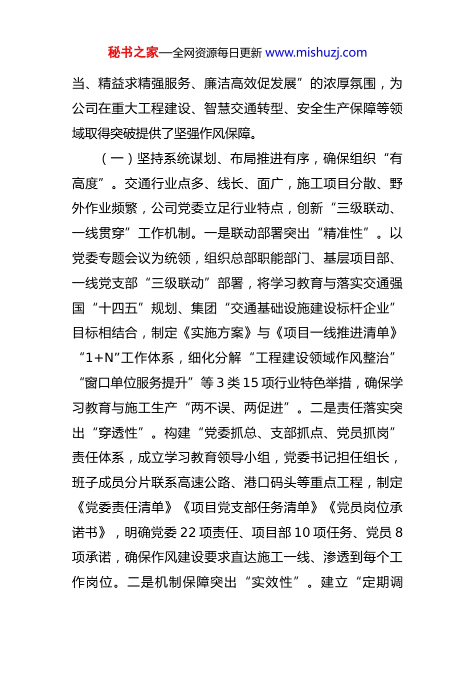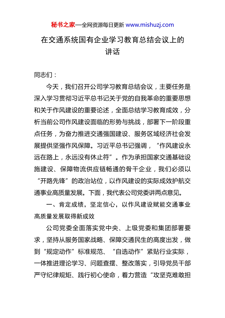秘书之家—全网资源每日更新 www.mishuzj.com在交通系统国有企业学习教育总结会议上的讲话 同志们:今天,我们召开公司学习教育总结会议,主要任务是深入学习贯彻习近平总书记关于党的自我革命的重要思想和关于作风建设的重要论述,全面总结学习教育成效,分析当前公司作风建设面临的形势与挑战,部署下一阶段重点任务,为奋力推进交通强国建设、服务区域经济社会发展提供坚强作风保障。习近平总书记强调,“作风建设永远在路上,永远没有休止符”。作为承担国家交通基础设施建设、保障物流供应链畅通的骨干企业,我们必须以“开路先锋”的政治站位,以作风建设的实际成效护航交通事业高质量发展。下面,我代表公司党委讲两点意见。一、肯定成绩,坚定信心,以作风建设赋能交通事业高质量发展取得新成效公司党委全面落实党中央、上级党委和集团部署要求,坚持从服务国家战略、保障交通民生的高度出发,做到“规定动作”标准规范、“自选动作”紧贴行业实际,一体推进理论学习、问题查摆、整改落实,引导党员干部严守纪律规矩、践行初心使命,着力营造“攻坚克难敢担秘书之家—全网资源每日更新 www.mishuzj.com当、精益求精强服务、廉洁高效促发展”的浓厚氛围,为公司在重大工程建设、智慧交通转型、安全生产保障等领域取得突破提供了坚强作风保障。(一)坚持系统谋划、布局推进有序,确保组织“有高度”。交通行业点多、线长、面广,施工项目分散、野外作业频繁,公司党委立足行业特点,创新“三级联动、一线贯穿”工作机制。一是联动部署突出“精准性”。以党委专题会议为统领,组织总部职能部门、基层项目部、一线党支部“三级联动”部署,将学习教育与落实交通强国“十四五”规划、集团“交通基础设施建设标杆企业”目标相结合,制定《实施方案》与《项目一线推进清单》“1+N”工作体系,细化分解“工程建设领域作风整治”“窗口单位服务提升”等 3 类 15 项行业特色举措,确保学习教育与施工生产“两不误、两促进”。二是责任落实突出“穿透性”。构建“党委抓总、支部抓点、党员抓岗”责任体系,成立学习教育领导小组,党委书记担任组长,班子成员分片联系高速公路、港口码头等重点工程,制定《党委责任清单》《项目党支部任务清单》《党员岗位承诺书》,明确党委 22 项责任、项目部 10 项任务、党员 8项承诺,确保作风建设要求直达施工一线、渗透到每个工作岗位。二是机制保障突出“实效性”。建立“定期调秘书之家—全网资源每日更新 www.mishuzj.com度、一线督导、动态反馈”工作机制,编制《学习教育运行大表》,将理论学习、问题查摆与工程进度、安全生产、质量管控同部署、同检查。学习教育开展以来,领导小组深入跨海大桥、智慧物流园区等 12 个重点项目现场督导 18 次,发布《项目作风建设提醒函》7 期,确保学习教育不走过场、取得实效。(二)坚持贯通领会、强化思想铸魂,实现学习“有深度”。立足交通行业“逢山开路、遇水架桥”的奋斗精神,公司党委创新学习载体,推动理论学习与行业实践深度融合。一是“第一议题”领学强信念。通过党委(扩大)会、理论学习中心组学习等方式,专题学习习近平总书记关于交通强国建设的重要论述 15 次,围绕“打造人民满意交通”“建设平安百年品质工程”等主题开展集中研讨 6 次,形成《智慧交通转型实施方案》《绿色施工技术推广清单》等实践成果 12 项。二是“一线课堂”研学促转化。针对项目党员分散特点,开设“工地党课”“移动课堂”,组织党员在施工便道、拌合站、预制场等现场,结合“工匠精神”“劳模事迹”,开展学习讨论 32 场,编发《交通行业作风建设案例集》,用“身边人、身边事”增强学习感染力。三是“线上平台”助学全覆盖。依托公司“智慧党建”APP,开设“八项规定精神学习专栏”,推送秘书之家—全网资源每日更新 www.mishuzj.com《交通行业作风建设负面清单》《工程建设领域廉洁风险防控指南》等学习资料 45 期,针对海外项目党员、出差人员,通过“云端支部会”“视频微党课”等方式实现学习教育全覆盖,确保“施工不停、学习不断”。(三)坚持从严把握、聚集突出问题...