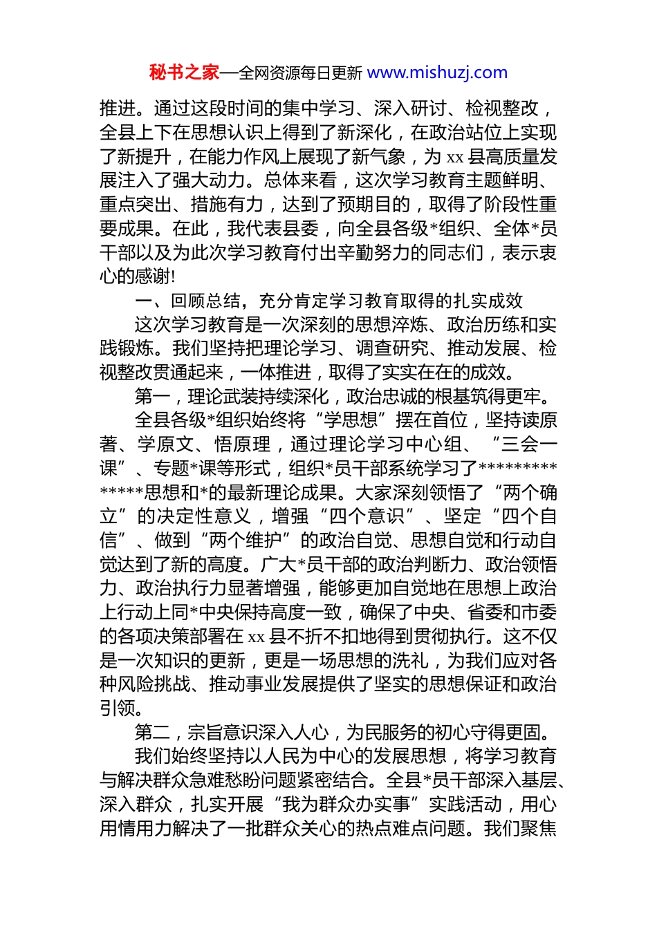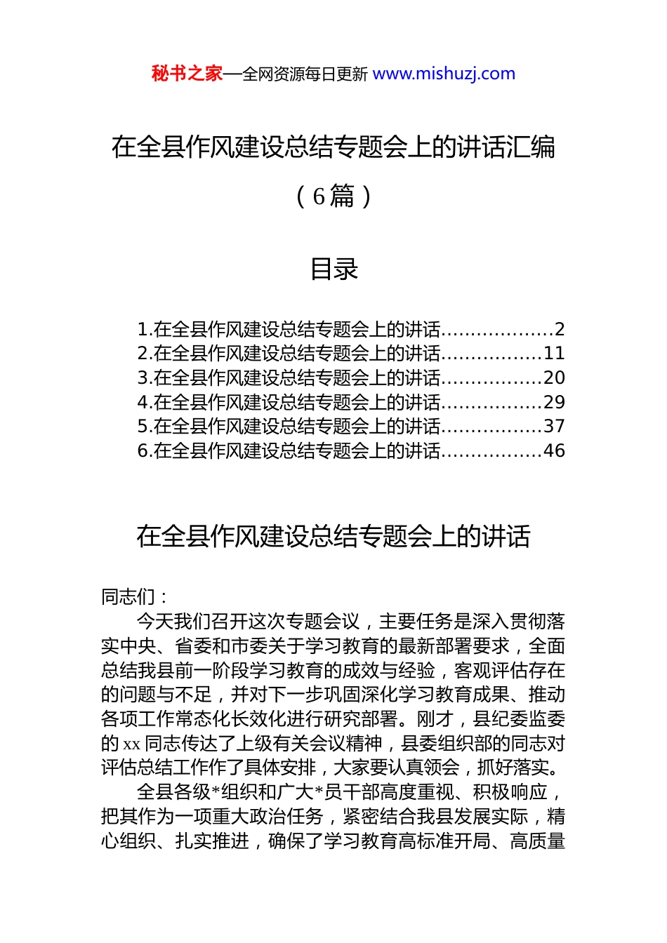 秘书之家—全网资源每日更新 www.mishuzj.com在全县作风建设总结专题会上的讲话汇编(6 篇)目录1.在全县作风建设总结专题会上的讲话...................22.在全县作风建设总结专题会上的讲话.................113.在全县作风建设总结专题会上的讲话.................204.在全县作风建设总结专题会上的讲话.................295.在全县作风建设总结专题会上的讲话.................376.在全县作风建设总结专题会上的讲话.................46在全县作风建设总结专题会上的讲话同志们:今天我们召开这次专题会议,主要任务是深入贯彻落实中央、省委和市委关于学习教育的最新部署要求,全面总结我县前一阶段学习教育的成效与经验,客观评估存在的问题与不足,并对下一步巩固深化学习教育成果、推动各项工作常态化长效化进行研究部署。刚才,县纪委监委的 xx 同志传达了上级有关会议精神,县委组织部的同志对评估总结工作作了具体安排,大家要认真领会,抓好落实。全县各级*组织和广大*员干部高度重视、积极响应,把其作为一项重大政治任务,紧密结合我县发展实际,精心组织、扎实推进,确保了学习教育高标准开局、高质量秘书之家—全网资源每日更新 www.mishuzj.com推进。通过这段时间的集中学习、深入研讨、检视整改,全县上下在思想认识上得到了新深化,在政治站位上实现了新提升,在能力作风上展现了新气象,为 xx 县高质量发展注入了强大动力。总体来看,这次学习教育主题鲜明、重点突出、措施有力,达到了预期目的,取得了阶段性重要成果。在此,我代表县委,向全县各级*组织、全体*员干部以及为此次学习教育付出辛勤努力的同志们,表示衷心的感谢!一、回顾总结,充分肯定学习教育取得的扎实成效这次学习教育是一次深刻的思想淬炼、政治历练和实践锻炼。我们坚持把理论学习、调查研究、推动发展、检视整改贯通起来,一体推进,取得了实实在在的成效。第一,理论武装持续深化,政治忠诚的根基筑得更牢。全县各级*组织始终将“学思想”摆在首位,坚持读原著、学原文、悟原理,通过理论学习中心组、“三会一课”、专题*课等形式,组织*员干部系统学习了**************思想和*的最新理论成果。大家深刻领悟了“两个确立”的决定性意义,增强“四个意识”、坚定“四个自信”、做到“两个维护”的政治自觉、思想自觉和行动自觉达到了新的高度。广大*员干部的政治判断力、政治领悟力、政治执行力显著增强,能够更加自觉地在思想上政治上行动上同*中央保持高度一致,确保了中央、省委和市委的各项决策部署在 xx 县不折不扣地得到贯彻执行。这不仅是一次知识的更新,更是一场思想的洗礼,为我们应对各种风险挑战、推动事业发展提供了坚实的思想保证和政治引领。第二,宗旨意识深入人心,为民服务的初心守得更固。我们始终坚持以人民为中心的发展思想,将学习教育与解决群众急难愁盼问题紧密结合。全县*员干部深入基层、深入群众,扎实开展“我为群众办实事”实践活动,用心用情用力解决了一批群众关心的热点难点问题。我们聚焦秘书之家—全网资源每日更新 www.mishuzj.com民生福祉,持续加大投入解决群众困难。通过这些看得见摸得着的实事,*心民心贴得更紧,干群关系更加融洽,人民群众的获得感、幸福感、安全感得到了实实在在的提升。第三,担当精神充分彰显,高质量发展的步伐迈得更稳。我们将学习教育的成果转化为推动发展的强大动力,引导广大干部在经济建设主战场上担当作为、建功立业。面对复杂严峻的外部环境和艰巨繁重的发展任务,我们坚持稳中求进工作总基调,推动全县经济保持了稳定增长的良好态势。产业转型升级步伐加快,我们围绕汽车零部件等主导产业,着力打造产业集聚平台,产业链的韧性和竞争力不断增强。我们积极拥抱数字经济,推动传统产业与数字化深度融合,培育了一批新的经济增长点。全县上下形成了“大抓项目、抓大项目”的浓厚氛围,广大干部在项目建设、征地拆迁、服务企业的第一线展现了过硬的作风和能力,推动了一批重点项目早落地、早投产、早见效。第四,作风建设向纵深推进,风清气正的生态育得更优。我们以学习教育为契机,驰而不息纠治“四风”...