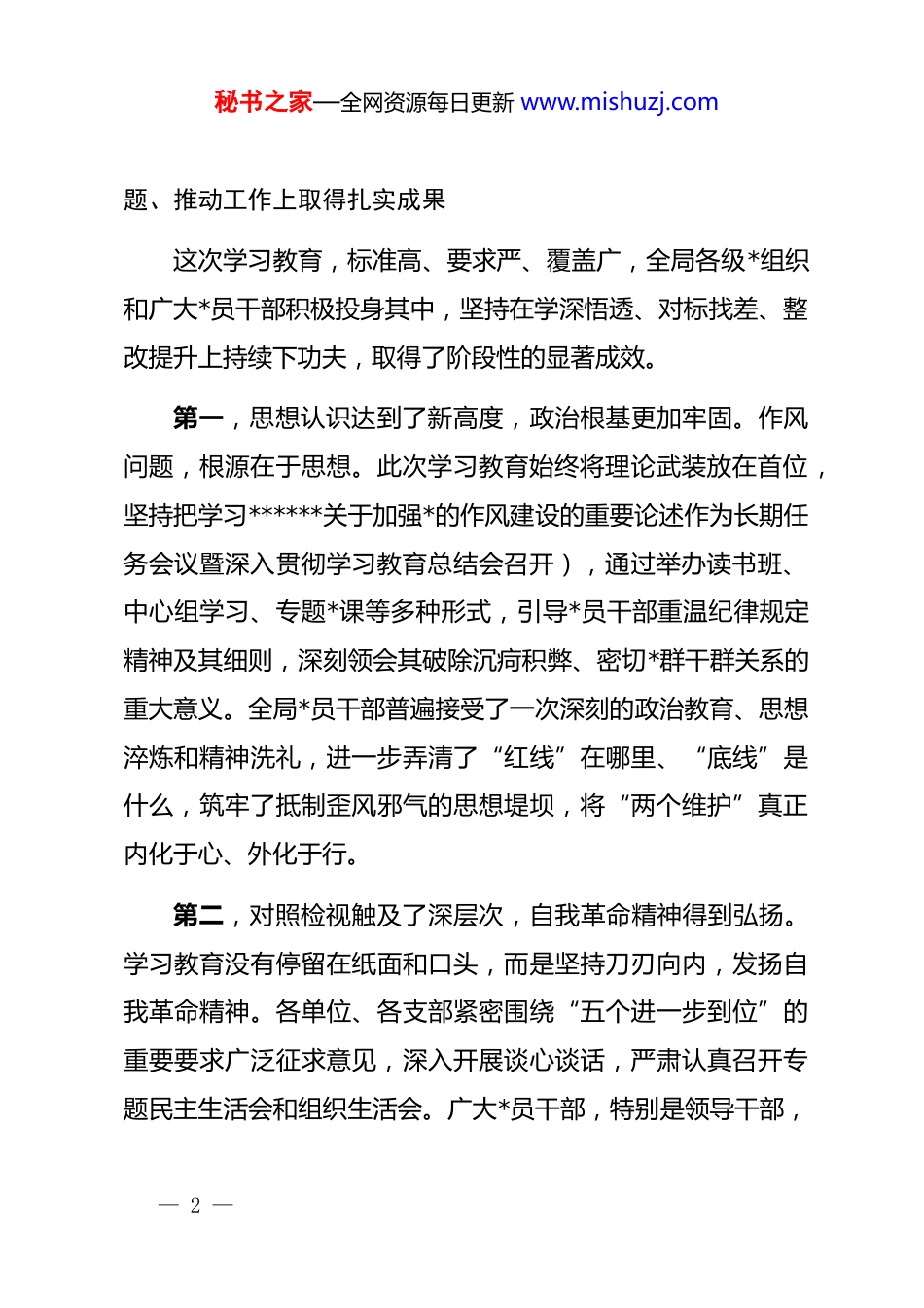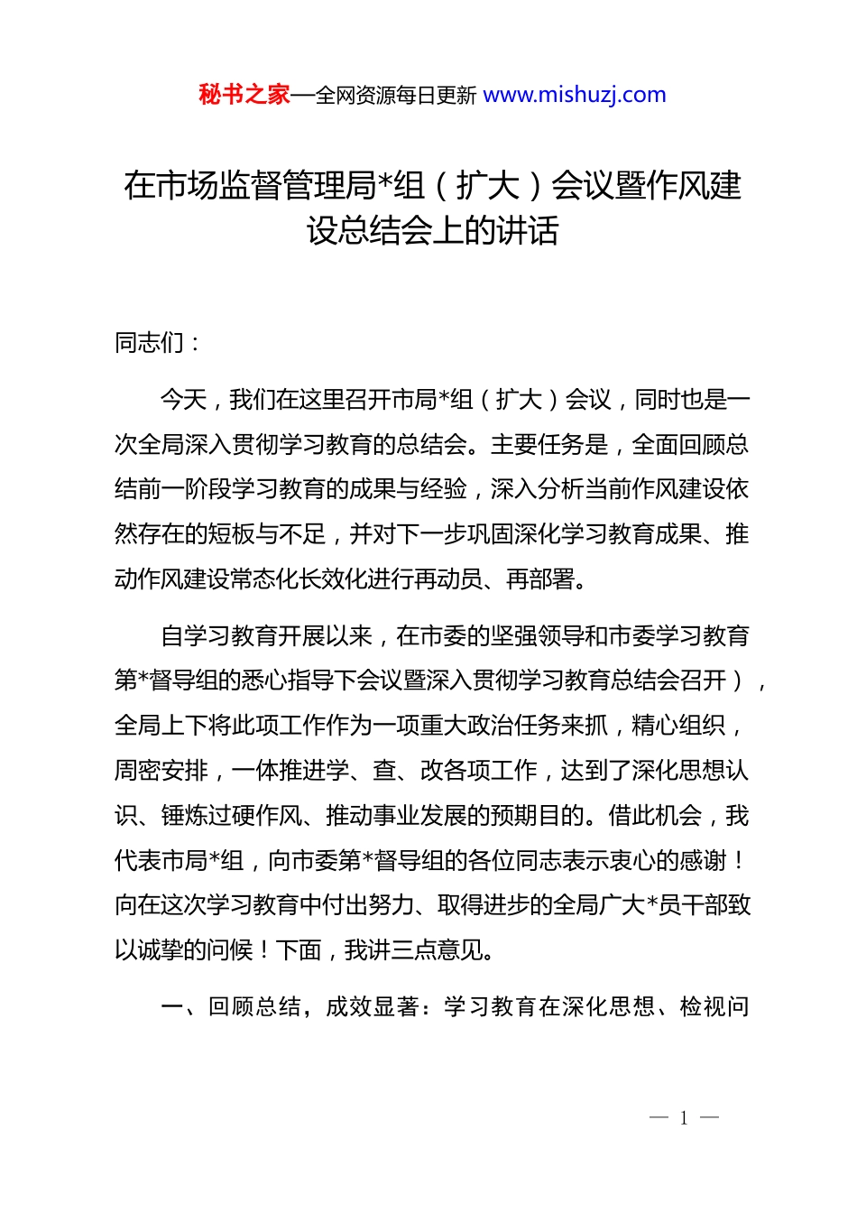 秘书之家—全网资源每日更新 www.mishuzj.com在市场监督管理局*组(扩大)会议暨作风建设总结会上的讲话同志们:今天,我们在这里召开市局*组(扩大)会议,同时也是一次全局深入贯彻学习教育的总结会。主要任务是,全面回顾总结前一阶段学习教育的成果与经验,深入分析当前作风建设依然存在的短板与不足,并对下一步巩固深化学习教育成果、推动作风建设常态化长效化进行再动员、再部署。自学习教育开展以来,在市委的坚强领导和市委学习教育第*督导组的悉心指导下会议暨深入贯彻学习教育总结会召开),全局上下将此项工作作为一项重大政治任务来抓,精心组织,周密安排,一体推进学、查、改各项工作,达到了深化思想认识、锤炼过硬作风、推动事业发展的预期目的。借此机会,我代表市局*组,向市委第*督导组的各位同志表示衷心的感谢!向在这次学习教育中付出努力、取得进步的全局广大*员干部致以诚挚的问候!下面,我讲三点意见。一、回顾总结,成效显著:学习教育在深化思想、检视问— 1 —秘书之家—全网资源每日更新 www.mishuzj.com题、推动工作上取得扎实成果这次学习教育,标准高、要求严、覆盖广,全局各级*组织和广大*员干部积极投身其中,坚持在学深悟透、对标找差、整改提升上持续下功夫,取得了阶段性的显著成效。第一,思想认识达到了新高度,政治根基更加牢固。作风问题,根源在于思想。此次学习教育始终将理论武装放在首位,坚持把学习******关于加强*的作风建设的重要论述作为长期任务会议暨深入贯彻学习教育总结会召开),通过举办读书班、中心组学习、专题*课等多种形式,引导*员干部重温纪律规定精神及其细则,深刻领会其破除沉疴积弊、密切*群干群关系的重大意义。全局*员干部普遍接受了一次深刻的政治教育、思想淬炼和精神洗礼,进一步弄清了“红线”在哪里、“底线”是什么,筑牢了抵制歪风邪气的思想堤坝,将“两个维护”真正内化于心、外化于行。第二,对照检视触及了深层次,自我革命精神得到弘扬。学习教育没有停留在纸面和口头,而是坚持刀刃向内,发扬自我革命精神。各单位、各支部紧密围绕“五个进一步到位”的重要要求广泛征求意见,深入开展谈心谈话,严肃认真召开专题民主生活会和组织生活会。广大*员干部,特别是领导干部,— 2 —秘书之家—全网资源每日更新 www.mishuzj.com把自己摆进去、把职责摆进去、把工作摆进去,对照纪律规定精神,深刻检视在思想、作风、纪律等方面存在的差距和不足。这种“红脸出汗”式的批评和自我批评,让一批隐藏较深的问题浮出水面,达到了“团结—批评—团结”的目的,*内政治生活的“炉火”烧得更旺。第三,问题整改取得了实效性,服务效能得到新提升。开展学习教育的最终落脚点,是解决问题、推动工作。此次学习教育坚持问题导向,将“改”字贯穿始终。针对查摆出的问题,建立台账、明确时限、落实责任,实行销号管理。特别是在优化营商环境、服务企业群众方面,取得明显成效。全局上下聚焦企业和个体工商户反映强烈的急难愁盼问题,大力整治提升,让市场主体切实感受到新风正气。例如,在审批服务领域,流程进一步简化,时限进一步压缩;在执法监管领域,更加注重执法的温度与公平,坚决杜绝乱检查、乱罚款现象;在消费维权领域,通过“百姓点检日”等活动,积极回应社会关切,提升了人民群众的满意度和获得感。这些具体的改变,是作风转变最直接、最有力的证明。第四,建章立制实现了新突破,长效机制更加健全。作风建设非一日之功,必须依靠制度管长远。在学习教育过程中,— 3 —秘书之家—全网资源每日更新 www.mishuzj.com局*组坚持“当下改”与“长久立”相结合,针对对照检查和专项整治中发现的共性问题和制度漏洞,及时总结经验,查缺补漏。对现有制度进行全面梳理、评估和修订,废止了一批不合时宜的规定,完善了一批行之有效的制度,新建了一批管根本、管长远的制度。从公务接待、公车使用,到会议文件、检查调研,再到权力运行监督、干部日常管理,制度的笼子越扎越紧,为推动作风建设常态化长效化提供了坚实的制度保障。二、正视问题,保持清醒:深刻认识作风建设的长期性、复杂性和艰...