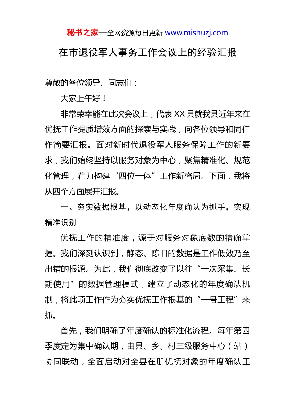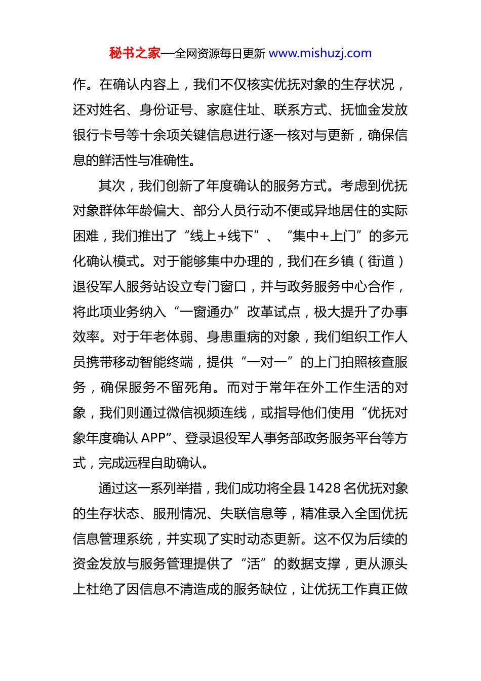 秘书之家—全网资源每日更新 www.mishuzj.com在市退役军人事务工作会议上的经验汇报 尊敬的各位领导、同志们:大家上午好!非常荣幸能在此次会议上,代表 XX 县就我县近年来在优抚工作提质增效方面的探索与实践,向各位领导和同仁作简要汇报。面对新时代退役军人服务保障工作的新要求,我们始终坚持以服务对象为中心,聚焦精准化、规范化管理,着力构建“四位一体”工作新格局。下面,我将从四个方面展开汇报。一、夯实数据根基,以动态化年度确认为抓手,实现精准识别优抚工作的精准度,源于对服务对象底数的精确掌握。我们深刻认识到,静态、陈旧的数据是工作低效乃至出错的根源。为此,我们彻底改变了以往“一次采集、长期使用”的数据管理模式,建立了动态化的年度确认机制,将此项工作作为夯实优抚工作根基的“一号工程”来抓。首先,我们明确了年度确认的标准化流程。每年第四季度定为集中确认期,由县、乡、村三级服务中心(站)协同联动,全面启动对全县在册优抚对象的年度确认工秘书之家—全网资源每日更新 www.mishuzj.com作。在确认内容上,我们不仅核实优抚对象的生存状况,还对姓名、身份证号、家庭住址、联系方式、抚恤金发放银行卡号等十余项关键信息进行逐一核对与更新,确保信息的鲜活性与准确性。其次,我们创新了年度确认的服务方式。考虑到优抚对象群体年龄偏大、部分人员行动不便或异地居住的实际困难,我们推出了“线上+线下”、“集中+上门”的多元化确认模式。对于能够集中办理的,我们在乡镇(街道)退役军人服务站设立专门窗口,并与政务服务中心合作,将此项业务纳入“一窗通办”改革试点,极大提升了办事效率。对于年老体弱、身患重病的对象,我们组织工作人员携带移动智能终端,提供“一对一”的上门拍照核查服务,确保服务不留死角。而对于常年在外工作生活的对象,我们则通过微信视频连线,或指导他们使用“优抚对象年度确认 APP”、登录退役军人事务部政务服务平台等方式,完成远程自助确认。通过这一系列举措,我们成功将全县 1428 名优抚对象的生存状态、服刑情况、失联信息等,精准录入全国优抚信息管理系统,并实现了实时动态更新。这不仅为后续的资金发放与服务管理提供了“活”的数据支撑,更从源头上杜绝了因信息不清造成的服务缺位,让优抚工作真正做秘书之家—全网资源每日更新 www.mishuzj.com到了“底数清、状态明、服务准”。二、打破信息壁垒,以常态化数据比对为核心,实现精准施策如果说动态确认是 打通了数据采集的“ 最先一公里”,那么常态化的跨部门数据比对,则是破解信息孤岛、实现精准施策的关键一环。我们积极探索建立了跨部门、多维度的数据比对核查长效机制,让数据多跑路,让服务对象少跑腿。我们主动牵头,与公安、法院、民政、人社、医保等关键部门建立起常态化数据交换与共享机制。虽然正式的跨部门数据共享协议仍在完善过程中但实质性的协作已经全面展开。具体操作上,我们每月定期将我县的抚恤补助金发放名册,分别推送至公安部门比对户籍与生存状态信息,与法院系统比对服刑记录信息,与民政部门比对死亡火化信息,与人社部门比对养老金领取信息。这一举措改变了过去仅靠基层上报或群众举报的被动局面,变被动响应为主动筛查。近两年来,通过这种跨部门联动的模式,我们累计比对各类数据超过 1.3 万条。基于比对结果,我们及时核销了因死亡、判刑等原因不再符合享受待遇条件的优抚对象资格,有效预防了待遇冒领风险。例如,我们曾通过与民秘书之家—全网资源每日更新 www.mishuzj.com政数据比对,及时发现一名优抚对象已于上月去世,其家属尚未前来办理手续,我们随即主动联系家属,在表达哀悼的同时,讲解政策并指导办理抚恤金停发及丧葬补助申领事宜,避免了可能发生的冒领行为及其后续复杂的追缴程序。同时,我们也通过数据比对,精准识别出新增的符合条件对象,第一时间安排工作人员上门服务,确保了党的优抚政策“应享尽享、不漏一人”。这一机制的建立,不仅保障了优抚资金的安全,更体现了政府服务的严谨与温情。三、严守资金红线,以规范化流程管理为保障,实现精准发放优抚资金是优抚对象...