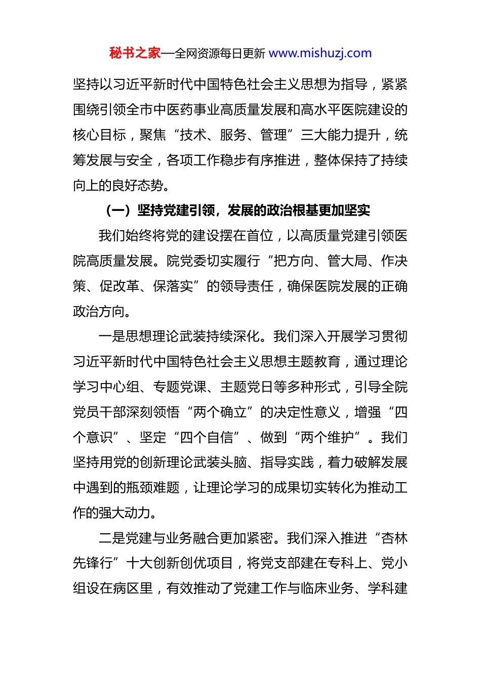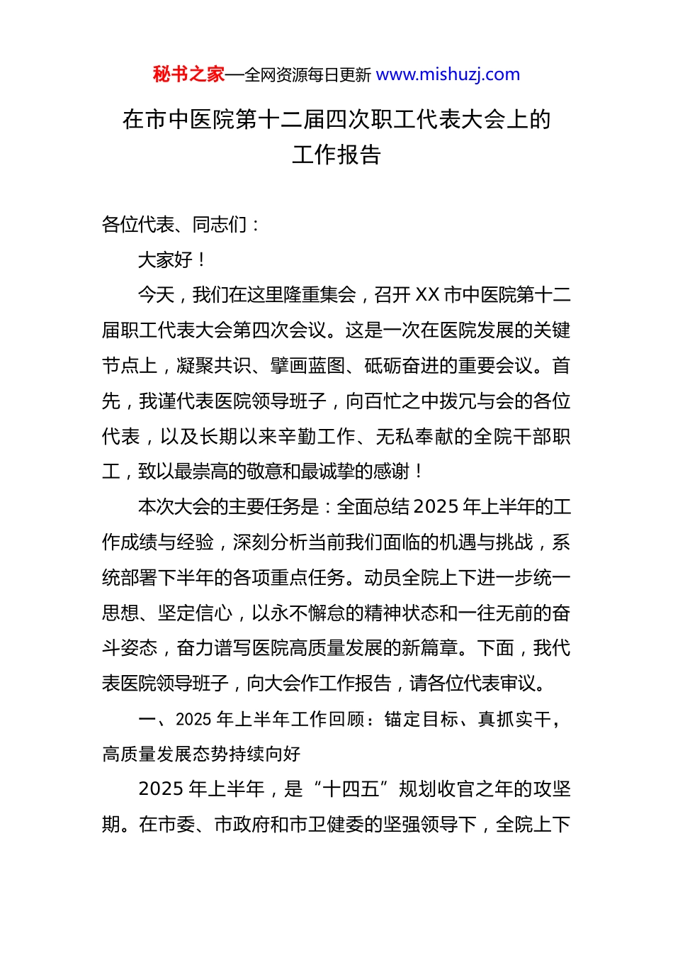 秘书之家—全网资源每日更新 www.mishuzj.com在市中医院第十二届四次职工代表大会上的工作报告 各位代表、同志们:大家好!今天,我们在这里隆重集会,召开 XX 市中医院第十二届职工代表大会第四次会议。这是一次在医院发展的关键节点上,凝聚共识、擘画蓝图、砥砺奋进的重要会议。首先,我谨代表医院领导班子,向百忙之中拨冗与会的各位代表,以及长期以来辛勤工作、无私奉献的全院干部职工,致以最崇高的敬意和最诚挚的感谢!本次大会的主要任务是:全面总结 2025 年上半年的工作成绩与经验,深刻分析当前我们面临的机遇与挑战,系统部署下半年的各项重点任务。动员全院上下进一步统一思想、坚定信心,以永不懈怠的精神状态和一往无前的奋斗姿态,奋力谱写医院高质量发展的新篇章。下面,我代表医院领导班子,向大会作工作报告,请各位代表审议。一、2025 年上半年工作回顾:锚定目标、真抓实干,高质量发展态势持续向好2025 年上半年,是“十四五”规划收官之年的攻坚期。在市委、市政府和市卫健委的坚强领导下,全院上下秘书之家—全网资源每日更新 www.mishuzj.com坚持以习近平新时代中国特色社会主义思想为指导,紧紧围绕引领全市中医药事业高质量发展和高水平医院建设的核心目标,聚焦“技术、服务、管理”三大能力提升,统筹发展与安全,各项工作稳步有序推进,整体保持了持续向上的良好态势。(一)坚持党建引领,发展的政治根基更加坚实我们始终将党的建设摆在首位,以高质量党建引领医院高质量发展。院党委切实履行“把方向、管大局、作决策、促改革、保落实”的领导责任,确保医院发展的正确政治方向。一是思想理论武装持续深化。我们深入开展学习贯彻习近平新时代中国特色社会主义思想主题教育,通过理论学习中心组、专题党课、主题党日等多种形式,引导全院党员干部深刻领悟“两个确立”的决定性意义,增强“四个意识”、坚定“四个自信”、做到“两个维护”。我们坚持用党的创新理论武装头脑、指导实践,着力破解发展中遇到的瓶颈难题,让理论学习的成果切实转化为推动工作的强大动力。二是党建与业务融合更加紧密。我们深入推进“杏林先锋行”十大创新创优项目,将党支部建在专科上、党小组设在病区里,有效推动了党建工作与临床业务、学科建秘书之家—全网资源每日更新 www.mishuzj.com设、人才培养的深度融合。通过扎实开展“六好领导班子”建设、“三过硬”示范党支部创建和“五带头”党员争先创优专项行动,广大党员的先锋模范作用在医疗服务、科研攻关、应急处突等各项工作中得到了充分彰显,形成了党政同心、上下协力、齐抓共管的生动局面。(二)聚焦内涵建设,核心竞争力实现新跃升我们牢牢把握高质量发展这一首要任务,坚持“技术立院、特色兴院、人才强院”的发展战略,医院的核心竞争力和品牌影响力得到显著增强。一是“三名”战略实施取得新突破。作为全市“三名”战略的重要参与者和建设者,我们对标“到 2025 年进入全国 50 强中医医院”的宏伟目标,持续发力。上半年,我院在学科建设上捷报频传,骨伤科成功创建成为 XX 省中医退行性骨关节病临床医学创新中心,并成为国家中医区域诊疗中心的分中心,标志着我院在国家级、省级高水平学科平台建设上迈出了坚实的一步。在人才引育方面,我们积极对接“XX 人才计划”,成功引进了多个顶尖医学专家团队,其中 3 个团队入选顶尖专家团队,2 个团队入选高端专家团队。我们还与 XX 区人民政府签署战略合作协议,共建“XX 市中医院 XX 分部”,计划用五年时间,通过“一院一策”的精准帮扶,全面提升其专科技术、学科水秘书之家—全网资源每日更新 www.mishuzj.com平和医疗服务能力,实现国考排名的显著提高,这不仅拓展了医院的发展空间,更是我们服务区域医疗卫生事业发展的责任担当。二是中医药传承创新彰显新作为。我们始终将传承创新作为中医药事业发展的根与魂,特别是将“打响 XX 医派名片”作为我们的核心战略任务。上半年,我们依托 XX 省中医流派研究院 XX 医派分院这一高能级平台,持续深化XX 医派的理论挖掘、学术研究和临床应用。我们联合顶尖科研机构,将人...
