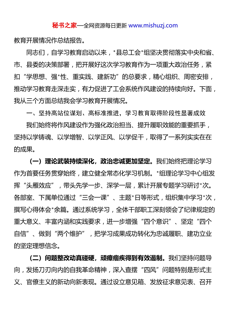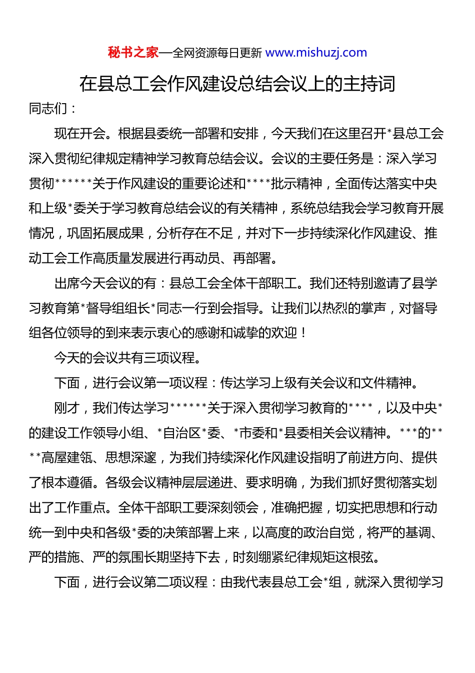 秘书之家—全网资源每日更新 www.mishuzj.com在县总工会作风建设总结会议上的主持词同志们:现在开会。根据县委统一部署和安排,今天我们在这里召开*县总工会深入贯彻纪律规定精神学习教育总结会议。会议的主要任务是:深入学习贯彻******关于作风建设的重要论述和****批示精神,全面传达落实中央和上级*委关于学习教育总结会议的有关精神,系统总结我会学习教育开展情况,巩固拓展成果,分析存在不足,并对下一步持续深化作风建设、推动工会工作高质量发展进行再动员、再部署。出席今天会议的有:县总工会全体干部职工。我们还特别邀请了县学习教育第*督导组组长*同志一行到会指导。让我们以热烈的掌声,对督导组各位领导的到来表示衷心的感谢和诚挚的欢迎!今天的会议共有三项议程。下面,进行会议第一项议程:传达学习上级有关会议和文件精神。刚才,我们传达学习******关于深入贯彻学习教育的****,以及中央*的建设工作领导小组、*自治区*委、*市委和*县委相关会议精神。***的****高屋建瓴、思想深邃,为我们持续深化作风建设指明了前进方向、提供了根本遵循。各级会议精神层层递进、要求明确,为我们抓好贯彻落实划出了工作重点。全体干部职工要深刻领会,准确把握,切实把思想和行动统一到中央和各级*委的决策部署上来,以高度的政治自觉,将严的基调、严的措施、严的氛围长期坚持下去,时刻绷紧纪律规矩这根弦。下面,进行会议第二项议程:由我代表县总工会*组,就深入贯彻学习秘书之家—全网资源每日更新 www.mishuzj.com教育开展情况作总结报告。同志们,自学习教育启动以来,*县总工会*组坚决贯彻落实中央和省、市、县委的决策部署,把开展好这次学习教育作为一项重大政治任务,紧扣“学思想、强*性、重实践、建新功”的总要求,精心组织、周密安排,推动学习教育走深走实,有力促进了工会系统作风建设的持续向好。下面,我从三个方面总结我会学习教育开展情况。一、坚持高站位谋划、高标准推进,学习教育取得阶段性显著成效我们始终将作风建设作为强化政治担当、提升履职效能的重要抓手,坚持以学铸魂、以学增智、以学正风、以学促干,取得了一系列实实在在的成果。(一)理论武装持续深化,政治忠诚更加坚定。我们始终把理论学习作为首要任务贯穿始终,建立健全常态化学习机制。*组理论学习中心组发挥“头雁效应”,带头先学一步、深学一层,累计开展专题学习研讨*次。各部室、下属单位通过“三会一课”、主题*日等形式,组织集中学习*次,撰写心得体会*余篇。通过系统学习,全体干部职工深刻领会了纪律规定的重大意义、丰富内涵和实践要求,进一步增强“四个意识”、坚定“四个自信”、做到“两个维护”,把学习成果成功转化为忠诚履职、建功立业的坚定理想信念。(二)问题整改动真碰硬,顽瘴痼疾得到有效遏制。我们坚持问题导向,发扬刀刃向内的自我革命精神,深入查摆“四风”问题特别是形式主义、官僚主义的新动向新表现。通过设立意见箱、发放征求意见表、召开秘书之家—全网资源每日更新 www.mishuzj.com座谈会、深入基层一线调研等多种方式,广泛听取职工群众和服务对象的意见建议。截至 2025 年 9 月,我们共梳理查摆出 3 大类 18 个具体问题,建立整改台账 18 项,逐一明确责任领导、责任部室和整改时限,制定整改措施 45 条。目前,已完成整改 17 项,整改完成率达到 94.4%。针对“文山会海”问题,我们大力精简文件和会议,2025 年 1—8 月,发文数量和会议数量同比分别下降 18%和 22%。针对服务职工“最后一公里”问题,我们启动了“*暖心服务”项目,简化优化办事流程*项,受到了基层工会和广大职工的一致好评。(三)警示教育常态长效,纪律防线不断筑牢。我们坚持以案为鉴、以案明纪,让警示教育真正入脑入心。全年累计组织观看警示教育片*部,学习违纪违法典型案例通报*次,举办“以案为鉴、警钟长鸣”主题警示教育大会*场,覆盖全体干部职工达*人次。我们特别注重用好身边人、身边事这本“活教材”,通过深入剖析近年来发生在本地本系统的一些典型案例,引导广大*员干部揽镜自照、反躬自省,深刻认识到纪律规矩既是“紧箍咒...