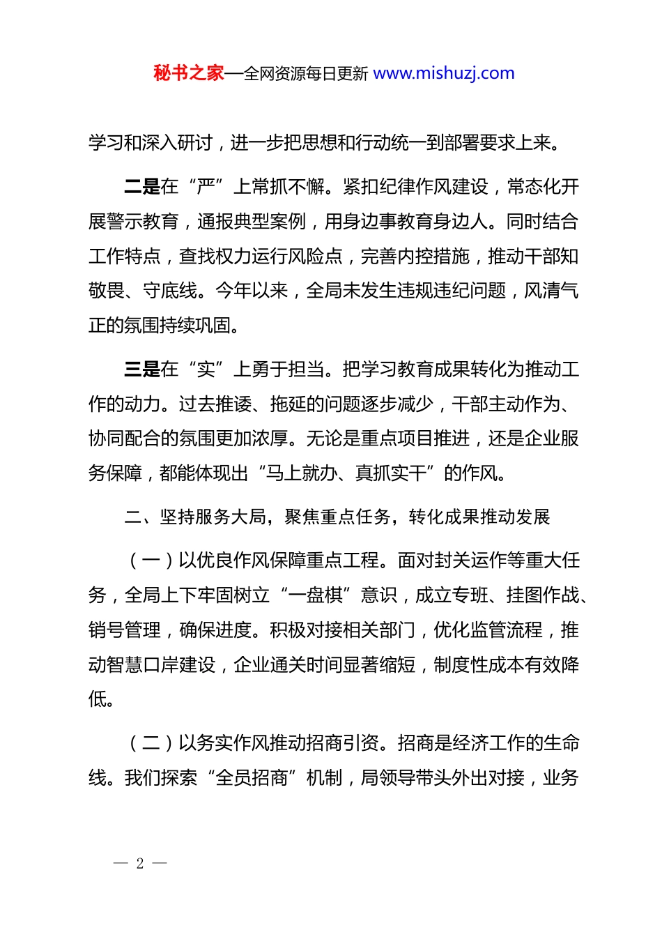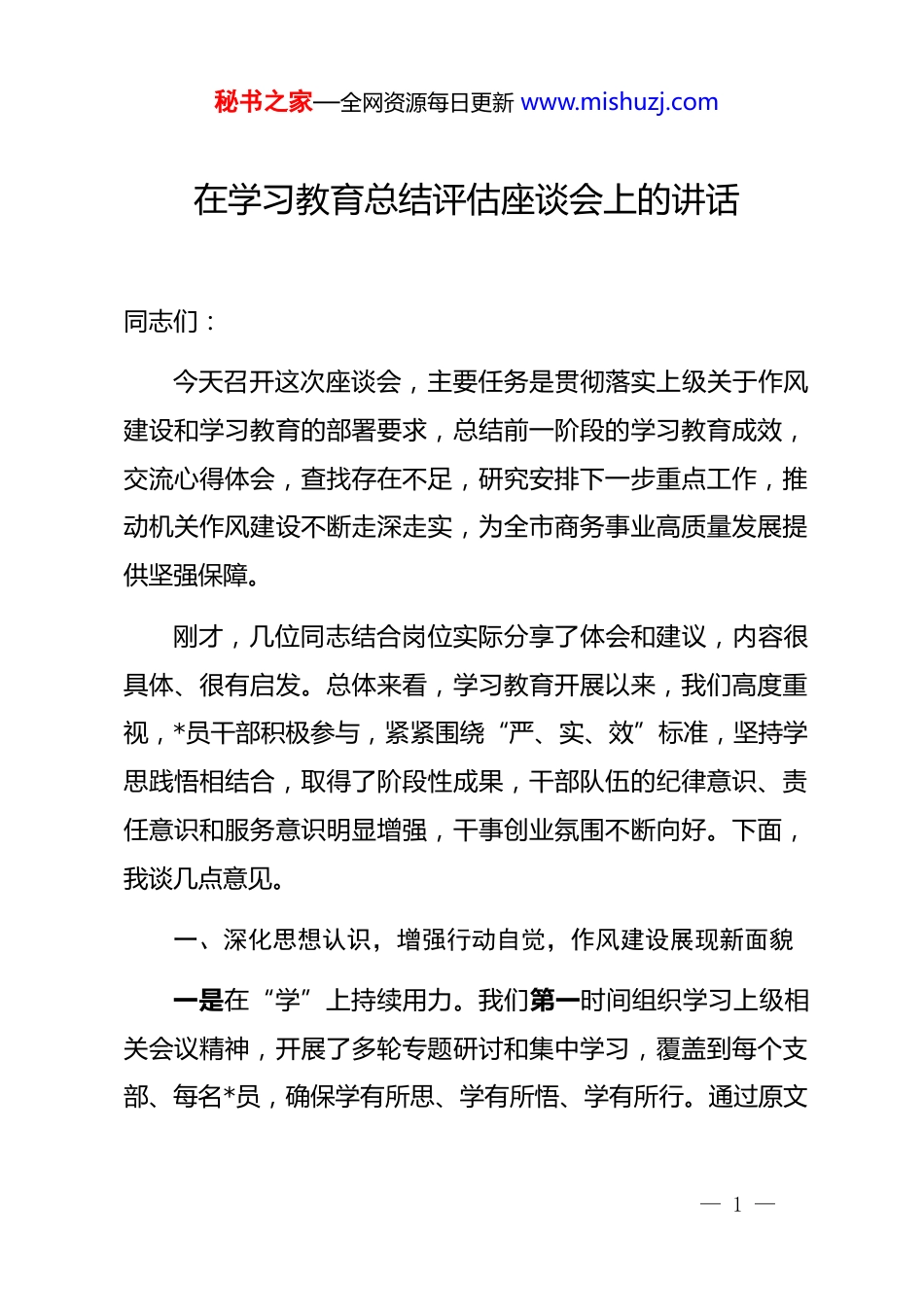 秘书之家—全网资源每日更新 www.mishuzj.com在学习教育总结评估座谈会上的讲话同志们:今天召开这次座谈会,主要任务是贯彻落实上级关于作风建设和学习教育的部署要求,总结前一阶段的学习教育成效,交流心得体会,查找存在不足,研究安排下一步重点工作,推动机关作风建设不断走深走实,为全市商务事业高质量发展提供坚强保障。刚才,几位同志结合岗位实际分享了体会和建议,内容很具体、很有启发。总体来看,学习教育开展以来,我们高度重视,*员干部积极参与,紧紧围绕“严、实、效”标准,坚持学思践悟相结合,取得了阶段性成果,干部队伍的纪律意识、责任意识和服务意识明显增强,干事创业氛围不断向好。下面,我谈几点意见。一、深化思想认识,增强行动自觉,作风建设展现新面貌一是在“学”上持续用力。我们第一时间组织学习上级相关会议精神,开展了多轮专题研讨和集中学习,覆盖到每个支部、每名*员,确保学有所思、学有所悟、学有所行。通过原文— 1 —秘书之家—全网资源每日更新 www.mishuzj.com学习和深入研讨,进一步把思想和行动统一到部署要求上来。二是在“严”上常抓不懈。紧扣纪律作风建设,常态化开展警示教育,通报典型案例,用身边事教育身边人。同时结合工作特点,查找权力运行风险点,完善内控措施,推动干部知敬畏、守底线。今年以来,全局未发生违规违纪问题,风清气正的氛围持续巩固。三是在“实”上勇于担当。把学习教育成果转化为推动工作的动力。过去推诿、拖延的问题逐步减少,干部主动作为、协同配合的氛围更加浓厚。无论是重点项目推进,还是企业服务保障,都能体现出“马上就办、真抓实干”的作风。二、坚持服务大局,聚焦重点任务,转化成果推动发展(一)以优良作风保障重点工程。面对封关运作等重大任务,全局上下牢固树立“一盘棋”意识,成立专班、挂图作战、销号管理,确保进度。积极对接相关部门,优化监管流程,推动智慧口岸建设,企业通关时间显著缩短,制度性成本有效降低。(二)以务实作风推动招商引资。招商是经济工作的生命线。我们探索“全员招商”机制,局领导带头外出对接,业务— 2 —秘书之家—全网资源每日更新 www.mishuzj.com处室主动联系头部企业和龙头项目。今年以来,已开展多场专题招商活动,对接意向企业数百家。通过设立“一站式”窗口和专人跟进,推动重点项目快速落地。数据显示,上半年实际利用外资和新设企业数量保持两位数增长,产业结构不断优化。(三)以担当作风激发消费市场活力。消费是稳增长的关键。我们精心策划并举办了系列促消费活动,带动消费额大幅增长。政策叠加和市场培育并举,汽车、家电等大宗消费品实现较快增长,新业态、新模式不断涌现,城市商业活力持续增强。三、保持清醒头脑,直面问题不足,推动作风建设走深走实成绩值得肯定,但也要看到不足:一是部分干部思想上存在松懈,对作风建设的长期性、复杂性认识不够,存在“过关”思想。二是调研不深入,服务不够到位,“最后一公里”问题依然存在。三是制度执行力不足,监督检查有待强化,制度约束力不够有力。这些问题看似是业务方法问题,实则是责任担当和 z 旨意识不足的体现,必须下决心加以解决。— 3 —秘书之家—全网资源每日更新 www.mishuzj.com四、提高政治站位,强化责任落实,以优良作风推动事业发展一要在“铸魂”上持续发力。坚持理论武装,常态化开展思想教育,把制度要求作为政治纪律和行动准则,做到内化于心、外化于行。二要在“为民”上落地见效。树牢为民服务意识,聚焦消费、就业等群众关切,推出实实在在的举措。畅通诉求渠道,打造便利高效的营商环境,让企业放心投资、安心发展。三要在“实干”上展现作为。聚焦招商引资、消费促进、项目建设等重点工作,细化责任分工,强化督查落实。干部要敢于担当、善于突破,敢啃“硬骨头”,在一线展现作风和能力。四要在“长效”上健全机制。坚持当下整改和长效建设相结合,扎紧制度笼子,健全监督机制,推动权力在阳光下运行。对突出问题开展“回头看”,防止反弹,持续释放从严管理的信号。同志们,作风建设永远在路上。我们要以坚定的决心、务实的作风和不...