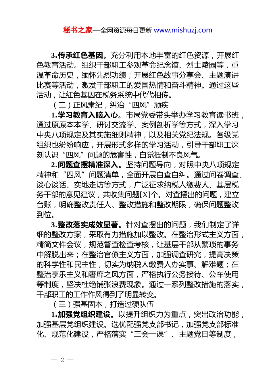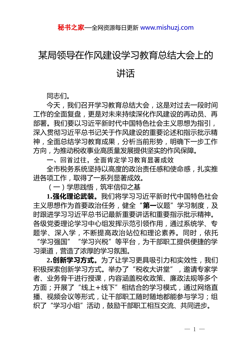 秘书之家—全网资源每日更新 www.mishuzj.com某局领导在作风建设学习教育总结大会上的讲话同志们。今天,我们召开学习教育总结大会,这是对过去一段时间工作的全面复盘,更是对未来持续深化作风建设的再动员、再部署。我们要以习近平新时代中国特色社会主义思想为指引,深入贯彻习近平总书记关于作风建设的重要论述和指示批示精神,全面总结学习教育成果,分析当前形势,明确下一步工作方向,为推动税收事业高质量发展提供坚实的作风保障。一、回首过往,全面肯定学习教育显著成效全市税务系统坚持以高度的政治责任感和使命感,扎实推进各项工作,取得了一系列显著成效。(一)学思践悟,筑牢信仰之基1.强化理论武装。我们将学习习近平新时代中国特色社会主义思想作为首要政治任务,健全“第一议题”学习制度,及时跟进学习习近平总书记最新重要讲话和重要指示批示精神。各级党委理论学习中心组发挥示范引领作用,通过系统学、专题学、深入学,不断提高政治站位和理论素养。同时,依托“学习强国”“学习兴税”等平台,为干部职工提供便捷的学习渠道,营造了浓厚的学习氛围。2.创新学习方式。为了让学习更具吸引力和实效性,我们积极探索创新学习方式。举办了“税收大讲堂”,邀请专家学者、业务骨干进行授课,内容涵盖税收政策、廉政法规等多个方面;开展了“线上+线下”相结合的学习模式,通过网络直播、视频会议等形式,让干部职工随时随地都能参与学习;组织了“学习小组”活动,鼓励干部职工相互交流、共同进步。— 1 —秘书之家—全网资源每日更新 www.mishuzj.com3.传承红色基因。充分利用本地丰富的红色资源,开展红色教育活动。组织干部职工参观革命纪念馆、烈士陵园等,重温革命历史,缅怀先烈功绩;开展红色故事分享会、主题演讲比赛等活动,激发干部职工的爱国热情和奋斗精神。通过这些活动,让红色基因在税务系统中代代相传。(二)正风肃纪,纠治“四风”顽疾1.学习教育入脑入心。市局党委带头举办学习教育读书班,通过原原本本学、研讨交流学、案例剖析学等方式,深入学习中央八项规定及其实施细则精神,以及相关党纪法规。各级党组织也纷纷响应,开展形式多样的学习活动,引导干部职工深刻认识“四风”问题的危害性,自觉抵制不良风气。2.问题查摆精准深入。坚持问题导向,对照中央八项规定精神和“四风”问题清单,全面开展自查自纠。通过问卷调查、谈心谈话、实地走访等方式,广泛征求纳税人缴费人、基层税务干部的意见建议,共收集问题[X]个。对查摆出的问题,建立台账,明确整改责任人、整改措施和整改期限,确保问题整改到位。3.整改落实成效显著。针对查摆出的问题,我们制定了详细的整改方案,采取有力措施加以整改。在整治形式主义方面,精简文件会议,规范督查检查考核,让基层干部从繁琐的事务中解脱出来;在整治官僚主义方面,加强调查研究,提高决策的科学性和民主性,切实为纳税人缴费人办实事、解难题;在整治享乐主义和奢靡之风方面,严格执行公务接待、公车使用等制度,坚决杜绝铺张浪费现象。通过一系列整改措施的落实,干部职工的工作作风得到了明显转变。(三)强基固本,打造过硬队伍1.加强党组织建设。以提升组织力为重点,突出政治功能,加强基层党组织建设。选优配强党支部书记,加强党支部标准化、规范化建设,严格落实“三会一课”、主题党日等制度,— 2 —秘书之家—全网资源每日更新 www.mishuzj.com充分发挥党支部的战斗堡垒作用和党员的先锋模范作用。2.提升干部能力素质。实施“人才兴税”战略,加大干部教育培训力度。开展了各类业务培训、岗位练兵活动,提高干部职工的业务水平和综合素质;建立了人才库,选拔培养了一批业务骨干和领军人才,为税收事业发展提供了人才支撑。3.激励干部担当作为。建立健全干部考核评价机制,树立正确的用人导向,让想干事、能干事、干成事的干部有机会、有舞台。开展了“担当作为好干部”评选活动,对表现突出的干部进行表彰奖励,激发干部职工的工作积极性和主动性。(四)服务发展,展现税务担当1.助力经济发展。积极落实各项税收优惠政策,为企业减负增效。通过开展政策宣传辅导、优化...