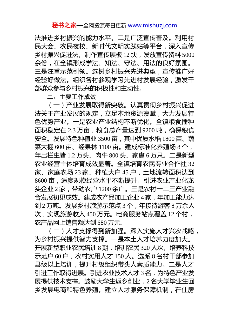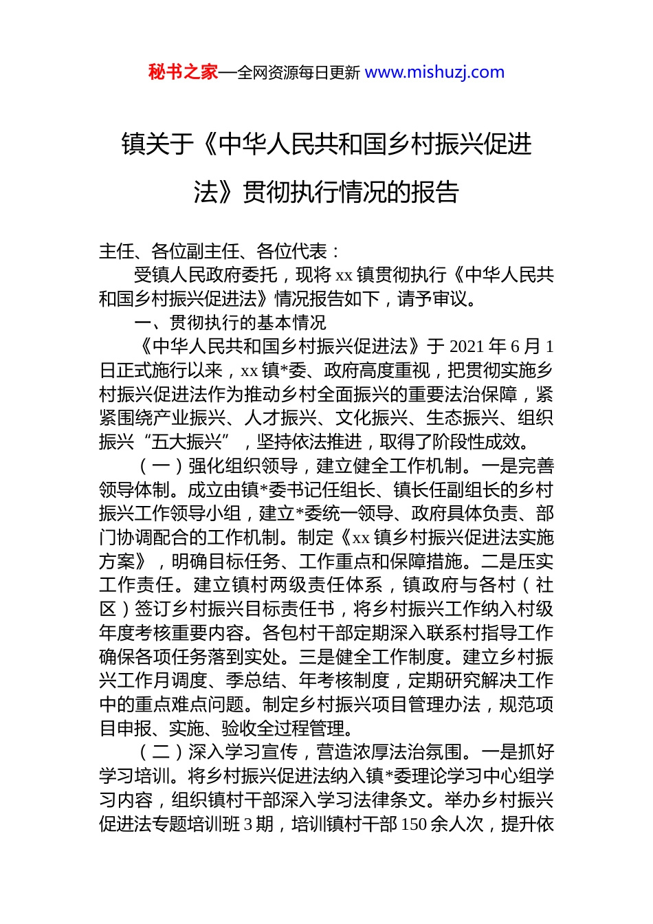 秘书之家—全网资源每日更新 www.mishuzj.com镇关于《中华人民共和国乡村振兴促进法》贯彻执行情况的报告主任、各位副主任、各位代表:受镇人民政府委托,现将 xx 镇贯彻执行《中华人民共和国乡村振兴促进法》情况报告如下,请予审议。一、贯彻执行的基本情况《中华人民共和国乡村振兴促进法》于 2021 年 6 月 1日正式施行以来,xx 镇*委、政府高度重视,把贯彻实施乡村振兴促进法作为推动乡村全面振兴的重要法治保障,紧紧围绕产业振兴、人才振兴、文化振兴、生态振兴、组织振兴“五大振兴”,坚持依法推进,取得了阶段性成效。(一)强化组织领导,建立健全工作机制。一是完善领导体制。成立由镇*委书记任组长、镇长任副组长的乡村振兴工作领导小组,建立*委统一领导、政府具体负责、部门协调配合的工作机制。制定《xx 镇乡村振兴促进法实施方案》,明确目标任务、工作重点和保障措施。二是压实工作责任。建立镇村两级责任体系,镇政府与各村(社区)签订乡村振兴目标责任书,将乡村振兴工作纳入村级年度考核重要内容。各包村干部定期深入联系村指导工作确保各项任务落到实处。三是健全工作制度。建立乡村振兴工作月调度、季总结、年考核制度,定期研究解决工作中的重点难点问题。制定乡村振兴项目管理办法,规范项目申报、实施、验收全过程管理。(二)深入学习宣传,营造浓厚法治氛围。一是抓好学习培训。将乡村振兴促进法纳入镇*委理论学习中心组学习内容,组织镇村干部深入学习法律条文。举办乡村振兴促进法专题培训班 3 期,培训镇村干部 150 余人次,提升依秘书之家—全网资源每日更新 www.mishuzj.com法推进乡村振兴的能力水平。二是广泛宣传普及。利用村民大会、农民夜校、新时代文明实践站等平台,深入宣传乡村振兴促进法。制作宣传展板 12 块,发放宣传资料 5000余份,在全镇形成学法、知法、守法、用法的良好氛围。三是注重示范引领。选树乡村振兴先进典型,宣传推广好经验好做法。组织各村参观学习先进村发展经验,激发干部群众参与乡村振兴的积极性和主动性。二、主要工作成效(一)产业发展取得新突破。认真贯彻乡村振兴促进法关于产业发展的规定,立足本地资源禀赋,大力发展特色优势产业。一是农业产业结构不断优化。全镇粮食播种面积稳定在 2.3 万亩,粮食总产量达到 9200 吨,确保粮食安全。发展特色种植业 3500 亩,其中优质水稻 1800 亩、蔬菜大棚 600 亩、经果林 1100 亩。建成标准化养殖场 8 个,年出栏生猪 1.2 万头、肉牛 800 头、家禽 6 万只。二是新型农业经营主体培育成效显著。全镇培育农民专业合作社 32家、家庭农场 23 家、种植大户 45 户,土地流转面积达到8600 亩,适度规模经营水平不断提升。引进农业产业化龙头企业 2 家,带动农户 1200 余户。三是农村一二三产业融合发展初见成效。建成农产品加工企业 4 家,年加工能力达到 2 万吨。发展乡村旅游示范点 3 个,年接待游客 8 万余人次,实现旅游收入 450 万元。电商服务站点覆盖 12 个村,农产品网上销售额达到 680 万元。(二)人才支撑得到新加强。深入实施人才兴农战略,为乡村振兴提供智力支撑。一是本土人才培养力度加大。开展新型职业农民培训 8 期,培训农民 320 人次。培养科技示范户 60 户,农村实用人才 150 人。选派 8 名村干部参加县级以上培训,提升村级组织带头人素质能力。二是人才引进工作取得进展。引进农业技术人才 3 名,为特色产业发展提供技术支撑。鼓励大学生返乡创业,2 名大学毕业生回乡发展电商和特色养殖。建立人才服务保障机制,在住房秘书之家—全网资源每日更新 www.mishuzj.com子女教育等方面给予政策倾斜。三是科技服务体系不断完善。与县农业技术推广站建立合作关系,定期邀请农技专家到村开展技术指导。建立农业科技示范基地 2 个,推广新品种、新技术 8 项,科技对农业增长的贡献率达到 65%。(三)文化建设呈现新气象。坚持以社会主义核心价值观为引领,传承发展农村优秀传统文化。一是公共文化服务体系不断完善。建成综合文化服务中心 12 个,农家书屋 15 个,文...