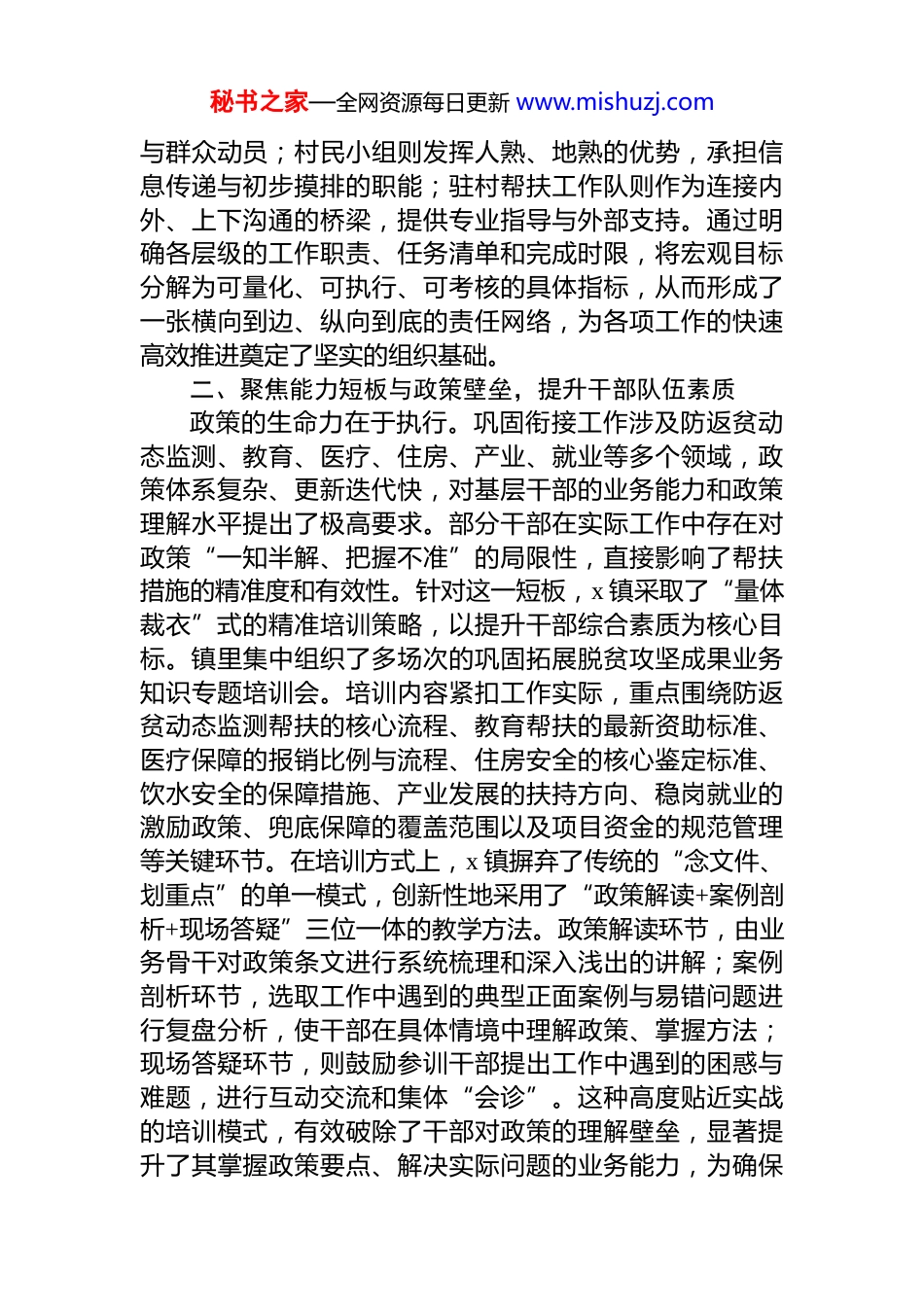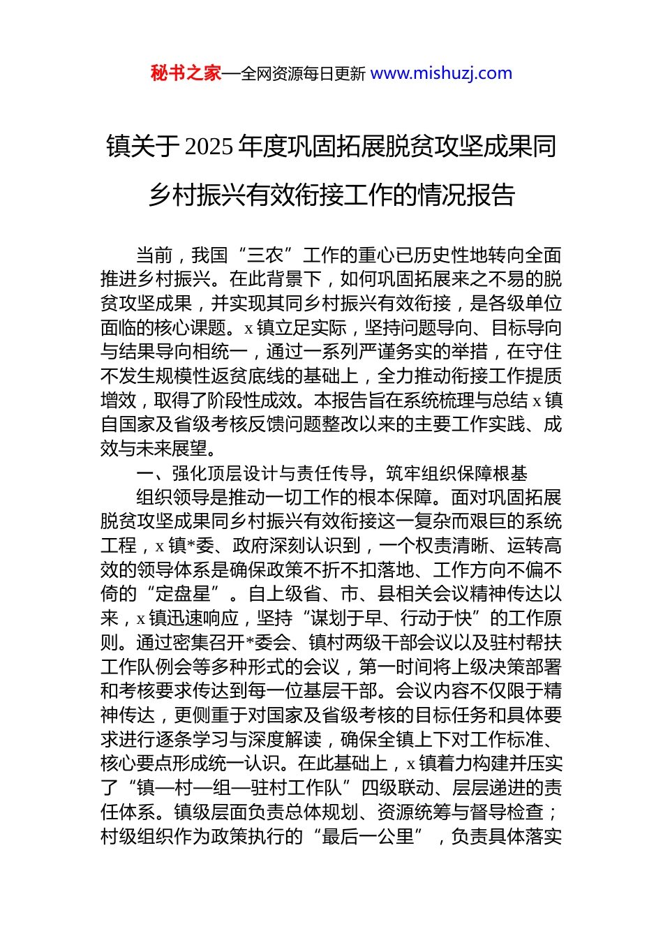 秘书之家—全网资源每日更新 www.mishuzj.com镇关于 2025 年度巩固拓展脱贫攻坚成果同乡村振兴有效衔接工作的情况报告当前,我国“三农”工作的重心已历史性地转向全面推进乡村振兴。在此背景下,如何巩固拓展来之不易的脱贫攻坚成果,并实现其同乡村振兴有效衔接,是各级单位面临的核心课题。x 镇立足实际,坚持问题导向、目标导向与结果导向相统一,通过一系列严谨务实的举措,在守住不发生规模性返贫底线的基础上,全力推动衔接工作提质增效,取得了阶段性成效。本报告旨在系统梳理与总结 x 镇自国家及省级考核反馈问题整改以来的主要工作实践、成效与未来展望。一、强化顶层设计与责任传导,筑牢组织保障根基组织领导是推动一切工作的根本保障。面对巩固拓展脱贫攻坚成果同乡村振兴有效衔接这一复杂而艰巨的系统工程,x 镇*委、政府深刻认识到,一个权责清晰、运转高效的领导体系是确保政策不折不扣落地、工作方向不偏不倚的“定盘星”。自上级省、市、县相关会议精神传达以来,x 镇迅速响应,坚持“谋划于早、行动于快”的工作原则。通过密集召开*委会、镇村两级干部会议以及驻村帮扶工作队例会等多种形式的会议,第一时间将上级决策部署和考核要求传达到每一位基层干部。会议内容不仅限于精神传达,更侧重于对国家及省级考核的目标任务和具体要求进行逐条学习与深度解读,确保全镇上下对工作标准、核心要点形成统一认识。在此基础上,x 镇着力构建并压实了“镇—村—组—驻村工作队”四级联动、层层递进的责任体系。镇级层面负责总体规划、资源统筹与督导检查;村级组织作为政策执行的“最后一公里”,负责具体落实秘书之家—全网资源每日更新 www.mishuzj.com与群众动员;村民小组则发挥人熟、地熟的优势,承担信息传递与初步摸排的职能;驻村帮扶工作队则作为连接内外、上下沟通的桥梁,提供专业指导与外部支持。通过明确各层级的工作职责、任务清单和完成时限,将宏观目标分解为可量化、可执行、可考核的具体指标,从而形成了一张横向到边、纵向到底的责任网络,为各项工作的快速高效推进奠定了坚实的组织基础。二、聚焦能力短板与政策壁垒,提升干部队伍素质政策的生命力在于执行。巩固衔接工作涉及防返贫动态监测、教育、医疗、住房、产业、就业等多个领域,政策体系复杂、更新迭代快,对基层干部的业务能力和政策理解水平提出了极高要求。部分干部在实际工作中存在对政策“一知半解、把握不准”的局限性,直接影响了帮扶措施的精准度和有效性。针对这一短板,x 镇采取了“量体裁衣”式的精准培训策略,以提升干部综合素质为核心目标。镇里集中组织了多场次的巩固拓展脱贫攻坚成果业务知识专题培训会。培训内容紧扣工作实际,重点围绕防返贫动态监测帮扶的核心流程、教育帮扶的最新资助标准、医疗保障的报销比例与流程、住房安全的核心鉴定标准、饮水安全的保障措施、产业发展的扶持方向、稳岗就业的激励政策、兜底保障的覆盖范围以及项目资金的规范管理等关键环节。在培训方式上,x 镇摒弃了传统的“念文件、划重点”的单一模式,创新性地采用了“政策解读+案例剖析+现场答疑”三位一体的教学方法。政策解读环节,由业务骨干对政策条文进行系统梳理和深入浅出的讲解;案例剖析环节,选取工作中遇到的典型正面案例与易错问题进行复盘分析,使干部在具体情境中理解政策、掌握方法;现场答疑环节,则鼓励参训干部提出工作中遇到的困惑与难题,进行互动交流和集体“会诊”。这种高度贴近实战的培训模式,有效破除了干部对政策的理解壁垒,显著提升了其掌握政策要点、解决实际问题的业务能力,为确保秘书之家—全网资源每日更新 www.mishuzj.com各项惠民政策精准无误地惠及群众提供了重要的人才支撑。三、坚持问题导向与精准施策,强化过程监督与评估如果说责任体系是“骨架”,干部能力是“血肉”,那么严密的监督评估机制则是确保机体健康运行的“免疫系统”。为防止工作流于形式、政策悬在空中,x 镇建立了一套有理有据、立体多元的督导检查体系。首先,建立了由*政主要领导挂帅的常态化督导机制。由*政主要负责人亲自带队,分管领导和业务干部组成专项督...