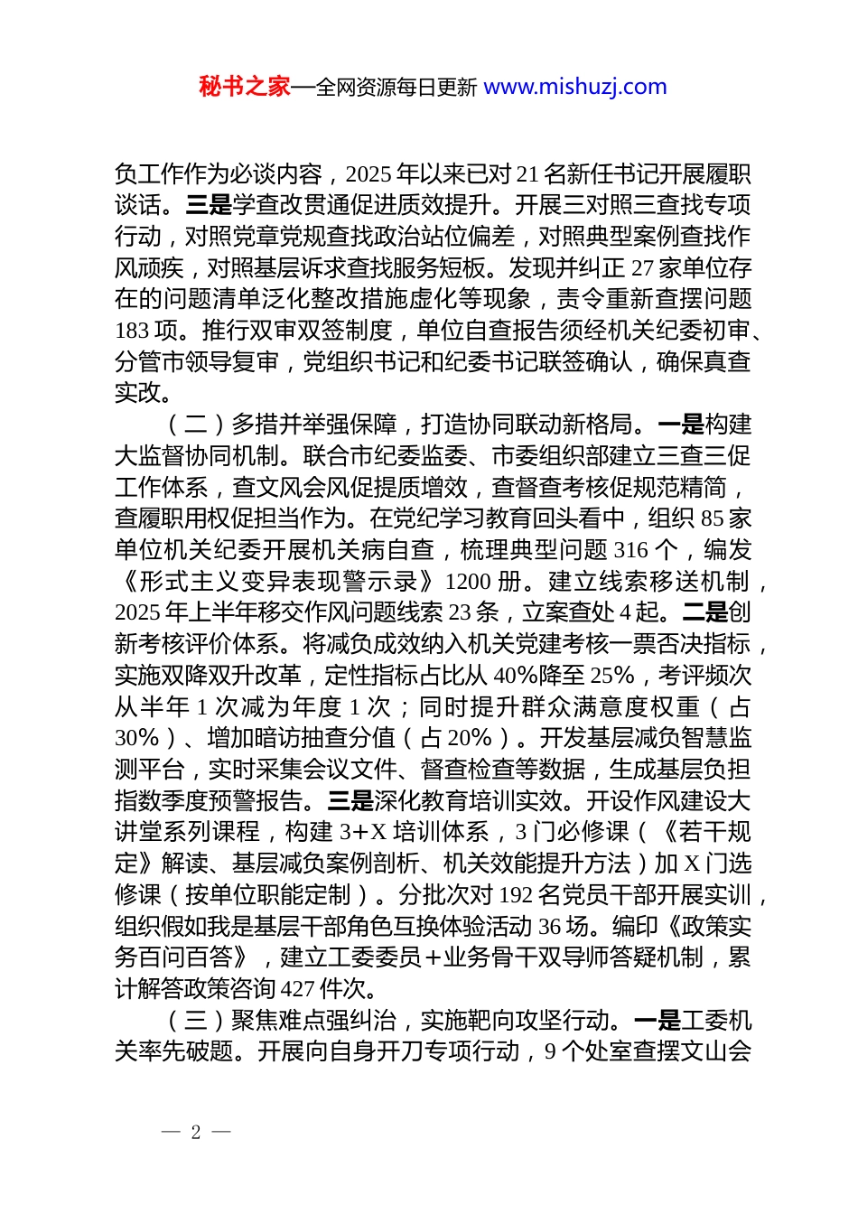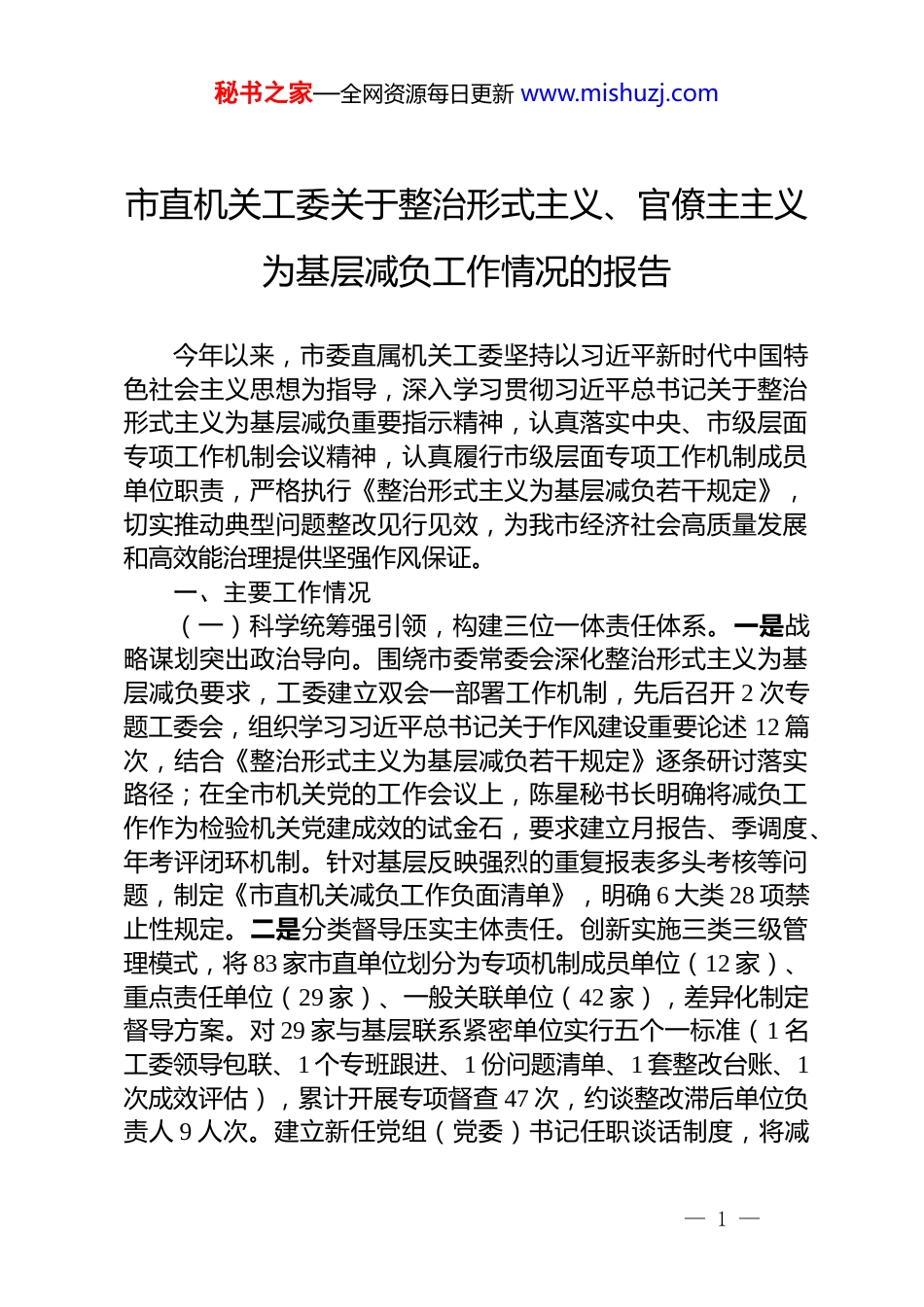 秘书之家—全网资源每日更新 www.mishuzj.com市直机关工委关于整治形式主义、官僚主主义为基层减负工作情况的报告今年以来,市委直属机关工委坚持以习近平新时代中国特色社会主义思想为指导,深入学习贯彻习近平总书记关于整治形式主义为基层减负重要指示精神,认真落实中央、市级层面专项工作机制会议精神,认真履行市级层面专项工作机制成员单位职责,严格执行《整治形式主义为基层减负若干规定》,切实推动典型问题整改见行见效,为我市经济社会高质量发展和高效能治理提供坚强作风保证。一、主要工作情况(一)科学统筹强引领,构建三位一体责任体系。一是战略谋划突出政治导向。围绕市委常委会深化整治形式主义为基层减负要求,工委建立双会一部署工作机制,先后召开 2 次专题工委会,组织学习习近平总书记关于作风建设重要论述 12 篇次,结合《整治形式主义为基层减负若干规定》逐条研讨落实路径;在全市机关党的工作会议上,陈星秘书长明确将减负工作作为检验机关党建成效的试金石,要求建立月报告、季调度、年考评闭环机制。针对基层反映强烈的重复报表多头考核等问题,制定《市直机关减负工作负面清单》,明确 6 大类 28 项禁止性规定。二是分类督导压实主体责任。创新实施三类三级管理模式,将 83 家市直单位划分为专项机制成员单位(12 家)、重点责任单位(29 家)、一般关联单位(42 家),差异化制定督导方案。对 29 家与基层联系紧密单位实行五个一标准(1 名工委领导包联、1 个专班跟进、1 份问题清单、1 套整改台账、1次成效评估),累计开展专项督查 47 次,约谈整改滞后单位负责人 9 人次。建立新任党组(党委)书记任职谈话制度,将减— 1 —秘书之家—全网资源每日更新 www.mishuzj.com负工作作为必谈内容,2025 年以来已对 21 名新任书记开展履职谈话。三是学查改贯通促进质效提升。开展三对照三查找专项行动,对照党章党规查找政治站位偏差,对照典型案例查找作风顽疾,对照基层诉求查找服务短板。发现并纠正 27 家单位存在的问题清单泛化整改措施虚化等现象,责令重新查摆问题183 项。推行双审双签制度,单位自查报告须经机关纪委初审、分管市领导复审,党组织书记和纪委书记联签确认,确保真查实改。(二)多措并举强保障,打造协同联动新格局。一是构建大监督协同机制。联合市纪委监委、市委组织部建立三查三促工作体系,查文风会风促提质增效,查督查考核促规范精简,查履职用权促担当作为。在党纪学习教育回头看中,组织 85 家单位机关纪委开展机关病自查,梳理典型问题 316 个,编发《形式主义变异表现警示录》1200 册。建立线索移送机制,2025 年上半年移交作风问题线索 23 条,立案查处 4 起。二是创新考核评价体系。将减负成效纳入机关党建考核一票否决指标,实施双降双升改革,定性指标占比从 40%降至 25%,考评频次从半年 1 次减为年度 1 次;同时提升群众满意度权重(占30%)、增加暗访抽查分值(占 20%)。开发基层减负智慧监测平台,实时采集会议文件、督查检查等数据,生成基层负担指数季度预警报告。三是深化教育培训实效。开设作风建设大讲堂系列课程,构建 3+X 培训体系,3 门必修课(《若干规定》解读、基层减负案例剖析、机关效能提升方法)加 X 门选修课(按单位职能定制)。分批次对 192 名党员干部开展实训,组织假如我是基层干部角色互换体验活动 36 场。编印《政策实务百问百答》,建立工委委员+业务骨干双导师答疑机制,累计解答政策咨询 427 件次。(三)聚焦难点强纠治,实施靶向攻坚行动。一是工委机关率先破题。开展向自身开刀专项行动,9 个处室查摆文山会— 2 —秘书之家—全网资源每日更新 www.mishuzj.com海过度留痕等 20 项具体问题,制定 21 条整改措施。大幅精简考核指标,取消工作台账厚度活动照片数量等评价标准,会议纪要篇幅压缩 45%。建立基层观测点 12 个,聘请社区工作者、企业办事员等 36 人担任作风监督员。二是重点领域专项治理。针对 21 家涉农、民生部门开展清淤点通堵点行动,市场监管局将 76 项检查事项整合为综合查一...