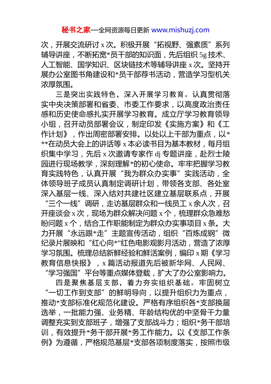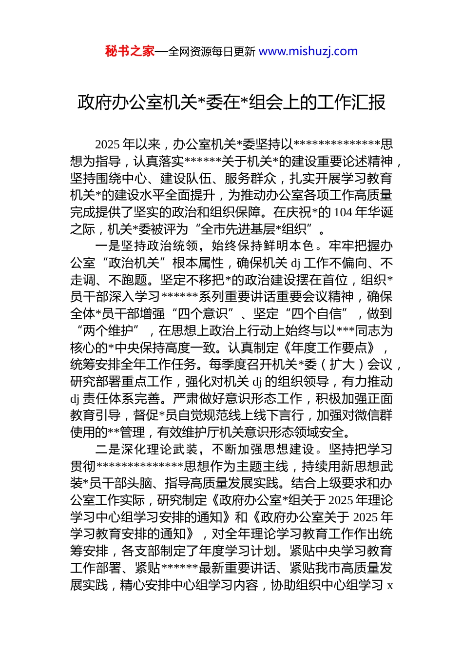 秘书之家—全网资源每日更新 www.mishuzj.com政府办公室机关*委在*组会上的工作汇报2025 年以来,办公室机关*委坚持以**************思想为指导,认真落实******关于机关*的建设重要论述精神,坚持围绕中心、建设队伍、服务群众,扎实开展学习教育机关*的建设水平全面提升,为推动办公室各项工作高质量完成提供了坚实的政治和组织保障。在庆祝*的 104 年华诞之际,机关*委被评为“全市先进基层*组织”。一是坚持政治统领,始终保持鲜明本色。牢牢把握办公室“政治机关”根本属性,确保机关 dj 工作不偏向、不走调、不跑题。坚定不移把*的政治建设摆在首位,组织*员干部深入学习******系列重要讲话重要会议精神,确保全体*员干部增强“四个意识”、坚定“四个自信”,做到“两个维护”,在思想上政治上行动上始终与以***同志为核心的*中央保持高度一致。认真制定《年度工作要点》,统筹安排全年工作任务。每季度召开机关*委(扩大)会议,研究部署重点工作,强化对机关 dj 的组织领导,有力推动dj 责任体系完善。严肃做好意识形态工作,积极加强正面教育引导,督促*员自觉规范线上线下言行,加强对微信群使用的**管理,有效维护厅机关意识形态领域安全。二是深化理论武装,不断加强思想建设。坚持把学习贯彻**************思想作为主题主线,持续用新思想武装*员干部头脑、指导高质量发展实践。结合上级要求和办公室工作实际,研究制定《政府办公室*组关于 2025 年理论学习中心组学习安排的通知》和《政府办公室关于 2025 年学习教育安排的通知》,对全年理论学习教育工作作出统筹安排,各支部制定了年度学习计划。紧贴中央学习教育工作部署、紧贴******最新重要讲话、紧贴我市高质量发展实践,精心安排中心组学习内容,协助组织中心组学习 x秘书之家—全网资源每日更新 www.mishuzj.com次,开展交流研讨 x 次。积极开展“拓视野、强素质”系列辅导讲座,不断拓宽*员干部的知识面,先后组织 5g 技术、人工智能、国学知识、区块链技术等辅导讲座 x 次。坚持开展办公室图书角建设和*员干部荐书活动,营造学习型机关浓厚氛围。三是突出实践特色,深入开展学习教育。认真贯彻落实中央决策部署和省委、市委工作要求,以高度政治责任感和历史使命感扎实开展学习教育。成立厅学习教育领导小组,召开动员部署会议,制定印发《实施方案》和《工作计划》,作出周密部署安排。以处以上干部为重点,以***在动员大会上的讲话等 x 本必读书目为基本教材,每月组织集中学习,先后 x 次邀请专家作 dj 专题讲座,赴烈士陵园进行现场教学,深刻理解*的初心使命。牢牢把握学习教育实践特色,认真开展“我为群众办实事”实践活动,全体领导班子成员认真制定调研计划,带领各支部、各处室深入基层一线、深入结对共建社区建立基层联系点,开展“三个一线”调研,走访基层群众和一线员工 x 余人次,召开座谈会 x 次,现场为群众解决问题 x 个,梳理群众急难愁盼问题 x 个,结合工作职能制定为群众办实事项目 x 条。大力开展“永远跟*走”主题宣传活动,组织“百炼成钢”微纪录片展映和“红心向*”红色电影观影月活动,营造了浓厚学习氛围。梳理总结新鲜经验和鲜活案例,编印 x 期《学习教育信息快报》,x 篇活动报道先后被新华网、人民网、“学习强国”平台等重点媒体登载,扩大了办公室影响力。四是聚焦基层支部,着力夯实组织基础。牢固树立“一切工作到支部”的鲜明导向,以提升组织力为重点,推动*支部标准化规范化建设。严格有序组织各*支部换届选举,一批能力强、业务精、年龄结构优的中坚骨干力量调整充实到支部班子,增强了支部战斗力;组织*务干部培训,有效提升*务干部开展*务工作能力。以《支部工作条例》为遵循,严格规范基层*支部各项制度落实,按照市级秘书之家—全网资源每日更新 www.mishuzj.com机关工委要求召开年度组织生活会,开展*员民主评议活动,及时督促检查通报各支部 dj 履责记实信息平台信息录入情况,做好 2025 年度*费测算和收缴工作,确保支部活动规范有序、日常*务工作顺利开展。按照市级机关工委部署强化对支部和*小组的全程...
