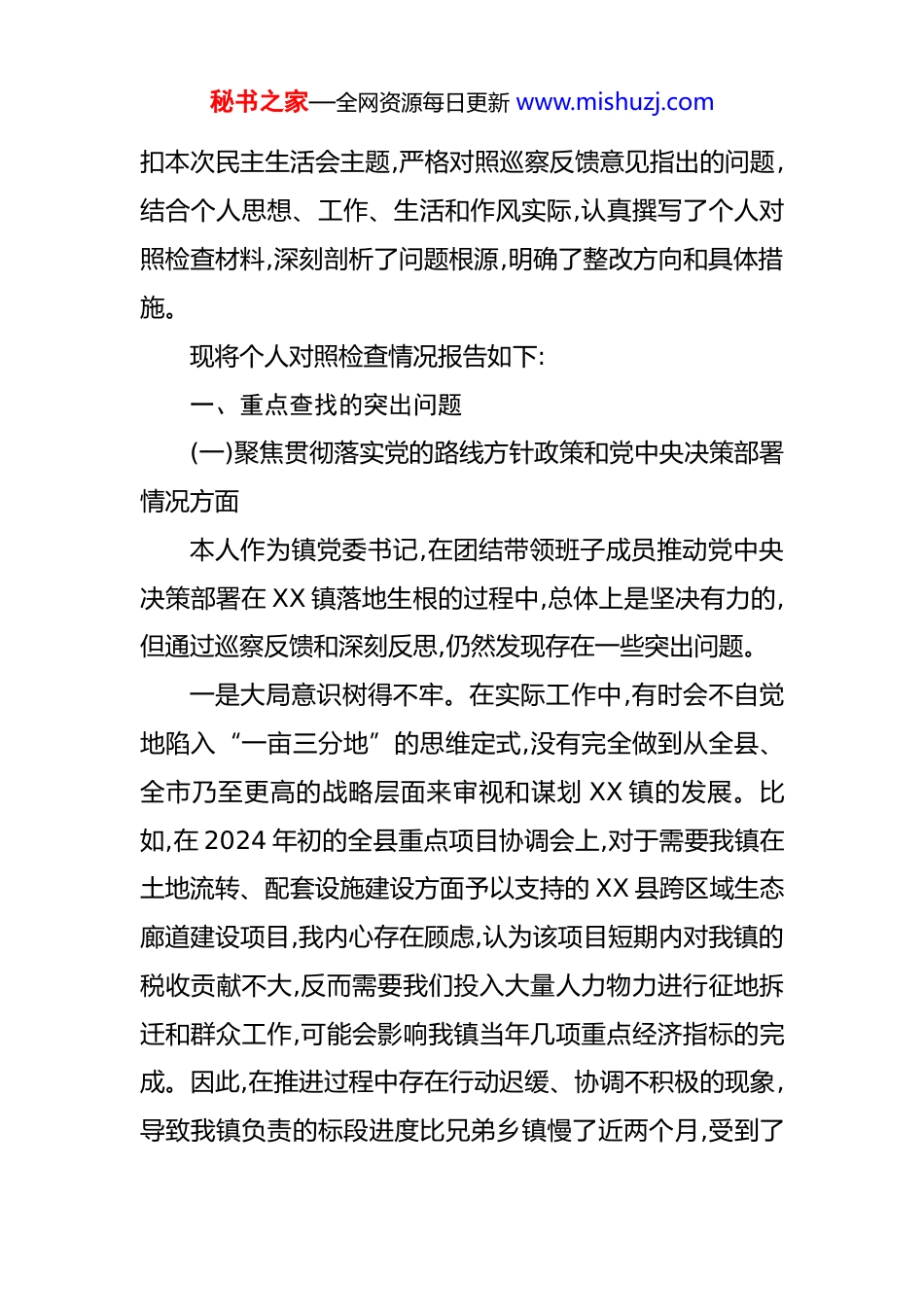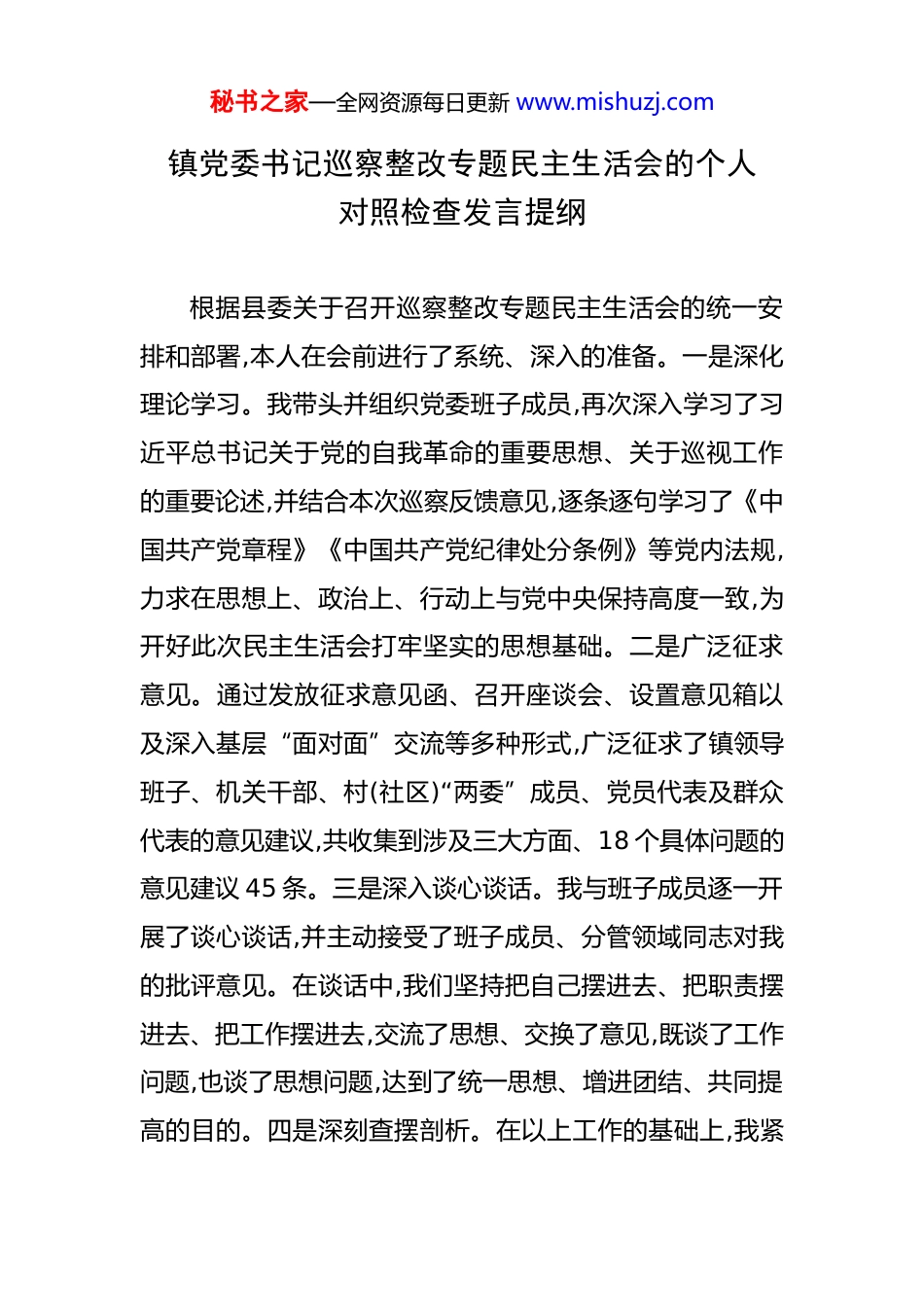 秘书之家—全网资源每日更新 www.mishuzj.com镇党委书记巡察整改专题民主生活会的个人对照检查发言提纲 根据县委关于召开巡察整改专题民主生活会的统一安排和部署,本人在会前进行了系统、深入的准备。一是深化理论学习。我带头并组织党委班子成员,再次深入学习了习近平总书记关于党的自我革命的重要思想、关于巡视工作的重要论述,并结合本次巡察反馈意见,逐条逐句学习了《中国共产党章程》《中国共产党纪律处分条例》等党内法规,力求在思想上、政治上、行动上与党中央保持高度一致,为开好此次民主生活会打牢坚实的思想基础。二是广泛征求意见。通过发放征求意见函、召开座谈会、设置意见箱以及深入基层“面对面”交流等多种形式,广泛征求了镇领导班子、机关干部、村(社区)“两委”成员、党员代表及群众代表的意见建议,共收集到涉及三大方面、18 个具体问题的意见建议 45 条。三是深入谈心谈话。我与班子成员逐一开展了谈心谈话,并主动接受了班子成员、分管领域同志对我的批评意见。在谈话中,我们坚持把自己摆进去、把职责摆进去、把工作摆进去,交流了思想、交换了意见,既谈了工作问题,也谈了思想问题,达到了统一思想、增进团结、共同提高的目的。四是深刻查摆剖析。在以上工作的基础上,我紧秘书之家—全网资源每日更新 www.mishuzj.com扣本次民主生活会主题,严格对照巡察反馈意见指出的问题,结合个人思想、工作、生活和作风实际,认真撰写了个人对照检查材料,深刻剖析了问题根源,明确了整改方向和具体措施。现将个人对照检查情况报告如下:一、重点查找的突出问题(一)聚焦贯彻落实党的路线方针政策和党中央决策部署情况方面本人作为镇党委书记,在团结带领班子成员推动党中央决策部署在 XX 镇落地生根的过程中,总体上是坚决有力的,但通过巡察反馈和深刻反思,仍然发现存在一些突出问题。一是大局意识树得不牢。在实际工作中,有时会不自觉地陷入“一亩三分地”的思维定式,没有完全做到从全县、全市乃至更高的战略层面来审视和谋划 XX 镇的发展。比如,在 2024 年初的全县重点项目协调会上,对于需要我镇在土地流转、配套设施建设方面予以支持的 XX 县跨区域生态廊道建设项目,我内心存在顾虑,认为该项目短期内对我镇的税收贡献不大,反而需要我们投入大量人力物力进行征地拆迁和群众工作,可能会影响我镇当年几项重点经济指标的完成。因此,在推进过程中存在行动迟缓、协调不积极的现象,导致我镇负责的标段进度比兄弟乡镇慢了近两个月,受到了秘书之家—全网资源每日更新 www.mishuzj.com县委的通报批评。又比如,在处理镇域水系治理问题上,我更多考虑的是如何解决我镇辖区内的河道淤积和排污问题,对于上下游乡镇的联防联治联动不够,缺乏系统性思维。2024年汛期,因我镇管理的 XX 河段清淤不及时,导致上游乡镇的洪水下泄不畅,造成了不良影响,这充分暴露了我“各家自扫门前雪”的狭隘观念。二是发展工业新质生产力有欠缺。面对经济下行压力和产业升级要求,对于如何以科技创新引领现代化产业体系建设的思考不深、办法不多,推动新质生产力发展的紧迫感和行动力不足。比如,我镇经济结构长期依赖传统的建材和农产品加工业,2024 年,全镇规模以上工业增加值同比下降了 2.8%,这是近五年来首次出现负增长。其中,作为我镇财政支柱的 XX 建材有限公司,因产品技术含量低、环保压力大,产值同比下滑超过 18%,直接影响了全镇的经济数据。在招商引资工作中,仍然存在“捡到篮子里都是菜”的惯性思维。2024 年全年引进的 6 个工业项目中,有 4 个仍是劳动密集型的传统加工业,只有一个项目与高端装备制造相关,但规模较小,对于优化我镇产业结构、转换增长动能的作用十分有限,反映出我在推动产业向“新”而行、向“质”提升上的谋划和魄力不够。再比如,对于镇内现有的 XX 机械厂等几家有一定技术基础的企业,我虽然口头上强调要支持秘书之家—全网资源每日更新 www.mishuzj.com他们进行数字化、智能化转型,但在具体政策扶持、人才引进、技术对接等方面,缺乏实质性的、精准的服务和推动。至今,全镇 30 多家工业企业中,仅有 2 家启动了初步的自动化生产线改造,距离形成新质生产力还有很...