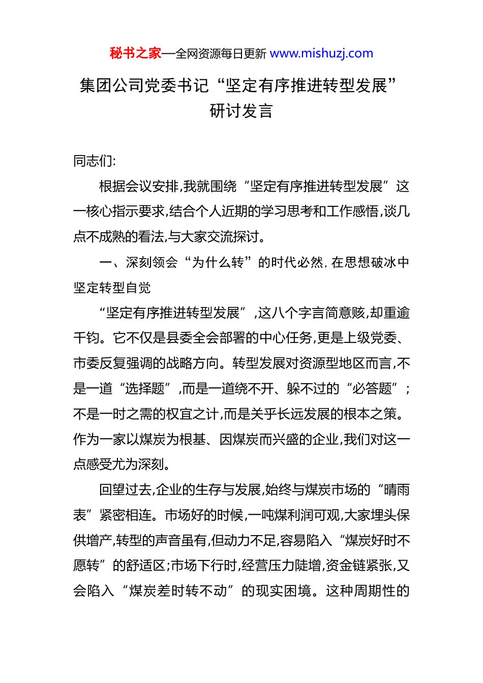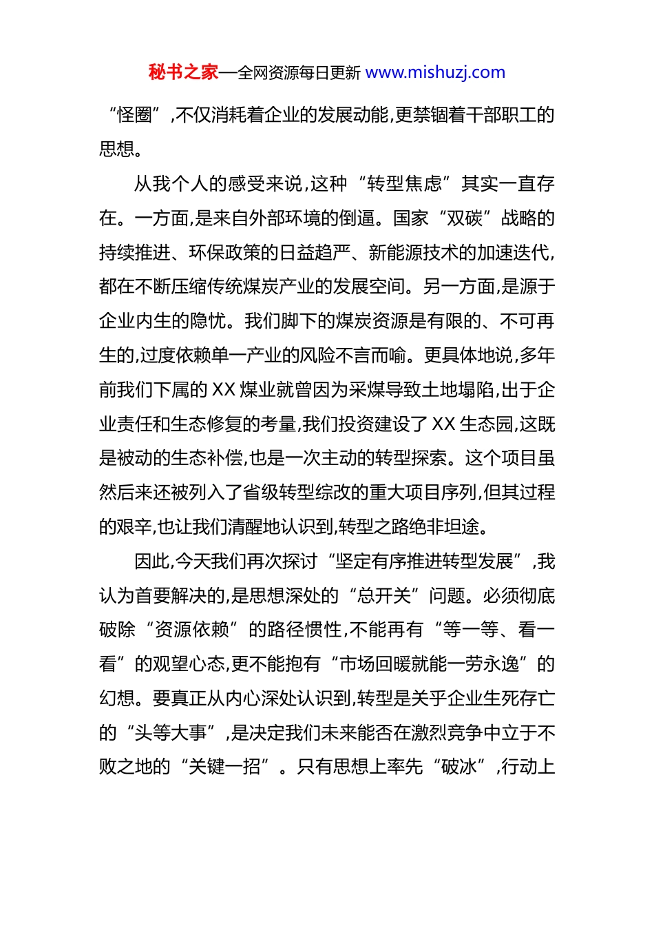 秘书之家—全网资源每日更新 www.mishuzj.com集团公司党委书记“坚定有序推进转型发展”研讨发言 同志们:根据会议安排,我就围绕“坚定有序推进转型发展”这一核心指示要求,结合个人近期的学习思考和工作感悟,谈几点不成熟的看法,与大家交流探讨。一、深刻领会“为什么转”的时代必然,在思想破冰中坚定转型自觉“坚定有序推进转型发展”,这八个字言简意赅,却重逾千钧。它不仅是县委全会部署的中心任务,更是上级党委、市委反复强调的战略方向。转型发展对资源型地区而言,不是一道“选择题”,而是一道绕不开、躲不过的“必答题”;不是一时之需的权宜之计,而是关乎长远发展的根本之策。作为一家以煤炭为根基、因煤炭而兴盛的企业,我们对这一点感受尤为深刻。回望过去,企业的生存与发展,始终与煤炭市场的“晴雨表”紧密相连。市场好的时候,一吨煤利润可观,大家埋头保供增产,转型的声音虽有,但动力不足,容易陷入“煤炭好时不愿转”的舒适区;市场下行时,经营压力陡增,资金链紧张,又会陷入“煤炭差时转不动”的现实困境。这种周期性的秘书之家—全网资源每日更新 www.mishuzj.com“怪圈”,不仅消耗着企业的发展动能,更禁锢着干部职工的思想。从我个人的感受来说,这种“转型焦虑”其实一直存在。一方面,是来自外部环境的倒逼。国家“双碳”战略的持续推进、环保政策的日益趋严、新能源技术的加速迭代,都在不断压缩传统煤炭产业的发展空间。另一方面,是源于企业内生的隐忧。我们脚下的煤炭资源是有限的、不可再生的,过度依赖单一产业的风险不言而喻。更具体地说,多年前我们下属的 XX 煤业就曾因为采煤导致土地塌陷,出于企业责任和生态修复的考量,我们投资建设了 XX 生态园,这既是被动的生态补偿,也是一次主动的转型探索。这个项目虽然后来还被列入了省级转型综改的重大项目序列,但其过程的艰辛,也让我们清醒地认识到,转型之路绝非坦途。因此,今天我们再次探讨“坚定有序推进转型发展”,我认为首要解决的,是思想深处的“总开关”问题。必须彻底破除“资源依赖”的路径惯性,不能再有“等一等、看一看”的观望心态,更不能抱有“市场回暖就能一劳永逸”的幻想。要真正从内心深处认识到,转型是关乎企业生死存亡的“头等大事”,是决定我们未来能否在激烈竞争中立于不败之地的“关键一招”。只有思想上率先“破冰”,行动上秘书之家—全网资源每日更新 www.mishuzj.com才能真正“突围”。这种坚定,不是口号上的,而是要内化于心、外化于行,成为一种战略决心和行动自觉。二、准确把握“转向哪里”的实践路径,在靶向施策中明确转型方位想清楚了“为什么转”,接下来的关键就是“转向哪里”。县委全会提出的“有序”二字,我认为核心要义在于尊重规律、讲求科学、稳扎稳打,不能脱离实际、盲目冒进。对于我们这样一家传统的能源企业,转型发展绝不意味着要另起炉灶、推倒重来,而是要在巩固根基的前提下,进行优势的再造和动能的转换。结合企业实际,我思考有三个主要方向。第一,立足主业,向“精”向“绿”延伸。煤炭是我们的“压舱石”和“稳定器”,任何时候都不能轻易动摇。在当前乃至未来一个时期,扛牢能源保供的政治责任依然是我们的首要任务。但“保供”不等于“傻大黑粗”地挖煤卖煤。转型,首先要从煤炭自身的革命开始。这要求我们必须在存量上做文章,推动产业“升链”。一方面是智能化改造。要持续加大投入,推进工作面无人化、系统智能化,在减人提效、保障安全的同时,实现资源开采效率的最大化。另一方面是绿色化开采。大力推广应用保水开采、充填开采等绿色技术,最大限度减少对生态环境的扰动,改变过去“黑秘书之家—全网资源每日更新 www.mishuzj.com色 GDP”的形象。更重要的是,要推动煤炭由“燃料”向“原料”和“材料”转变。我们过去也曾尝试过构建“采煤—洗煤—炼焦—炼镁”的循环链条,但因种种原因中断。历史的教训值得反思。今天,在新技术、新工艺的支持下,我们是否可以重新审视煤化工、煤基新材料等领域的发展潜力,拉长产业链条,提升产品附加值,真正把资源优势转化为高质量发展的产业优势。第二,适度多元,向“新”向“融”拓展。转型要“有序”,很重要的一点就是“先立后破”。在传...