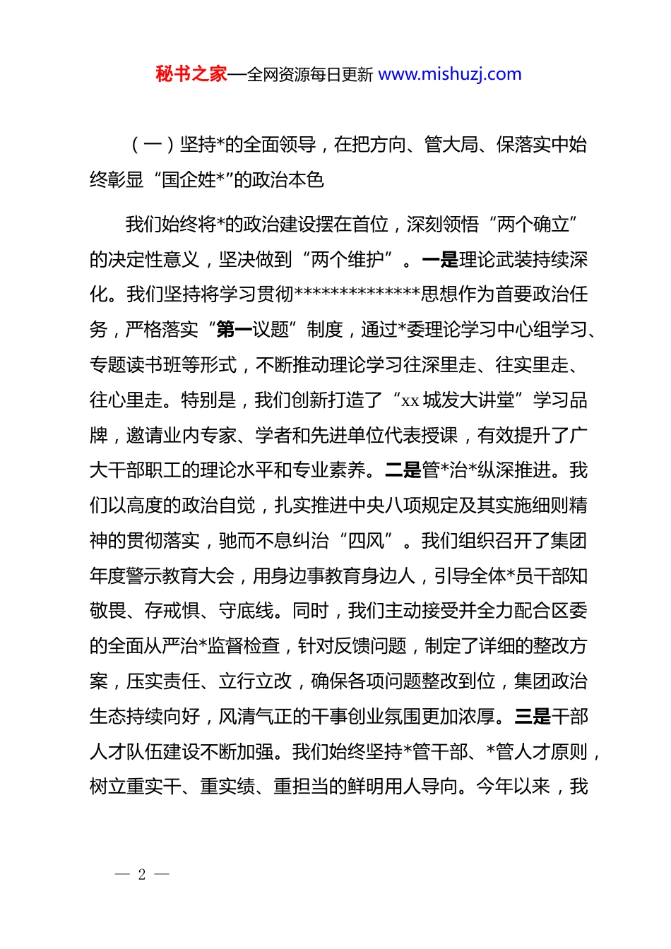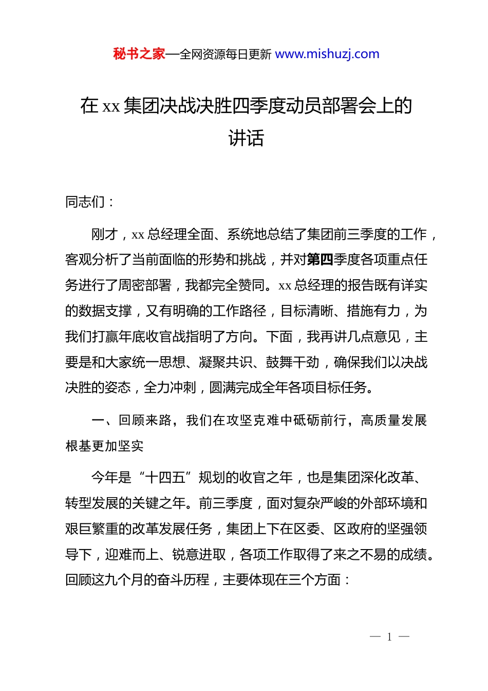 秘书之家—全网资源每日更新 www.mishuzj.com在 xx 集团决战决胜四季度动员部署会上的讲话同志们:刚才,xx 总经理全面、系统地总结了集团前三季度的工作,客观分析了当前面临的形势和挑战,并对第四季度各项重点任务进行了周密部署,我都完全赞同。xx 总经理的报告既有详实的数据支撑,又有明确的工作路径,目标清晰、措施有力,为我们打赢年底收官战指明了方向。下面,我再讲几点意见,主要是和大家统一思想、凝聚共识、鼓舞干劲,确保我们以决战决胜的姿态,全力冲刺,圆满完成全年各项目标任务。一、回顾来路,我们在攻坚克难中砥砺前行,高质量发展根基更加坚实今年是“十四五”规划的收官之年,也是集团深化改革、转型发展的关键之年。前三季度,面对复杂严峻的外部环境和艰巨繁重的改革发展任务,集团上下在区委、区政府的坚强领导下,迎难而上、锐意进取,各项工作取得了来之不易的成绩。回顾这九个月的奋斗历程,主要体现在三个方面:— 1 —秘书之家—全网资源每日更新 www.mishuzj.com(一)坚持*的全面领导,在把方向、管大局、保落实中始终彰显“国企姓*”的政治本色我们始终将*的政治建设摆在首位,深刻领悟“两个确立”的决定性意义,坚决做到“两个维护”。一是理论武装持续深化。我们坚持将学习贯彻**************思想作为首要政治任务,严格落实“第一议题”制度,通过*委理论学习中心组学习、专题读书班等形式,不断推动理论学习往深里走、往实里走、往心里走。特别是,我们创新打造了“xx 城发大讲堂”学习品牌,邀请业内专家、学者和先进单位代表授课,有效提升了广大干部职工的理论水平和专业素养。二是管*治*纵深推进。我们以高度的政治自觉,扎实推进中央八项规定及其实施细则精神的贯彻落实,驰而不息纠治“四风”。我们组织召开了集团年度警示教育大会,用身边事教育身边人,引导全体*员干部知敬畏、存戒惧、守底线。同时,我们主动接受并全力配合区委的全面从严治*监督检查,针对反馈问题,制定了详细的整改方案,压实责任、立行立改,确保各项问题整改到位,集团政治生态持续向好,风清气正的干事创业氛围更加浓厚。三是干部人才队伍建设不断加强。我们始终坚持*管干部、*管人才原则,树立重实干、重实绩、重担当的鲜明用人导向。今年以来,我— 2 —秘书之家—全网资源每日更新 www.mishuzj.com们不仅优化了干部选拔任用机制,更着力于提升干部队伍的专业能力。前不久,我们组织集团中高层管理人员赴大连高级经理学院进行了为期一周的封闭式培训,对标一流企业,学习先进管理经验,进一步开阔了视野、更新了观念、提升了能力,为集团的长远发展储备了坚实的人才力量。(二)牢记初心使命,在服务 xx 区发展大局中充分彰显总平台公司的责任担当作为 xx 区农村城市化和城市建设服务及运营的总平台公司,我们始终胸怀“国之大者”,心系区域发展。一是核心功能定位更加清晰。我们主动融入全区发展战略,在土地一级开发、城中村改造、集体租赁住房建设、城市更新等核心业务领域持续发力。前三季度,我们有力有序推进了 xx 片区、xx 区域等多个重点地块的土地一级开发工作,为区域发展拓展了宝贵空间。同时,我们承担的 xx 村、xx 村等一批重大城中村改造项目取得了阶段性突破,切实改善了群众居住条件,提升了城市面貌。二是经济社会效益同步提升。面对市场压力,我们积极应对,经营业绩实现了稳中有进。据初步统计,集团前三季度营业收入和利润总额均实现了稳健增长,主要经济指标好于预期,为全区经济“压舱石”作用的发挥贡献了力量。我们不仅算经济— 3 —秘书之家—全网资源每日更新 www.mishuzj.com账,更算社会账、民生账,在推进项目建设的同时,高度重视民生保障,妥善解决群众在拆迁腾退、安置补偿等过程中的急难愁盼问题,维护了社会大局的和谐稳定。三是品牌形象影响力不断扩大。通过承接一系列重大项目和民生工程,集团作为区属一级国企的平台作用和市场影响力显著增强。我们与多家央企、市属国企及行业龙头企业建立了战略合作关系,资源整合能力和项目运作水平迈上了新台阶,为更高水平地服务 xx 区发展奠定了...