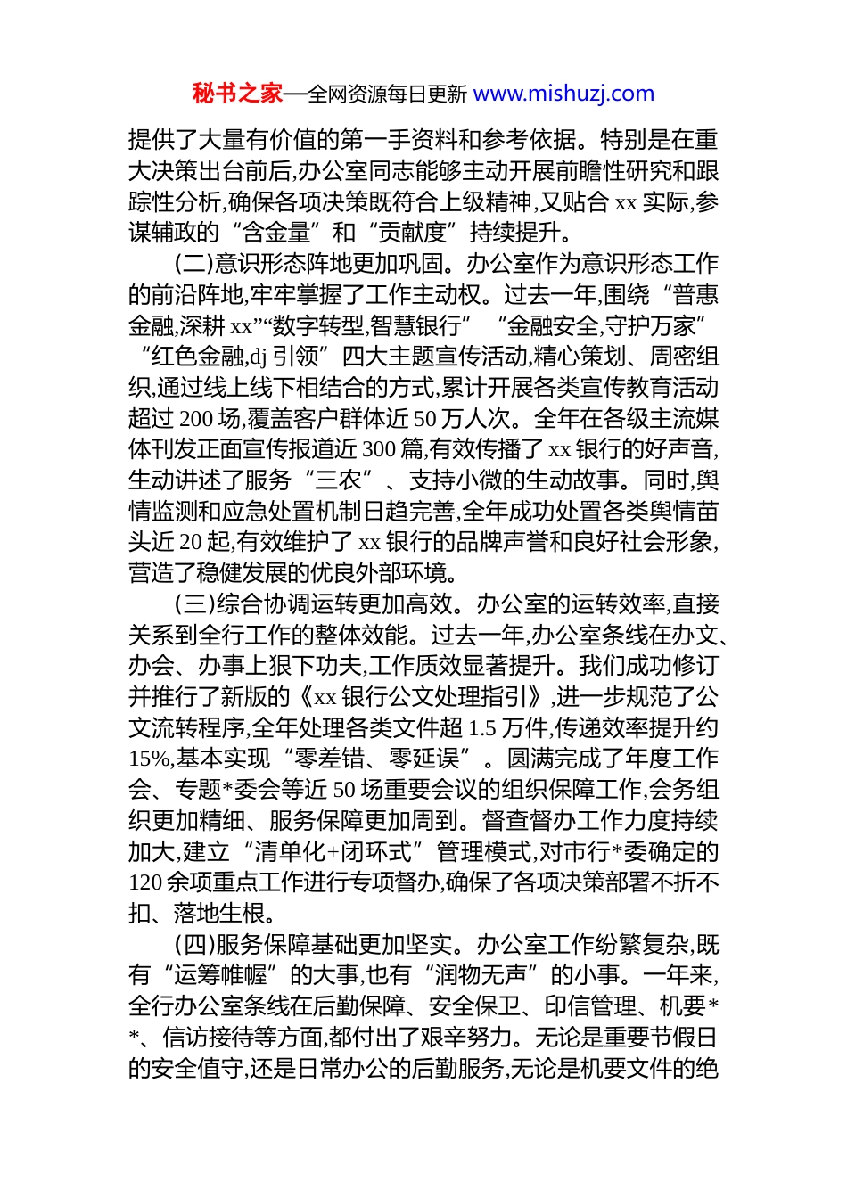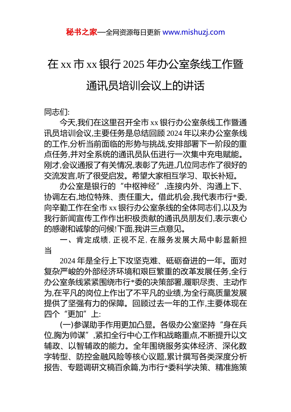 秘书之家—全网资源每日更新 www.mishuzj.com在 xx 市 xx 银行 2025 年办公室条线工作暨通讯员培训会议上的讲话同志们:今天,我们在这里召开全市 xx 银行办公室条线工作暨通讯员培训会议,主要任务是总结回顾 2024 年以来办公室条线的工作,分析当前面临的形势与挑战,安排部署下一阶段的重点任务,并对全系统的通讯员队伍进行一次集中充电赋能。刚才,会议通报了有关情况,表彰了先进,几位同志作了很好的交流发言,听了很受启发。希望大家相互学习、取长补短。办公室是银行的“中枢神经”,连接内外、沟通上下、协调左右,地位特殊、责任重大。借此机会,我代表市行*委,向辛勤工作在全市 xx 银行办公室条线的全体同志们,以及为我行新闻宣传工作作出积极贡献的通讯员朋友们,表示衷心的感谢和诚挚的问候!下面,我讲三点意见。一、肯定成绩,正视不足,在服务发展大局中彰显新担当2024 年是全行上下攻坚克难、砥砺奋进的一年。面对复杂严峻的外部经济环境和艰巨繁重的改革发展任务,全行办公室条线紧紧围绕市行*委的决策部署,履职尽责、主动作为,在平凡的岗位上作出了不平凡的业绩,为全行高质量发展提供了坚强有力的保障。回顾过去一年的工作,主要体现在四个“更加”上:(一)参谋助手作用更加凸显。各级办公室坚持“身在兵位,胸为帅谋”,紧扣全行中心工作和战略重点,不断提升以文辅政、以智辅政的能力。全年围绕服务实体经济、深化数字转型、防控金融风险等核心议题,累计撰写各类深度分析报告、专题调研文稿百余篇,为市行*委科学决策、精准施策秘书之家—全网资源每日更新 www.mishuzj.com提供了大量有价值的第一手资料和参考依据。特别是在重大决策出台前后,办公室同志能够主动开展前瞻性研究和跟踪性分析,确保各项决策既符合上级精神,又贴合 xx 实际,参谋辅政的“含金量”和“贡献度”持续提升。(二)意识形态阵地更加巩固。办公室作为意识形态工作的前沿阵地,牢牢掌握了工作主动权。过去一年,围绕“普惠金融,深耕 xx”“数字转型,智慧银行”“金融安全,守护万家”“红色金融,dj 引领”四大主题宣传活动,精心策划、周密组织,通过线上线下相结合的方式,累计开展各类宣传教育活动超过 200 场,覆盖客户群体近 50 万人次。全年在各级主流媒体刊发正面宣传报道近 300 篇,有效传播了 xx 银行的好声音,生动讲述了服务“三农”、支持小微的生动故事。同时,舆情监测和应急处置机制日趋完善,全年成功处置各类舆情苗头近 20 起,有效维护了 xx 银行的品牌声誉和良好社会形象,营造了稳健发展的优良外部环境。(三)综合协调运转更加高效。办公室的运转效率,直接关系到全行工作的整体效能。过去一年,办公室条线在办文、办会、办事上狠下功夫,工作质效显著提升。我们成功修订并推行了新版的《xx 银行公文处理指引》,进一步规范了公文流转程序,全年处理各类文件超 1.5 万件,传递效率提升约15%,基本实现“零差错、零延误”。圆满完成了年度工作会、专题*委会等近 50 场重要会议的组织保障工作,会务组织更加精细、服务保障更加周到。督查督办工作力度持续加大,建立“清单化+闭环式”管理模式,对市行*委确定的120 余项重点工作进行专项督办,确保了各项决策部署不折不扣、落地生根。(四)服务保障基础更加坚实。办公室工作纷繁复杂,既有“运筹帷幄”的大事,也有“润物无声”的小事。一年来,全行办公室条线在后勤保障、安全保卫、印信管理、机要**、信访接待等方面,都付出了艰辛努力。无论是重要节假日的安全值守,还是日常办公的后勤服务,无论是机要文件的绝秘书之家—全网资源每日更新 www.mishuzj.com对安全,还是来访群众的耐心接待,办公室的同志们始终任劳任怨、默默奉献,用自己的“辛苦指数”换来了全行的“平稳指数”和员工的“幸福指数”。刚才受到表彰的先进单位和个人,就是其中的杰出代表。他们的事迹,集中体现了办公室队伍忠诚、担当、奉行、实干的优秀品质。在充分肯定成绩的同时,我们更要清醒地认识到,对标新时代金融工作的高要求,对标全行高质量发展的新期待,我们的工作还存在一些不容忽视的差距和短板。主要表现为:一是思想观念的“天花板”依然存在。部分同志习惯于按部...