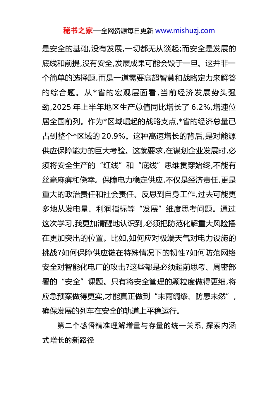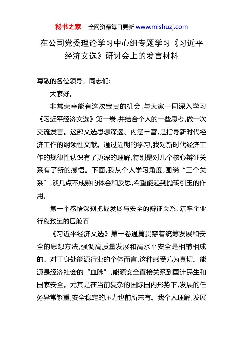 秘书之家—全网资源每日更新 www.mishuzj.com在公司党委理论学习中心组专题学习《习近平经济文选》研讨会上的发言材料 尊敬的各位领导、同志们:大家好。非常荣幸能有这次宝贵的机会,与大家一同深入学习《习近平经济文选》第一卷,并结合个人的一些思考,做一次交流发言。这部文选思想深邃、内涵丰富,是指导新时代经济工作的纲领性文献。通过近期的学习,我对新时代经济工作的规律性认识有了更深的理解,特别是对几个核心辩证关系有了新的感悟。下面,我从个人学习角度,围绕“三个关系”,谈几点不成熟的体会和反思,希望能起到抛砖引玉的作用。第一个感悟深刻把握发展与安全的辩证关系,筑牢企业行稳致远的压舱石《习近平经济文选》第一卷通篇贯穿着统筹发展和安全的思想方法,强调高质量发展和高水平安全是相辅相成的。对于身处能源行业的个体而言,这种感受尤为真切。能源是经济社会的“血脉”,能源安全直接关系到国计民生和国家安全。尤其是在当前复杂的国际国内形势下,发展的任务异常繁重,安全稳定的压力也前所未有。我个人理解,发展秘书之家—全网资源每日更新 www.mishuzj.com是安全的基础,没有发展,一切都无从谈起;而安全是发展的底线和前提,没有安全,发展成果可能会毁于一旦。这并非一个简单的选择题,而是一道需要高超智慧和战略定力来解答的综合题。从 *省的宏观层面看 ,当前经济发展势头强劲,2025 年上半年地区生产总值同比增长了 6.2%,增速位居全国前列。作为*区域崛起的战略支点,*省的经济总量已占到整个*区域的 20.9%。这种高速增长的背后,是对能源供应保障能力的巨大考验。这就要求,在谋划企业发展时,必须将安全生产的“红线”和“底线”思维贯穿始终,不能有丝毫麻痹和侥幸。保障电力稳定供应,不仅是经济责任,更是重大的政治责任和社会责任。反思到自身工作,过去可能更多地从发电量、利润指标等“发展”维度思考问题。通过这次学习,我更加清醒地认识到,必须把防范化解重大风险摆在更加突出的位置。比如,如何应对极端天气对电力设施的挑战?如何保障供应链在特殊情况下的韧性?如何防范网络安全对智能化电厂的攻击?这些都是必须超前思考、周密部署的“安全”课题。只有将安全管理的颗粒度做得更细,将应急预案做得更实,才能真正做到“未雨绸缪、防患未然”,确保发展的列车在安全的轨道上平稳运行。第二个感悟精准理解增量与存量的统一关系,探索内涵式增长的新路径秘书之家—全网资源每日更新 www.mishuzj.com文选深刻阐述了“统筹好做优增量和盘活存量的关系”这一重要论断。这为我们指明了在高质量发展阶段,如何优化资源配置、提升发展效能的关键路径。过去,我们的发展模式在很大程度上依赖于“铺摊子”式的增量扩张。而现在,随着资源环境约束趋紧,单纯依靠增量投入难以为继,必须在“盘活存量”上做足文章。做优增量,意味着发展要有质量、有效益。这不仅是新上马项目的规模,更关键的是项目的技术先进性、绿色环保性以及未来的盈利能力。当前,*省的能源结构正在发生深刻变革,光伏装机容量已突破4282 万千瓦,成为省内第一大电源。我们公司近年来在*地区大力推进的新能源项目,正是“做优增量”的具体实践。在项目推进过程中,如何兼顾生态保护,如何通过土地流转等方式带动地方百姓共同受益,这些都是“优”的题中应有之义,体现了以人民为中心的发展思想。盘活存量,则是一门更大的学问,考验的是“螺蛳壳里做道场”的内功。我们公司拥有相当规模的传统火电资产,这既是保障能源安全的“基本盘”,也是需要不断优化升级的“存量”。如何通过技术改造提升机组效率、降低煤耗和碳排放?如何提升机组的灵活性以更好地适应新能源的波动性?如何将粉煤灰等固废“变废为宝”,实现资源化利用?这些都是盘活存量的具体课题。比如,公司在现有电厂探索生物质气化耦合发电的技术秘书之家—全网资源每日更新 www.mishuzj.com路径,就是通过技术创新赋予存量资产新价值的有益尝试,实现了存量带动增量的良性互动。我体会到,增量与存量的关系,如同鸟之两翼、车之双轮,不可偏废。未来的工作思路,应是在积极谋划优质增量项目的同时,投入更多精力去挖掘存量资产的潜力,通过精细化管理、数字化转型和技术...