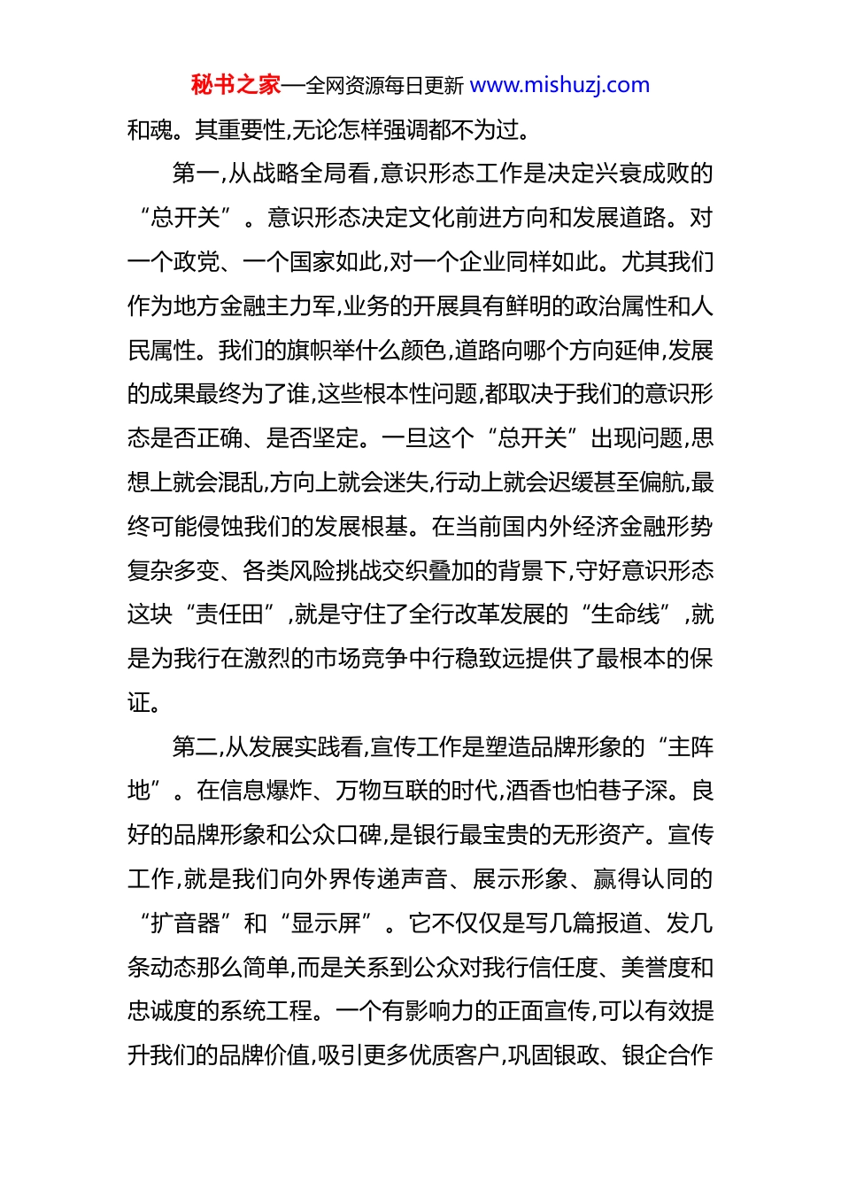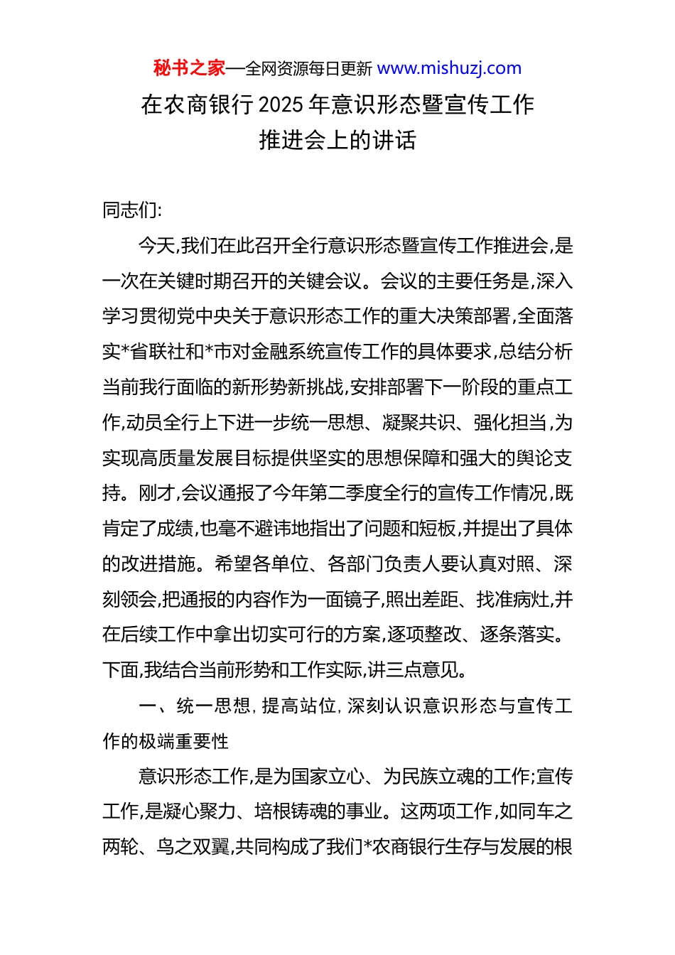 秘书之家—全网资源每日更新 www.mishuzj.com在农商银行 2025 年意识形态暨宣传工作推进会上的讲话 同志们:今天,我们在此召开全行意识形态暨宣传工作推进会,是一次在关键时期召开的关键会议。会议的主要任务是,深入学习贯彻党中央关于意识形态工作的重大决策部署,全面落实*省联社和*市对金融系统宣传工作的具体要求,总结分析当前我行面临的新形势新挑战,安排部署下一阶段的重点工作,动员全行上下进一步统一思想、凝聚共识、强化担当,为实现高质量发展目标提供坚实的思想保障和强大的舆论支持。刚才,会议通报了今年第二季度全行的宣传工作情况,既肯定了成绩,也毫不避讳地指出了问题和短板,并提出了具体的改进措施。希望各单位、各部门负责人要认真对照、深刻领会,把通报的内容作为一面镜子,照出差距、找准病灶,并在后续工作中拿出切实可行的方案,逐项整改、逐条落实。下面,我结合当前形势和工作实际,讲三点意见。一、统一思想,提高站位,深刻认识意识形态与宣传工作的极端重要性意识形态工作,是为国家立心、为民族立魂的工作;宣传工作,是凝心聚力、培根铸魂的事业。这两项工作,如同车之两轮、鸟之双翼,共同构成了我们*农商银行生存与发展的根秘书之家—全网资源每日更新 www.mishuzj.com和魂。其重要性,无论怎样强调都不为过。第一,从战略全局看,意识形态工作是决定兴衰成败的“总开关”。意识形态决定文化前进方向和发展道路。对一个政党、一个国家如此,对一个企业同样如此。尤其我们作为地方金融主力军,业务的开展具有鲜明的政治属性和人民属性。我们的旗帜举什么颜色,道路向哪个方向延伸,发展的成果最终为了谁,这些根本性问题,都取决于我们的意识形态是否正确、是否坚定。一旦这个“总开关”出现问题,思想上就会混乱,方向上就会迷失,行动上就会迟缓甚至偏航,最终可能侵蚀我们的发展根基。在当前国内外经济金融形势复杂多变、各类风险挑战交织叠加的背景下,守好意识形态这块“责任田”,就是守住了全行改革发展的“生命线”,就是为我行在激烈的市场竞争中行稳致远提供了最根本的保证。第二,从发展实践看,宣传工作是塑造品牌形象的“主阵地”。在信息爆炸、万物互联的时代,酒香也怕巷子深。良好的品牌形象和公众口碑,是银行最宝贵的无形资产。宣传工作,就是我们向外界传递声音、展示形象、赢得认同的“扩音器”和“显示屏”。它不仅仅是写几篇报道、发几条动态那么简单,而是关系到公众对我行信任度、美誉度和忠诚度的系统工程。一个有影响力的正面宣传,可以有效提升我们的品牌价值,吸引更多优质客户,巩固银政、银企合作秘书之家—全网资源每日更新 www.mishuzj.com关系;反之,一次负面舆情的应对不力,就可能对我们多年积累的信誉造成难以估量的损害。因此,必须牢牢掌握宣传工作的主动权和话语权,主动设置议题,积极正面发声,把我们服务“三农”、支持小微、践行普惠金融的生动实践和感人故事讲出去、传开来,让“*农商银行”这个金字招牌在*大地上更加闪亮。第三,从内在逻辑看,二者是辩证统一、相辅相成的有机整体。意识形态是里子,是内核,是宣传工作的“源头活水”和“思想罗盘”。没有正确、鲜活、有力的意识形态作支撑,宣传工作就会言之无物、空洞乏味,甚至偏离方向。宣传工作是面子,是外在表现,是意识形态建设的“前沿哨所”和“重要载体”。意识形态的成果,需要通过宣传工作的有效传播,才能真正深入人心、凝聚力量。可以说,意识形态抓得不牢,宣传工作就如同无根之木;宣传工作抓得不实,意识形态的效果就如同空中楼阁。我们必须坚持两手抓、两手硬,把意识形态的“内核”做强,把宣传工作的“外功”做优,实现内聚合力与外塑形象的同频共振、同向发力,为全行“舞龙头、走前列”的战略目标注入不竭的精神动力。二、正视问题,剖析根源,清醒把握当前工作面临的挑战与不足肯定成绩的同时,我们更要以“时时放心不下”的责任感,清醒地看到工作中存在的短板和弱项。这些问题如果不秘书之家—全网资源每日更新 www.mishuzj.com能及时有效解决,必将成为我们前进道路上的“绊脚石”。一是在思想认识层面,存在“上热中温下凉”的现象。从总行党委层面,对意识形态和宣传工作是高度重视的,反复...