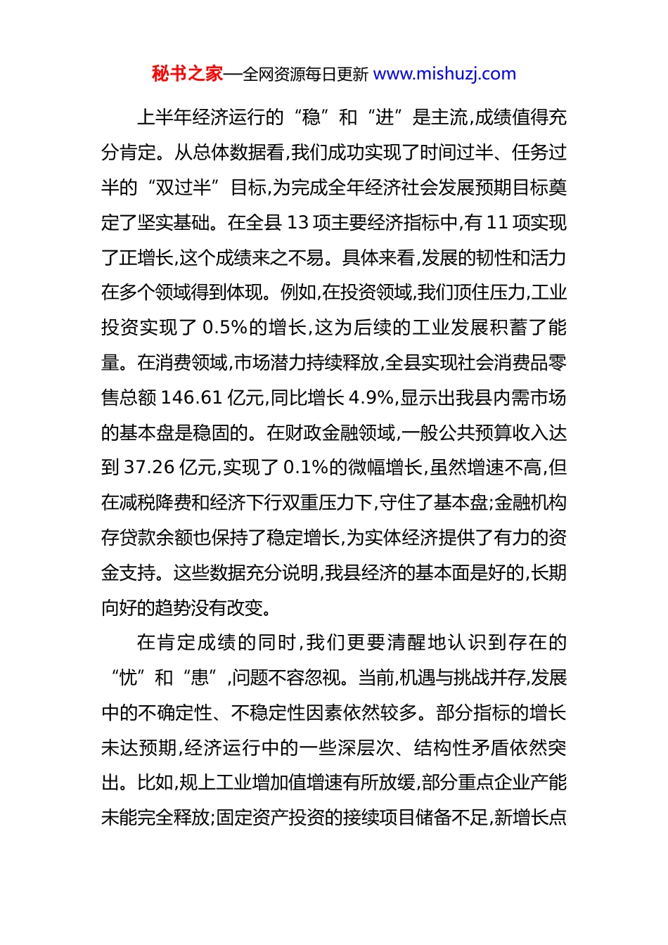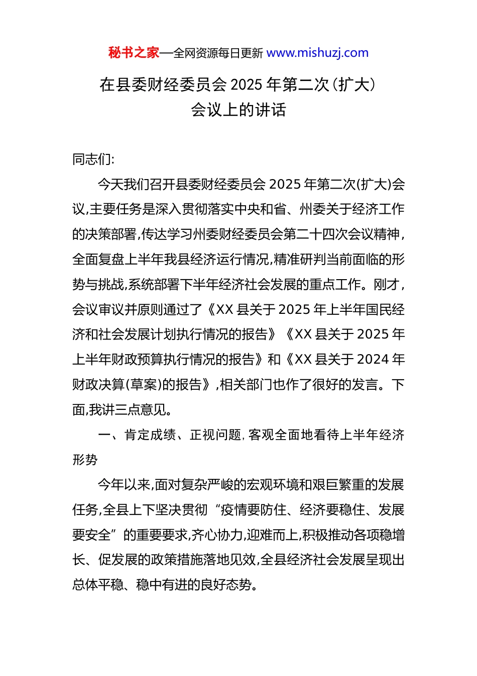 秘书之家—全网资源每日更新 www.mishuzj.com在县委财经委员会 2025 年第二次(扩大)会议上的讲话 同志们:今天我们召开县委财经委员会 2025 年第二次(扩大)会议,主要任务是深入贯彻落实中央和省、州委关于经济工作的决策部署,传达学习州委财经委员会第二十四次会议精神,全面复盘上半年我县经济运行情况,精准研判当前面临的形势与挑战,系统部署下半年经济社会发展的重点工作。刚才,会议审议并原则通过了《XX 县关于 2025 年上半年国民经济和社会发展计划执行情况的报告》《XX 县关于 2025 年上半年财政预算执行情况的报告》和《XX 县关于 2024 年财政决算(草案)的报告》,相关部门也作了很好的发言。下面,我讲三点意见。一、肯定成绩、正视问题,客观全面地看待上半年经济形势今年以来,面对复杂严峻的宏观环境和艰巨繁重的发展任务,全县上下坚决贯彻“疫情要防住、经济要稳住、发展要安全”的重要要求,齐心协力,迎难而上,积极推动各项稳增长、促发展的政策措施落地见效,全县经济社会发展呈现出总体平稳、稳中有进的良好态势。秘书之家—全网资源每日更新 www.mishuzj.com上半年经济运行的“稳”和“进”是主流,成绩值得充分肯定。从总体数据看,我们成功实现了时间过半、任务过半的“双过半”目标,为完成全年经济社会发展预期目标奠定了坚实基础。在全县 13 项主要经济指标中,有 11 项实现了正增长,这个成绩来之不易。具体来看,发展的韧性和活力在多个领域得到体现。例如,在投资领域,我们顶住压力,工业投资实现了 0.5%的增长,这为后续的工业发展积蓄了能量。在消费领域,市场潜力持续释放,全县实现社会消费品零售总额 146.61 亿元,同比增长 4.9%,显示出我县内需市场的基本盘是稳固的。在财政金融领域,一般公共预算收入达到 37.26 亿元,实现了 0.1%的微幅增长,虽然增速不高,但在减税降费和经济下行双重压力下,守住了基本盘;金融机构存贷款余额也保持了稳定增长,为实体经济提供了有力的资金支持。这些数据充分说明,我县经济的基本面是好的,长期向好的趋势没有改变。在肯定成绩的同时,我们更要清醒地认识到存在的“忧”和“患”,问题不容忽视。当前,机遇与挑战并存,发展中的不确定性、不稳定性因素依然较多。部分指标的增长未达预期,经济运行中的一些深层次、结构性矛盾依然突出。比如,规上工业增加值增速有所放缓,部分重点企业产能未能完全释放;固定资产投资的接续项目储备不足,新增长点秘书之家—全网资源每日更新 www.mishuzj.com培育亟待加强;财政收支平衡压力持续加大,政府性债务风险防范化解任务依然艰巨。对于这些薄弱环节和潜在风险,我们必须坚持问题导向,以“时时放心不下”的责任感和紧迫感,高度重视,拧紧发条,靠前发力,采取更加精准有力的措施切实加以解决,决不能有丝毫的麻痹和懈怠。二、聚焦关键、精准发力,以钉钉子精神抓好下半年重点工作做好下半年经济工作,事关全年目标的顺利实现,事关“十四五”规划的稳步推进,意义重大。全县各级各部门必须牢固树立“全县一盘棋”的思想,锚定目标、精准施策,以关键环节的突破带动全局工作提升。第一,要全力抓好经济运行调度,巩固稳中向好的发展态势。发展和改革部门要切实发挥好牵头抓总的作用,强化对经济运行的监测、分析和预警功能。要建立更加精细化的指标分析和任务分解机制,将全年目标、季度目标、月度目标层层落实到具体部门、具体项目和具体责任人。对于上半年“11 升 2 降”中的下降指标,要逐项分析原因,找准问题症结,会同行业主管部门制定针对性的补救措施和提升方案,确保迎头赶上。要加强与上级部门的沟通对接,及时掌握政策动向和工作要求,确保我们的工作节奏与上级部署同频共振。秘书之家—全网资源每日更新 www.mishuzj.com第二,要全力抓好实体经济支撑,夯实高质量发展的产业根基。实体经济是我们的立县之本、强县之基。农业方面,要抓好抓实秋收工作,确保粮食颗粒归仓。同时,要加快特色经济作物的采收和销售,提升农业附加值。要科学有序地推进牛羊出栏和适时补栏,优化畜牧业产业结构,促进农牧民稳定增收。工业方面,要强化工业运行监测调度,坚持“一企一策”,深入企业一线解决生产经营中遇到...
