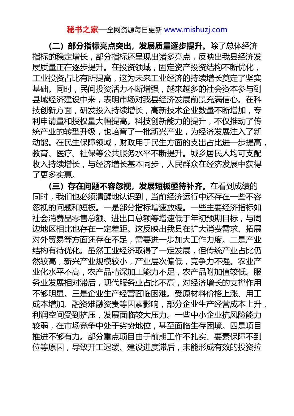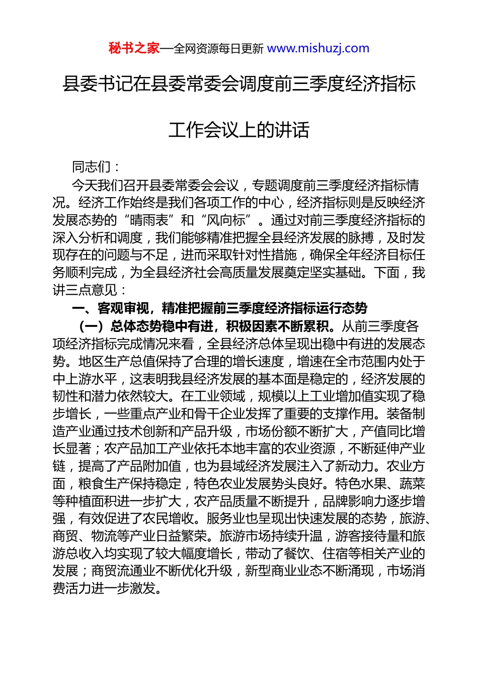 秘书之家—全网资源每日更新 www.mishuzj.com县委书记在县委常委会调度前三季度经济指标工作会议上的讲话同志们:今天我们召开县委常委会会议,专题调度前三季度经济指标情况。经济工作始终是我们各项工作的中心,经济指标则是反映经济发展态势的“晴雨表”和“风向标”。通过对前三季度经济指标的深入分析和调度,我们能够精准把握全县经济发展的脉搏,及时发现存在的问题与不足,进而采取针对性措施,确保全年经济目标任务顺利完成,为全县经济社会高质量发展奠定坚实基础。下面,我讲三点意见:一、客观审视,精准把握前三季度经济指标运行态势(一)总体态势稳中有进,积极因素不断累积。从前三季度各项经济指标完成情况来看,全县经济总体呈现出稳中有进的发展态势。地区生产总值保持了合理的增长速度,增速在全市范围内处于中上游水平,这表明我县经济发展的基本面是稳定的,经济发展的韧性和潜力依然较大。在工业领域,规模以上工业增加值实现了稳步增长,一些重点产业和骨干企业发挥了重要的支撑作用。装备制造产业通过技术创新和产品升级,市场份额不断扩大,产值同比增长显著;农产品加工产业依托本地丰富的农业资源,不断延伸产业链,提高了产品附加值,也为县域经济发展注入了新动力。农业方面,粮食生产保持稳定,特色农业发展势头良好。特色水果、蔬菜等种植面积进一步扩大,农产品质量不断提升,品牌影响力逐步增强,有效促进了农民增收。服务业也呈现出快速发展的态势,旅游、商贸、物流等产业日益繁荣。旅游市场持续升温,游客接待量和旅游总收入均实现了较大幅度增长,带动了餐饮、住宿等相关产业的发展;商贸流通业不断优化升级,新型商业业态不断涌现,市场消费活力进一步激发。秘书之家—全网资源每日更新 www.mishuzj.com(二)部分指标亮点突出,发展质量逐步提升。除了总体经济指标的稳定增长,部分指标还呈现出诸多亮点,反映出我县经济发展质量正在逐步提升。在投资领域,固定资产投资结构不断优化,工业投资占比有所提高,这为未来工业经济的持续增长奠定了坚实基础。同时,民间投资活力不断增强,越来越多的社会资本参与到县域经济建设中来,表明市场对我县经济发展前景充满信心。在科技创新方面,研发投入持续增长,高新技术企业数量不断增加,专利申请量和授权量大幅提高。科技创新能力的提升,不仅推动了传统产业的转型升级,也培育了一批新兴产业,为经济发展注入了新动能。在民生保障领域,财政用于民生方面的支出占比进一步提高,教育、医疗、社保等公共服务水平不断提升。城乡居民人均可支配收入持续增长,与经济增长基本同步,人民群众在经济发展中获得了更多实惠。(三)存在问题不容忽视,发展短板亟待补齐。在看到成绩的同时,我们也必须清醒地认识到,当前经济运行中还存在一些不容忽视的问题和短板。一是部分指标增速放缓。一些主要经济指标如社会消费品零售总额、进出口总额等增速低于年初预期目标,与周边地区相比也存在一定差距。这反映出我县在扩大消费需求、拓展对外贸易等方面还存在不足,需要进一步加大工作力度。二是产业结构有待优化。虽然工业经济取得了一定发展,但传统产业占比仍然较高,新兴产业规模较小,产业层次偏低,竞争力不强。农业产业化水平不高,农产品精深加工能力不足,农产品附加值较低。服务业发展相对滞后,现代服务业占比不高,对经济增长的支撑作用不够明显。三是企业生产经营面临困难。受原材料价格上涨、用工成本增加、融资难融资贵等因素影响,部分企业生产经营成本上升,利润空间受到挤压,发展面临较大压力。一些中小企业抗风险能力较弱,在市场竞争中处于劣势地位,甚至面临生存困境。四是项目推进不够有力。部分重点项目由于前期工作不扎实、要素保障不到位等原因,导致开工迟缓、建设进度滞后,未能形成有效的投资拉秘书之家—全网资源每日更新 www.mishuzj.com动。项目储备不足,缺乏大项目、好项目的支撑,经济发展后劲有待进一步增强。二、靶向施策,全力冲刺四季度确保全年目标任务完成(一)聚焦工业经济,强化支撑稳增长。工业是县域经济的支柱产业,稳住工业经济就稳住了全县经济发展的...