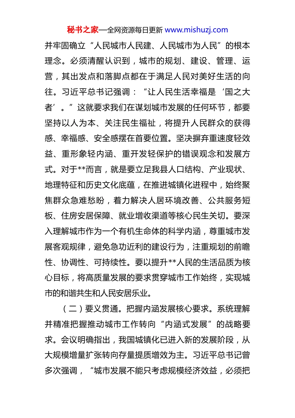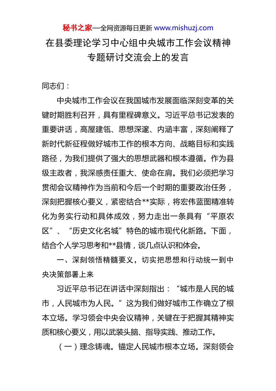 秘书之家—全网资源每日更新 www.mishuzj.com在县委理论学习中心组中央城市工作会议精神专题研讨交流会上的发言 同志们:中央城市工作会议在我国城市发展面临深刻变革的关键时期胜利召开,具有里程碑意义。习近平总书记发表的重要讲话,高屋建瓴、思想深邃、内涵丰富,深刻阐释了新时代新征程做好城市工作的根本方向、战略目标和实践路径,为我们提供了强大的思想武器和根本遵循。作为县级主政者,我深感责任重大、使命在肩。我们必须把学习贯彻会议精神作为当前和今后一个时期的重要政治任务,深刻把握核心要义,紧密结合**实际,将宏伟蓝图精准转化为务实行动和具体成效,努力走出一条具有“平原农区”、“历史文化名城”特色的城市现代化新路。下面,结合个人学习思考和**县情,谈几点认识和体会。一、深刻领悟精髓要义,切实把思想和行动统一到中央决策部署上来习近平总书记在讲话中深刻指出:“城市是人民的城市,人民城市为人民。”这为我们做好城市工作确立了根本立场。学习领会中央会议精神,关键在于把握其精神实质和核心要义,用以武装头脑、指导实践、推动工作。(一)理念铸魂。锚定人民城市根本立场。深刻领会秘书之家—全网资源每日更新 www.mishuzj.com并牢固确立“人民城市人民建、人民城市为人民”的根本理念。必须清醒认识到,城市的规划、建设、管理、运营,其出发点和落脚点都在于满足人民对美好生活的向往。习近平总书记强调:“让人民生活幸福是‘国之大者’。”这就要求我们在谋划城市发展的任何环节,都要坚持以人为本、关注民生福祉,将提升人民群众的获得感、幸福感、安全感摆在首要位置。坚决摒弃重速度轻效益、重形象轻内涵、重开发轻保护的错误观念和发展方式。对于**而言,就是要立足我县人口结构、产业现状、地理特征和历史文化底蕴,在推进城镇化进程中,始终聚焦群众急难愁盼,着力解决人居环境改善、公共服务短板、住房安居保障、就业增收渠道等核心民生关切。要深入理解城市作为一个有机生命体的科学内涵,尊重城市发展客观规律,避免急功近利的建设行为,注重规划的前瞻性、协调性、可持续性。要以提升**人民的生活品质为核心目标,将高质量发展的要求贯穿城市工作始终,实现城市的和谐共生和人民安居乐业。(二)要义贯通。把握内涵发展核心要求。系统理解并精准把握推动城市工作转向“内涵式发展”的战略要求。会议明确指出,我国城镇化已进入新的发展阶段,从大规模增量扩张转向存量提质增效为主。习近平总书记曾多次强调,“城市发展不能只考虑规模经济效益,必须把秘书之家—全网资源每日更新 www.mishuzj.com生态和安全放在更加突出的位置”。这一论断对于我们县级城市发展尤为关键。**作为发展中的县城,必须深刻认识到,未来城市竞争力的提升,关键在于“质”而非单纯“量”的扩张,在于功能的完善而非边界的延伸,在于治理能力的优化而非表面的繁华。要将“创新、宜居、美丽、韧性、文明、智慧”的目标定位,全面融入城市发展的顶层设计和实施路径中。重点强调“优化体系、提升动能、塑造品质、赓续文脉、增进治理、保障安全”等关键维度,形成高质量发展的系统合力。这就亟需我们转变过去比较粗放的城市发展模式,更加注重集约节约利用资源要素,更加注重生态环境容量约束,更加注重基础设施的韧性和可靠性,更加注重文化软实力的培育和城市特色风貌的保护,走绿色低碳、精明增长、可持续的内涵式发展道路。(三)实践对表。校准县域治理重点任务。全面对标并坚决贯彻落实中央部署的七项重点任务。中央会议立足全局和长远,系统部署了优化城市体系、建设创新城市、宜居城市、美丽城市、韧性城市、文明城市、智慧城市等重大任务。这些任务是“以人民为中心”发展思想和“内涵式发展”战略要求的具体展开。对于**而言,落实这些任务必须坚持一切从实际出发。一要强化“组团”意识,深刻认识自身在**省城镇体系和**市域发展格局中的定秘书之家—全网资源每日更新 www.mishuzj.com位,既要主动融入区域协调联动,更要突出发展特色,精准把握“县城为重要载体”的战略机遇,在农业转移人口市民化、城乡融合发展中展现担当。二要突出...