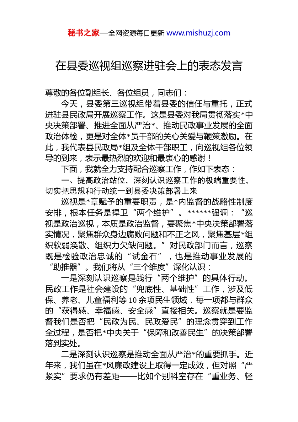 秘书之家—全网资源每日更新 www.mishuzj.com在县委巡视组巡察进驻会上的表态发言尊敬的各位副组长、各位组员,同志们:今天,县委第三巡视组带着县委的信任与重托,正式进驻县民政局开展巡察工作。这是县委对我局贯彻落实*中央决策部署、推进全面从严治*、推动民政事业发展的全面政治体检,更是对全体*员干部的关心关爱与鞭策激励。在此,我代表县民政局*组及全体干部职工,向巡视组各位领导的到来,表示最热烈的欢迎和最衷心的感谢!下面,我就全力支持配合巡察工作,作如下表态:一、提高政治站位,深刻认识巡察工作的极端重要性,切实把思想和行动统一到县委决策部署上来巡视是*章赋予的重要职责,是*内监督的战略性制度安排,根本任务是捍卫“两个维护”。******强调:“巡视是政治巡视,本质是政治监督,要聚焦*中央决策部署落实情况,聚焦群众身边腐败问题和不正之风,聚焦基层*组织软弱涣散、组织力欠缺问题。”对民政部门而言,巡察既是检验政治忠诚的“试金石”,也是推动事业发展的“助推器”。我们将从“三个维度”深化认识:一是深刻认识巡察是践行“两个维护”的具体行动。民政工作是社会建设的“兜底性、基础性”工作,涉及低保、养老、儿童福利等 10 余项民生领域,每一项都与群众的“获得感、幸福感、安全感”直接相关。巡察就是要监督我们是否把“民政为民、民政爱民”的理念贯穿到工作全过程,是否把*中央关于“保障和改善民生”的决策部署落到实处。二是深刻认识巡察是推动全面从严治*的重要抓手。近年来,我们虽在*风廉政建设上取得一定成效,但对照“严紧实”要求仍有差距——比如个别科室存在“重业务、轻秘书之家—全网资源每日更新 www.mishuzj.comdj”倾向,部分干部存在“慢作为、懒作为”问题。巡察就是要帮我们找准“病灶”、挖出“病根”,推动全面从严治*向基层延伸、向纵深发展。三是深刻认识巡察是促进民政事业高质量发展的强大动力。当前,民政工作面临“巩固拓展脱贫攻坚成果同乡村振兴有效衔接”“养老服务体系提质增效”“未成年人保护闭环管理”等新任务,亟需通过巡察发现工作中的薄弱环节,推动我们补短板、强弱项、提质量。二、强化责任担当,全力支持配合,确保巡察工作顺利开展支持配合巡察工作,是我们的政治责任和应尽义务。我们将以“零折扣、零保留、零障碍”的态度,为巡察工作提供最优质的服务保障:一是健全机制强保障。已成立由我任组长、分管副局长任副组长、办公室主任、人事股股长、机关*委专职副书记为成员的巡察工作联络组,具体负责日常沟通协调、资料收集整理、服务保障等工作。联络组实行“24 小时值班制”,确保巡视组的要求第一时间传达、第一时间落实。二是如实提供严纪律。严格按照巡视组要求,全面、客观、准确提供文件资料、会议记录、财务账目、考勤记录等材料,绝不隐瞒事实、绝不弄虚作假、绝不回避问题对巡视组需要了解的情况,将安排相关同志“面对面、点对点”如实汇报,确保巡视组掌握最真实的工作状态。三是畅通渠道听意见。在局机关一楼大厅设置巡察意见箱(钥匙由巡视组专人管理),公布举报电话( xxx-xxxxxxx)和电子邮箱(xxxxxxx@163.com),鼓励干部职工、服务对象和群众积极反映问题。对反映问题的同志,将严格**,绝不打击报复。四是后勤服务优保障。已为巡视组安排独立办公场所,配备电脑、打印机、复印机等设备,提供必要的生活保障将全力做好后勤服务,确保巡视组各位领导工作顺利、生秘书之家—全网资源每日更新 www.mishuzj.com活舒心。三、坚持问题导向,主动认领整改,切实把巡察成果转化为推动工作的实际成效巡察的目的是“发现问题、解决问题、促进发展”。我们将以“闻过则喜、知过不讳、改过不惮”的态度,把整改落实作为当前首要政治任务,做到“即知即改、立行立改、真改实改”:一是主动认领不推诿。对巡视组指出的问题,将照单全收、逐项认领,绝不找借口、绝不推卸责任。将立即召开*组会议,对问题进行“清单化管理”——制定《问题清单》《责任清单》《时限清单》,明确“整改责任人、整改措施、整改时限”,确保每个问题“有人抓、有人管、有人改”。二是深入剖析促...