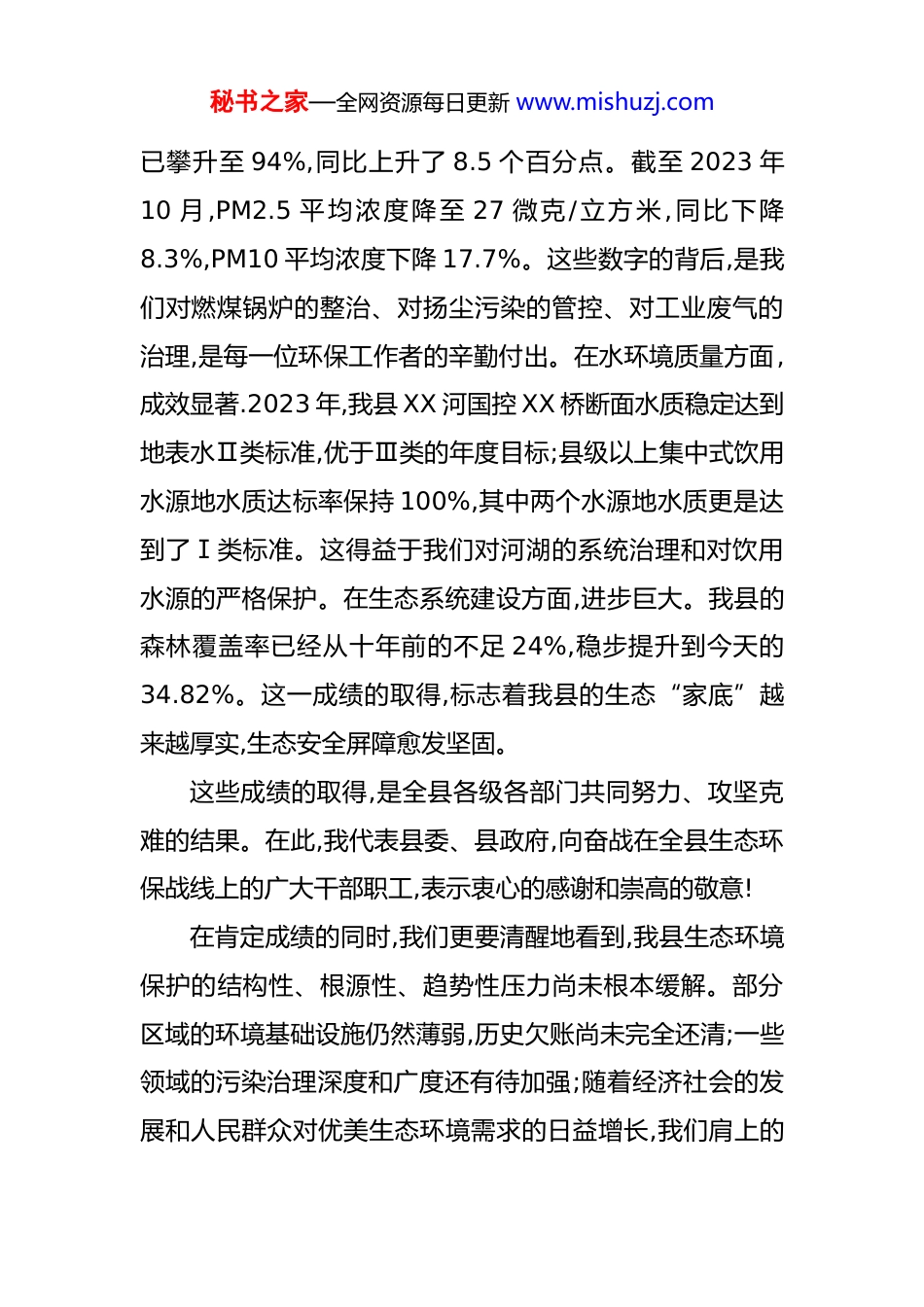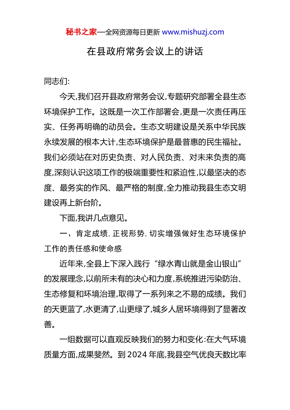 秘书之家—全网资源每日更新 www.mishuzj.com在县政府常务会议上的讲话 同志们:今天,我们召开县政府常务会议,专题研究部署全县生态环境保护工作。这既是一次工作部署会,更是一次责任再压实、任务再明确的动员会。生态文明建设是关系中华民族永续发展的根本大计,生态环境保护是最普惠的民生福祉。我们必须站在对历史负责、对人民负责、对未来负责的高度,深刻认识这项工作的极端重要性和紧迫性,以最坚决的态度、最务实的作风、最严格的制度,全力推动我县生态文明建设再上新台阶。下面,我讲几点意见。一、肯定成绩,正视形势,切实增强做好生态环境保护工作的责任感和使命感近年来,全县上下深入践行“绿水青山就是金山银山”的发展理念,以前所未有的决心和力度,系统推进污染防治、生态修复和环境治理,取得了一系列来之不易的成绩。我们的天更蓝了,水更清了,山更绿了,城乡人居环境得到了显著改善。一组数据可以直观反映我们的努力和变化:在大气环境质量方面,成果斐然。到 2024 年底,我县空气优良天数比率秘书之家—全网资源每日更新 www.mishuzj.com已攀升至 94%,同比上升了 8.5 个百分点。截至 2023 年10 月,PM2.5 平均浓度降至 27 微克/立方米,同比下降8.3%,PM10 平均浓度下降 17.7%。这些数字的背后,是我们对燃煤锅炉的整治、对扬尘污染的管控、对工业废气的治理,是每一位环保工作者的辛勤付出。在水环境质量方面,成效显著.2023 年,我县 XX 河国控 XX 桥断面水质稳定达到地表水Ⅱ类标准,优于Ⅲ类的年度目标;县级以上集中式饮用水源地水质达标率保持 100%,其中两个水源地水质更是达到了Ⅰ类标准。这得益于我们对河湖的系统治理和对饮用水源的严格保护。在生态系统建设方面,进步巨大。我县的森林覆盖率已经从十年前的不足 24%,稳步提升到今天的34.82%。这一成绩的取得,标志着我县的生态“家底”越来越厚实,生态安全屏障愈发坚固。这些成绩的取得,是全县各级各部门共同努力、攻坚克难的结果。在此,我代表县委、县政府,向奋战在全县生态环保战线上的广大干部职工,表示衷心的感谢和崇高的敬意!在肯定成绩的同时,我们更要清醒地看到,我县生态环境保护的结构性、根源性、趋势性压力尚未根本缓解。部分区域的环境基础设施仍然薄弱,历史欠账尚未完全还清;一些领域的污染治理深度和广度还有待加强;随着经济社会的发展和人民群众对优美生态环境需求的日益增长,我们肩上的秘书之家—全网资源每日更新 www.mishuzj.com担子更重、责任更大。我们绝不能有丝毫的松懈和自满,必须以“归零”的心态,重新审视问题,以“冲刺”的姿态,迎接新的挑战。二、深化认识,强化担当,全面压实生态环境保护的政治责任前不久,中央印发了《地方党政领导干部生态环境保护责任制规定》,这为我们地方党政领导干部履职尽责立起了“标尺”,划出了“红线”,打通了责任落实的“最后一公里”。全县各级领导干部要深刻学习领会,把思想和行动统一到中央和省、州决策部署上来。第一,要深刻理解“党政同责、一岗双责”的核心要义。生态环境保护不是环保部门一家的事,而是各级党委、政府的共同责任。各乡镇、各部门的“一把手”是本辖区、本领域生态环境保护的第一责任人,分管领导要严格履行“一岗双责”。要坚持管发展必须管环保、管生产必须管环保、管行业必须管环保,将生态环境保护的要求融入到经济社会发展的各方面和全过程,做到守土有责、守土负责、守土尽责。第二,要建立健全“明责、履责、考责、追责”的闭环体系。制度的生命力在于执行。我们将结合我县实际,尽快制定出台贯彻落实《责任制规定》的具体实施细则。一要秘书之家—全网资源每日更新 www.mishuzj.com制定责任清单。要逐级、逐部门、逐岗位明确生态环境保护的具体职责,确保事事有人管、人人有专责,消除责任盲区。二要强化考核评价。要将生态环境保护工作纳入领导班子和领导干部目标责任考核体系,加大考核权重,将资源消耗、环境损害、生态效益等指标作为评价的重要内容。考核结果要与干部的评优评先、提拔任用直接挂钩,真正发挥考核“指挥棒”作用。三要严格责任追究。对那些在生态环境保护工作中不作为、慢作为、乱作为,甚至敷衍塞责、失职...
