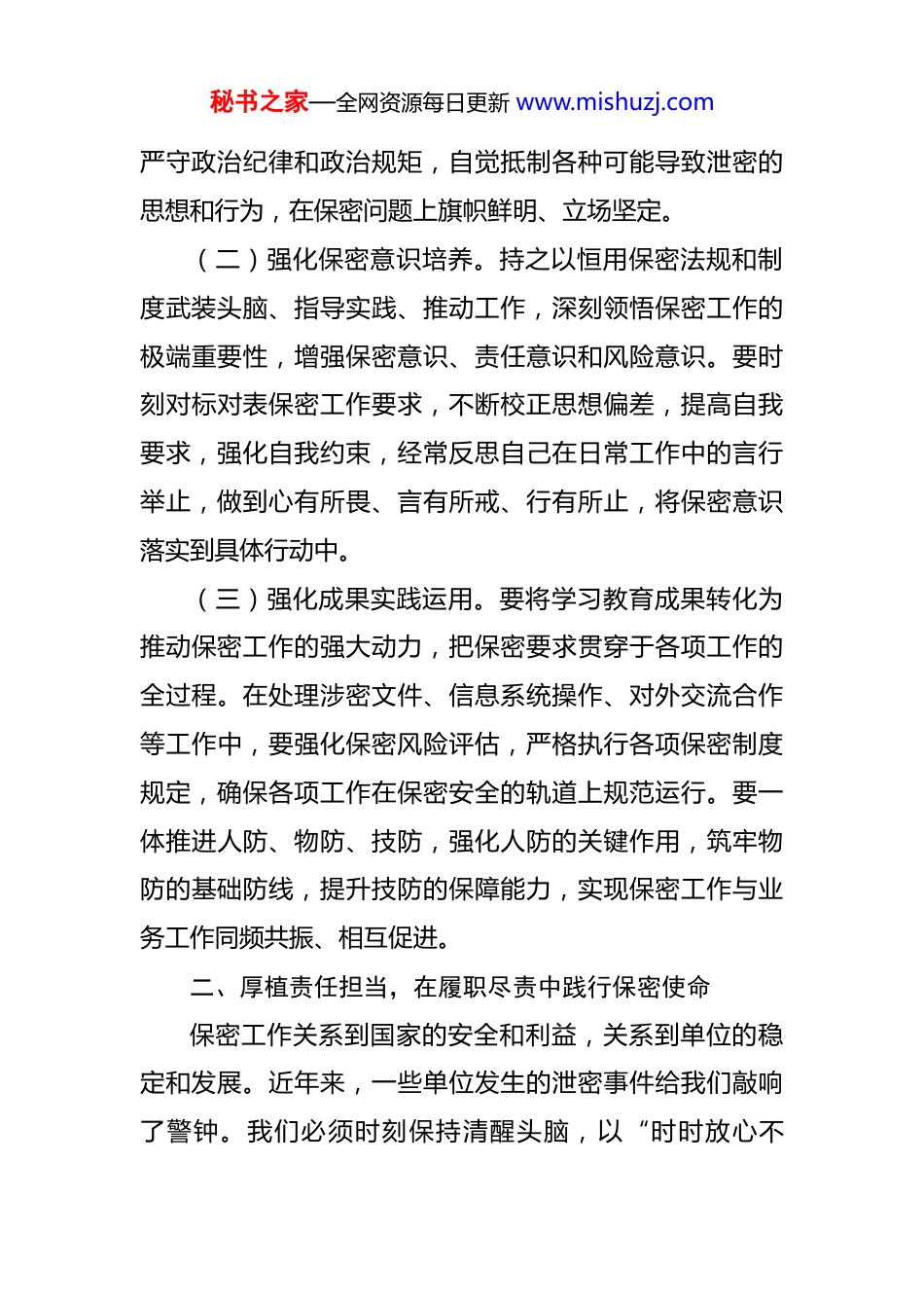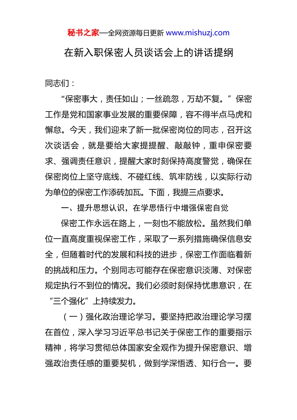 秘书之家—全网资源每日更新 www.mishuzj.com在新入职保密人员谈话会上的讲话提纲 同志们:“保密事大,责任如山;一丝疏忽,万劫不复。”保密工作是党和国家事业发展的重要保障,容不得半点马虎和懈怠。今天,我们迎来了新一批保密岗位的同志,召开这次谈话会,就是要给大家提提醒、敲敲钟,重申保密要求、强调责任意识,提醒大家时刻保持高度警觉,确保在保密岗位上坚守底线、不碰红线、筑牢防线,以实际行动为单位的保密工作添砖加瓦。下面,我提三点要求。一、提升思想认识,在学思悟行中增强保密自觉保密工作永远在路上,一刻也不能放松。虽然我们单位一直高度重视保密工作,采取了一系列措施确保信息安全,但随着时代的发展和科技的进步,保密工作面临着新的挑战和压力。个别同志可能存在保密意识淡薄、对保密规定执行不到位的情况。我们必须时刻保持忧患意识,在“三个强化”上持续发力。(一)强化政治理论学习。要坚持把政治理论学习摆在首位,深入学习习近平总书记关于保密工作的重要指示精神,将学习贯彻总体国家安全观作为提升保密意识、增强政治责任感的重要契机,做到学深悟透、知行合一。要秘书之家—全网资源每日更新 www.mishuzj.com严守政治纪律和政治规矩,自觉抵制各种可能导致泄密的思想和行为,在保密问题上旗帜鲜明、立场坚定。(二)强化保密意识培养。持之以恒用保密法规和制度武装头脑、指导实践、推动工作,深刻领悟保密工作的极端重要性,增强保密意识、责任意识和风险意识。要时刻对标对表保密工作要求,不断校正思想偏差,提高自我要求,强化自我约束,经常反思自己在日常工作中的言行举止,做到心有所畏、言有所戒、行有所止,将保密意识落实到具体行动中。(三)强化成果实践运用。要将学习教育成果转化为推动保密工作的强大动力,把保密要求贯穿于各项工作的全过程。在处理涉密文件、信息系统操作、对外交流合作等工作中,要强化保密风险评估,严格执行各项保密制度规定,确保各项工作在保密安全的轨道上规范运行。要一体推进人防、物防、技防,强化人防的关键作用,筑牢物防的基础防线,提升技防的保障能力,实现保密工作与业务工作同频共振、相互促进。二、厚植责任担当,在履职尽责中践行保密使命保密工作关系到国家的安全和利益,关系到单位的稳定和发展。近年来,一些单位发生的泄密事件给我们敲响了警钟。我们必须时刻保持清醒头脑,以“时时放心不秘书之家—全网资源每日更新 www.mishuzj.com下”的责任感,履行好保密工作职责。(一)树立正确的保密观。要坚持以国家利益为中心的保密工作理念,树立正确的保密观,把保密责任放在首位,不搞形式主义、不走过场,不做表面文章。要真抓实干、埋头苦干,多做打基础、利长远的保密实事,努力创造经得起实践、历史检验的保密业绩。(二)深入学习保密技能。要密切关注保密技术的发展动态,主动学习掌握新的保密技能和方法,不断提高自身的保密工作能力和水平。要积极参加单位组织的保密培训和学习交流活动,倾听专家的意见和建议,不断改进工作方法和工作作风,提高应对保密风险的能力。(三)严格规范保密行为。要加强对保密工作的管理和监督,规范保密行为流程,确保保密工作在严格的制度约束下进行。要严格执行保密制度,坚持依规操作、科学管理、严谨细致,防止因工作疏忽导致泄密事件的发生。要加强对重点领域、关键环节的保密检查,严肃查处各类违规违纪行为,维护保密工作的严肃性。(四)严肃追究泄密责任。要始终保持对泄密行为的零容忍态度,对违反保密规定的行为,发现一起、查处一起,绝不姑息迁就。要加强对典型泄密案例的剖析和通报,发挥警示教育作用,形成强大的震慑效应,让泄密者秘书之家—全网资源每日更新 www.mishuzj.com不敢为、不能为、不想为。三、严守保密纪律,在日常工作中坚守保密底线保密工作无小事,任何一个细微的疏忽都可能导致严重的后果。我们必须时刻保持警醒,严格遵守各项保密纪律规定,确保日常工作中不出现任何泄密问题。(一)严格执行保密制度。全体新入职同志要以身作则、严于律己,严格遵守保密纪律规定及其实施细则精神,坚决抵制和防范违规...