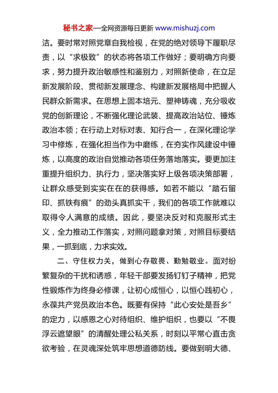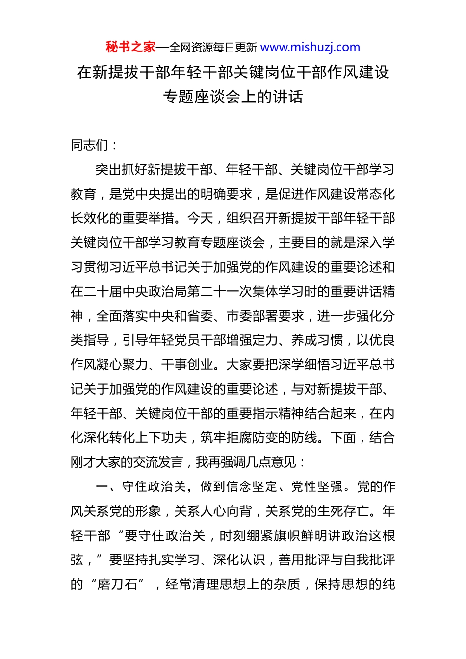 秘书之家—全网资源每日更新 www.mishuzj.com在新提拔干部年轻干部关键岗位干部作风建设专题座谈会上的讲话 同志们:突出抓好新提拔干部、年轻干部、关键岗位干部学习教育,是党中央提出的明确要求,是促进作风建设常态化长效化的重要举措。今天,组织召开新提拔干部年轻干部关键岗位干部学习教育专题座谈会,主要目的就是深入学习贯彻习近平总书记关于加强党的作风建设的重要论述和在二十届中央政治局第二十一次集体学习时的重要讲话精神,全面落实中央和省委、市委部署要求,进一步强化分类指导,引导年轻党员干部增强定力、养成习惯,以优良作风凝心聚力、干事创业。大家要把深学细悟习近平总书记关于加强党的作风建设的重要论述,与对新提拔干部、年轻干部、关键岗位干部的重要指示精神结合起来,在内化深化转化上下功夫,筑牢拒腐防变的防线。下面,结合刚才大家的交流发言,我再强调几点意见:一、守住政治关,做到信念坚定、党性坚强。党的作风关系党的形象,关系人心向背,关系党的生死存亡。年轻干部“要守住政治关,时刻绷紧旗帜鲜明讲政治这根弦,”要坚持扎实学习、深化认识,善用批评与自我批评的“磨刀石”,经常清理思想上的杂质,保持思想的纯秘书之家—全网资源每日更新 www.mishuzj.com洁。要时常对照党章自我检视,在党的绝对领导下履职尽责,以“求极致”的状态将各项工作做好;要明确方向要求,努力提升政治敏感性和鉴别力,对照新使命,在立足新发展阶段、贯彻新发展理念、构建新发展格局中把握人民群众新需求。在思想上固本培元、塑神铸魂,充分吸收党的创新理论,不断强化理论武装、提高政治站位、锤炼政治本领;在行动上对标对表、知行合一,在深化理论学习中修炼,在强化担当作为中磨练,在夯实作风建设中锤炼,以高度的政治自觉推动各项任务落地落实。要更加注重提升组织力、执行力,坚决落实好上级各项决策部署,让群众感受到实实在在的获得感。如若不能以“踏石留印、抓铁有痕”的劲头真抓实干,我们的各项工作就难以取得令人满意的成绩。因此,要坚决反对和克服形式主义,全力推动工作落实,对照问题拿对策,对照目标要结果,一抓到底,力求实效。二、守住权力关,做到心存敬畏、勤勉敬业。面对纷繁复杂的干扰和诱惑,年轻干部要发扬钉钉子精神,把党性锻炼作为终身必修课,让初心成恒心,以恒心践初心,永葆共产党员政治本色。既要有保持“此心安处是吾乡”的定力,以感恩之心对待组织、维护组织,也要以“不畏浮云遮望眼”的清醒处理公私关系,时刻以平常心直击贪欲考验,在灵魂深处筑牢思想道德防线。要做到明大德、秘书之家—全网资源每日更新 www.mishuzj.com守公德、严私德,时刻拧紧理想信念的“总开关”,牢记“我是谁、为了谁、依靠谁”这一根本性问题,自觉做为政以德、心中有党的领导干部。只有坚定理想信念,常怀敬畏之心,增强党性修养,才能做到心不动于微利之诱、目不眩于五色之惑,才能更好为党和人民工作。面对党的纪律规矩,更要做到三省吾身,在守红线明底线中强化法纪意识,淬炼“克己奉公,清廉自守”的廉洁之心。同时要以反面典型案例为戒,向先进典型案例学习,不断强化廉洁从政的思想自觉和行动自觉,切实做到“立身不忘做人之本、为政不移公仆之心、用权不谋一己之私”。要厚植“心中为念农桑苦,耳里如闻饥冻声”的为民情怀,始终牢记“民之所忧,我必念之;民之所盼,我必行之”,以“时不我待”的紧迫感和“放心不下”的责任感,时刻将人民群众的“枝叶小事”当成“头等大事”,永远保持“一股子热劲儿”,情牵“万家忧乐”,守护“万家灯火”,背好“为民行囊”,以“功成不必在我”的境界默默奉献,以“功成必定有我”的担当久久为功,努力做到问政于民、问需于民、问计于民,真正成为人民群众的“贴心人”。三、守住交往关,做到知人而交、择善而从。在新时代的征程中,年轻党员干部肩负着重要的历史使命和责任。然而,要想在复杂多变的社会环境中坚守初心、担当秘书之家—全网资源每日更新 www.mishuzj.com使命,谨慎交友、净化身边的朋友圈至关重要。交友,对于每个人来说都是生活中的重要组成部分,但对于年...