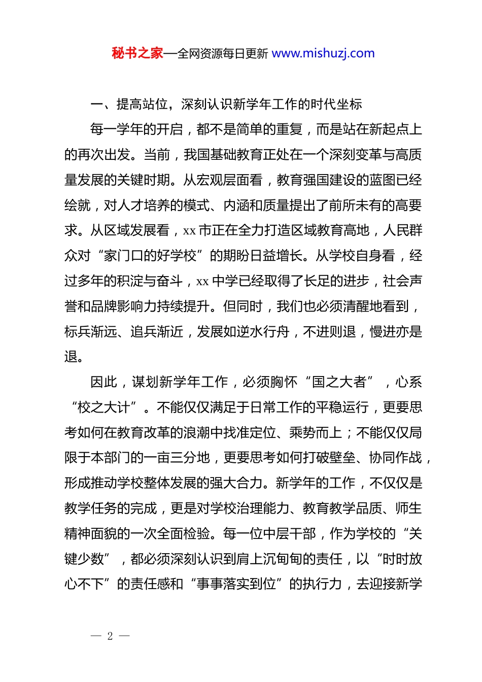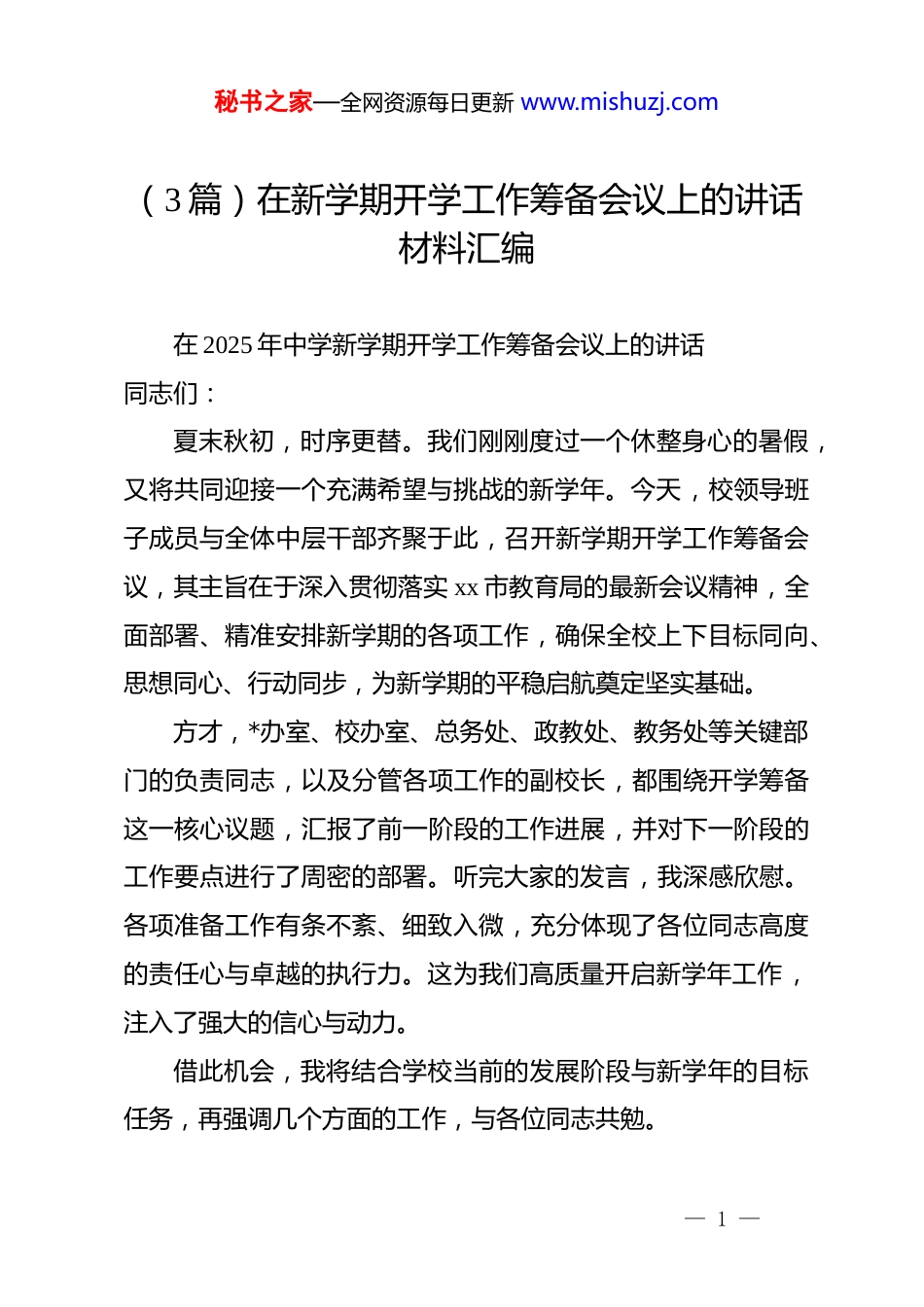 秘书之家—全网资源每日更新 www.mishuzj.com(3 篇)在新学期开学工作筹备会议上的讲话材料汇编在 2025 年中学新学期开学工作筹备会议上的讲话同志们:夏末秋初,时序更替。我们刚刚度过一个休整身心的暑假,又将共同迎接一个充满希望与挑战的新学年。今天,校领导班子成员与全体中层干部齐聚于此,召开新学期开学工作筹备会议,其主旨在于深入贯彻落实 xx 市教育局的最新会议精神,全面部署、精准安排新学期的各项工作,确保全校上下目标同向、思想同心、行动同步,为新学期的平稳启航奠定坚实基础。方才,*办室、校办室、总务处、政教处、教务处等关键部门的负责同志,以及分管各项工作的副校长,都围绕开学筹备这一核心议题,汇报了前一阶段的工作进展,并对下一阶段的工作要点进行了周密的部署。听完大家的发言,我深感欣慰。各项准备工作有条不紊、细致入微,充分体现了各位同志高度的责任心与卓越的执行力。这为我们高质量开启新学年工作,注入了强大的信心与动力。借此机会,我将结合学校当前的发展阶段与新学年的目标任务,再强调几个方面的工作,与各位同志共勉。— 1 —秘书之家—全网资源每日更新 www.mishuzj.com一、提高站位,深刻认识新学年工作的时代坐标每一学年的开启,都不是简单的重复,而是站在新起点上的再次出发。当前,我国基础教育正处在一个深刻变革与高质量发展的关键时期。从宏观层面看,教育强国建设的蓝图已经绘就,对人才培养的模式、内涵和质量提出了前所未有的高要求。从区域发展看,xx 市正在全力打造区域教育高地,人民群众对“家门口的好学校”的期盼日益增长。从学校自身看,经过多年的积淀与奋斗,xx 中学已经取得了长足的进步,社会声誉和品牌影响力持续提升。但同时,我们也必须清醒地看到,标兵渐远、追兵渐近,发展如逆水行舟,不进则退,慢进亦是退。因此,谋划新学年工作,必须胸怀“国之大者”,心系“校之大计”。不能仅仅满足于日常工作的平稳运行,更要思考如何在教育改革的浪潮中找准定位、乘势而上;不能仅仅局限于本部门的一亩三分地,更要思考如何打破壁垒、协同作战,形成推动学校整体发展的强大合力。新学年的工作,不仅仅是教学任务的完成,更是对学校治理能力、教育教学品质、师生精神面貌的一次全面检验。每一位中层干部,作为学校的“关键少数”,都必须深刻认识到肩上沉甸甸的责任,以“时时放心不下”的责任感和“事事落实到位”的执行力,去迎接新学— 2 —秘书之家—全网资源每日更新 www.mishuzj.com年的各项挑战。二、聚焦核心,精准发力推动学校内涵式发展学校工作的核心是育人,中心在质量。新学期,各项工作千头万绪,但必须牢牢抓住以下三个关键着力点,实现从外延扩张向量质齐升的内涵式发展转变。第一,筑牢安全稳定的基石,构建和谐有序的育人环境。安全是学校一切工作的前提和底线,是须臾不可放松的“生命线”。总务处、政教处及相关部门要以最高标准、最严要求,开展全方位、无死角的安全隐患排查。这不仅包括校舍建筑、消防设施、水电线路、食堂卫生的“硬件”安全,更要高度关注师生的心理健康、交通安全、网络安全等“软件”安全。要建立健全学生心理健康预警与干预机制,加强家校沟通,动态掌握学生的思想状况与心理状态,确保问题早发现、早干预、早解决。要持续开展安全 zt 教育,通过应急演练、专题讲座等形式,将安全意识内化为师生的自觉行动。新学期伊始,人员流动频繁,各项工作尚在磨合,是安全事故的易发期。各部门务必绷紧安全之弦,将责任压实到岗、落实到人,以万全之策,确保万无一失,为师生营造一个安心、舒心的工作与学习环境。第二,深化教育教学的改革,打造高质量发展的核心引擎。教学质量是学校的生命线,是赢得社会尊重和家长信赖的根本。— 3 —秘书之家—全网资源每日更新 www.mishuzj.com教务处要牵头抓总,各教研组要深度参与,聚焦“立德树人”根本任务,持续推动课堂教学改革。要坚决摒弃“满堂灌”“题海战”等低效模式,积极探索项目式学习、探究式学习等新方法,真正把课堂还给学生,激发学生的学习兴趣与内在动力,着力培养学生的批判性思维与...