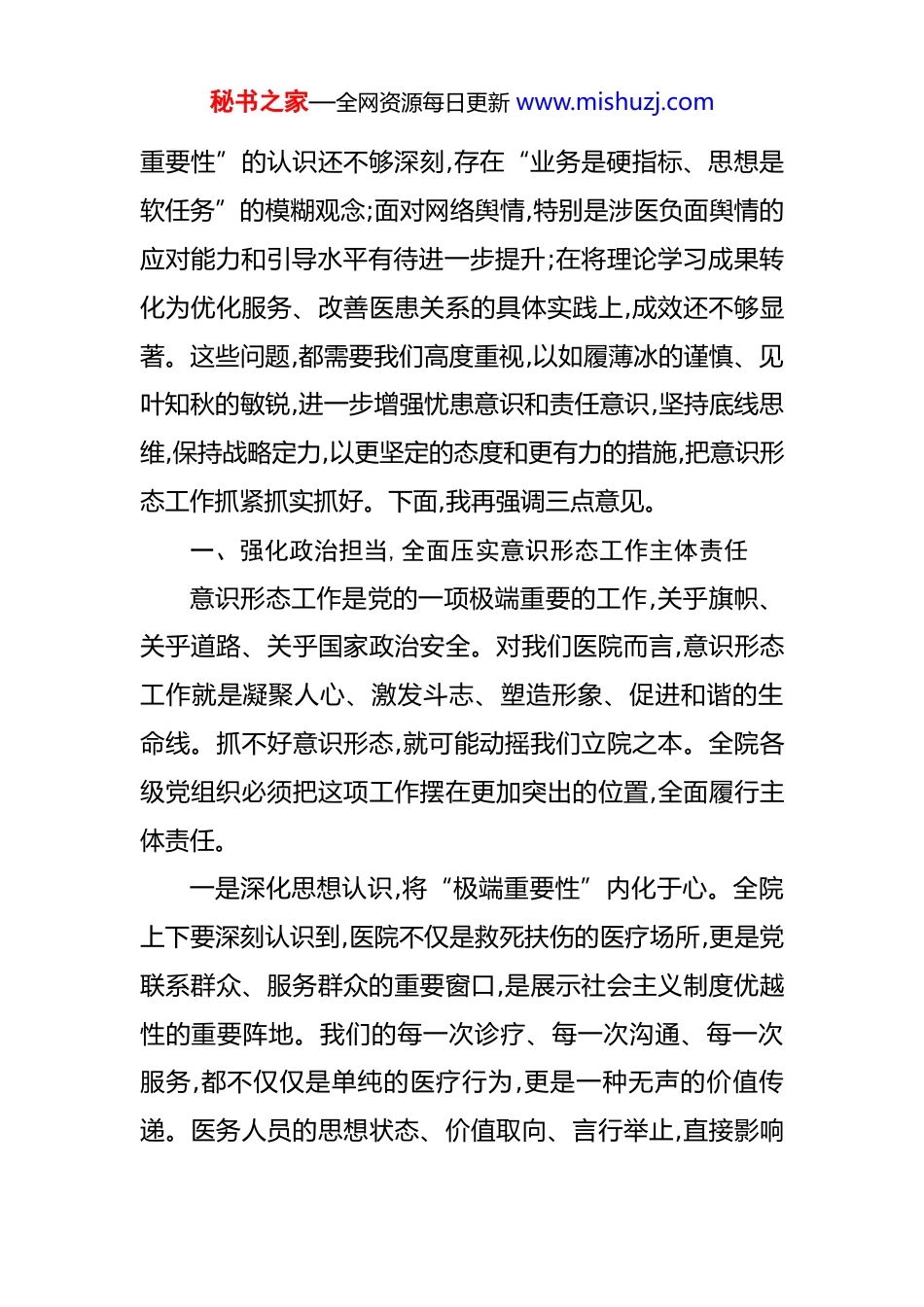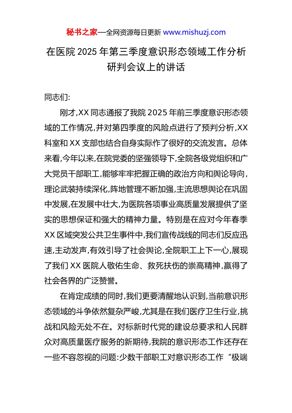 秘书之家—全网资源每日更新 www.mishuzj.com在医院 2025 年第三季度意识形态领域工作分析研判会议上的讲话 同志们:刚才,XX 同志通报了我院 2025 年前三季度意识形态领域的工作情况,并对第四季度的风险点进行了预判分析,XX科室和 XX 支部也结合自身实际作了很好的交流发言。总体来看,今年以来,在院党委的坚强领导下,全院各级党组织和广大党员干部职工,能够牢牢把握正确的政治方向和舆论导向,理论武装持续深化,阵地管理不断加强,主流思想舆论在巩固中发展,在发展中壮大,为医院各项事业高质量发展提供了坚实的思想保证和强大的精神力量。特别是在应对今年春季XX 区域突发公共卫生事件中,我们宣传战线的同志们反应迅速,主动发声,有效引导了社会舆论,全院职工上下一心,展现了我们 XX 医院人敬佑生命、救死扶伤的崇高精神,赢得了社会各界的广泛赞誉。在肯定成绩的同时,我们更要清醒地认识到,当前意识形态领域的斗争依然复杂严峻,尤其是在我们医疗卫生行业,挑战和风险无处不在。对标新时代党的建设总要求和人民群众对高质量医疗服务的新期待,我院的意识形态工作还存在一些不容忽视的问题:少数干部职工对意识形态工作“极端秘书之家—全网资源每日更新 www.mishuzj.com重要性”的认识还不够深刻,存在“业务是硬指标、思想是软任务”的模糊观念;面对网络舆情,特别是涉医负面舆情的应对能力和引导水平有待进一步提升;在将理论学习成果转化为优化服务、改善医患关系的具体实践上,成效还不够显著。这些问题,都需要我们高度重视,以如履薄冰的谨慎、见叶知秋的敏锐,进一步增强忧患意识和责任意识,坚持底线思维,保持战略定力,以更坚定的态度和更有力的措施,把意识形态工作抓紧抓实抓好。下面,我再强调三点意见。一、强化政治担当,全面压实意识形态工作主体责任意识形态工作是党的一项极端重要的工作,关乎旗帜、关乎道路、关乎国家政治安全。对我们医院而言,意识形态工作就是凝聚人心、激发斗志、塑造形象、促进和谐的生命线。抓不好意识形态,就可能动摇我们立院之本。全院各级党组织必须把这项工作摆在更加突出的位置,全面履行主体责任。一是深化思想认识,将“极端重要性”内化于心。全院上下要深刻认识到,医院不仅是救死扶伤的医疗场所,更是党联系群众、服务群众的重要窗口,是展示社会主义制度优越性的重要阵地。我们的每一次诊疗、每一次沟通、每一次服务,都不仅仅是单纯的医疗行为,更是一种无声的价值传递。医务人员的思想状态、价值取向、言行举止,直接影响秘书之家—全网资源每日更新 www.mishuzj.com着患者的就医体验,影响着社会对我们医院乃至整个医疗行业的评价。因此,我们必须彻底摒弃“重业务、轻思想”的错误倾向,把意识形态工作作为党的领导和党的建设的重要内容,与医疗、教学、科研、管理等中心工作同谋划、同部署、同推进、同考核,真正做到守土有责、守土负责、守土尽责。二是健全责任体系,将“一岗双责”外化于行。落实意识形态工作责任制,关键在于构建一个横向到边、纵向到底的责任网络。院党委要切实担负起统一领导、组织协调的主体责任,党委书记是第一责任人,必须旗帜鲜明地站在意识形态工作第一线,带头抓、直接抓、具体抓。班子其他成员要严格落实“一岗双责”,根据分工抓好分管领域和科室的意识形态工作,将责任传导下去。各党支部书记是本支部意识形态工作的第一责任人,要将这项工作融入“三会一课”、主题党日等日常工作中。同时,要把责任链条延伸到科室主任、护士长,他们不仅是业务带头人,更要做科室人员思想上的引路人,及时掌握科室职工的思想动态,做好经常性的思想政治工作,发现苗头性、倾向性问题要第一时间介入、第一时间报告、第一时间处置。我们要将意识形态工作责任制落实情况作为干部考核评价、评优评先、选拔任用的重要依据,对履责不力、造成严重后果的,要严肃追责问秘书之家—全网资源每日更新 www.mishuzj.com责,确保责任不悬空、工作不落虚。三是严肃政治生活,将“纪律规矩”挺立在前。严肃认真的党内政治生活,是锤炼党性、净化思想的“大熔炉”。我们要抓住领导干部这个“关键少数”,带头严格执行《关于新形势下党内政治生活的若干准则》,不断...