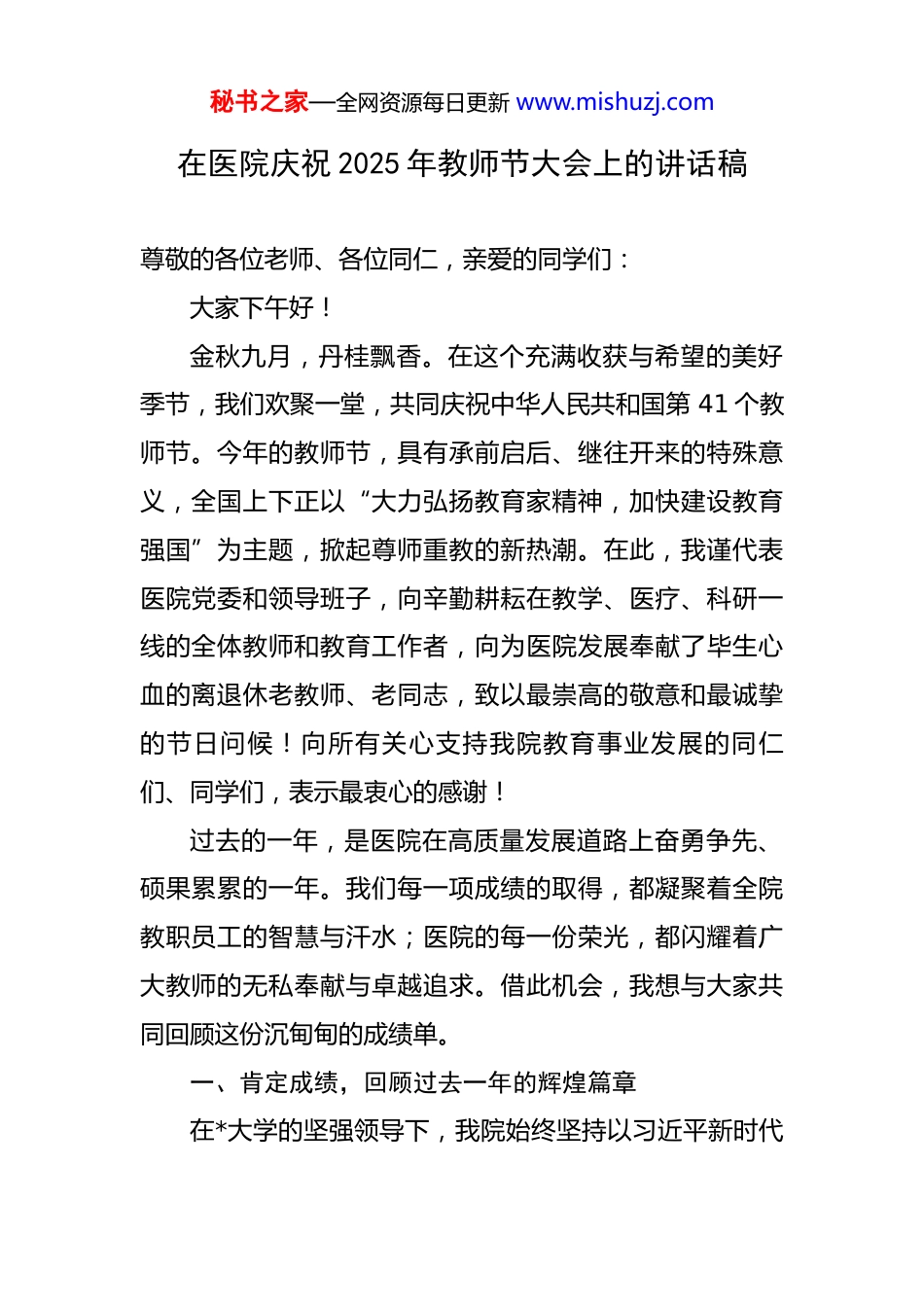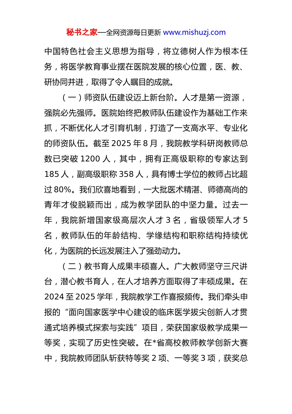 秘书之家—全网资源每日更新 www.mishuzj.com在医院庆祝 2025 年教师节大会上的讲话稿 尊敬的各位老师、各位同仁,亲爱的同学们:大家下午好!金秋九月,丹桂飘香。在这个充满收获与希望的美好季节,我们欢聚一堂,共同庆祝中华人民共和国第 41 个教师节。今年的教师节,具有承前启后、继往开来的特殊意义,全国上下正以“大力弘扬教育家精神,加快建设教育强国”为主题,掀起尊师重教的新热潮。在此,我谨代表医院党委和领导班子,向辛勤耕耘在教学、医疗、科研一线的全体教师和教育工作者,向为医院发展奉献了毕生心血的离退休老教师、老同志,致以最崇高的敬意和最诚挚的节日问候!向所有关心支持我院教育事业发展的同仁们、同学们,表示最衷心的感谢!过去的一年,是医院在高质量发展道路上奋勇争先、硕果累累的一年。我们每一项成绩的取得,都凝聚着全院教职员工的智慧与汗水;医院的每一份荣光,都闪耀着广大教师的无私奉献与卓越追求。借此机会,我想与大家共同回顾这份沉甸甸的成绩单。一、肯定成绩,回顾过去一年的辉煌篇章在*大学的坚强领导下,我院始终坚持以习近平新时代秘书之家—全网资源每日更新 www.mishuzj.com中国特色社会主义思想为指导,将立德树人作为根本任务,将医学教育事业摆在医院发展的核心位置,医、教、研协同并进,取得了令人瞩目的成就。(一)师资队伍建设迈上新台阶。人才是第一资源,强院必先强师。医院始终把教师队伍建设作为基础工作来抓,不断优化人才引育机制,打造了一支高水平、专业化的师资队伍。截至 2025 年 8 月,我院教学科研岗教师总数已突破 1200 人,其中,拥有正高级职称的专家达到185 人,副高级职称 358 人,具有博士学位的教师占比超过 80%。我们欣喜地看到,一大批医术精湛、师德高尚的青年才俊脱颖而出,成为教学团队的中坚力量。过去一年,我院新增国家级高层次人才 3 名,省级领军人才 5名,教师队伍的年龄结构、学缘结构和职称结构持续优化,为医院的长远发展注入了强劲动力。(二)教书育人成果丰硕喜人。广大教师坚守三尺讲台,潜心教书育人,在人才培养方面取得了丰硕成果。在2024 至 2025 学年,我院教学工作喜报频传。我们牵头申报的“面向国家医学中心建设的临床医学拔尖创新人才贯通式培养模式探索与实践”项目,荣获国家级教学成果一等奖,实现了历史性突破。在*省高校教师教学创新大赛中,我院教师团队斩获特等奖 2 项、一等奖 3 项,获奖总秘书之家—全网资源每日更新 www.mishuzj.com数位居全省医疗机构首位。此外,我院教师主编或参编的国家级规划教材达 15 部,3 门课程获评国家级一流本科课程。这些成绩,充分彰显了我院教师深厚的学术功底和卓越的教学水平,也证明了我院在医学人才培养领域的领先地位。(三)科研创新能力显著增强。教学与科研如车之两轮、鸟之双翼,相辅相成,互相促进。我院教师在潜心育人的同时,勇攀科学高峰,取得了一系列高水平的原创性成果。2024 年以来,我院共获批国家重点研发计划项目 3项,国家自然科学基金立项数连续五年突破 100 项,总经费超过 8000 万元。在《细胞》《自然医学》等国际顶尖期刊发表高水平论文 12 篇,展现了我院在前沿基础研究和临床转化领域的强大实力。由我院王*教授领衔的“重大慢性非传染性疾病的智能化防治体系构建与应用”项目,荣获2025 年度*省科学技术进步一等奖,为守护人民生命健康贡献了*智慧和*方案。同志们,老师们,这些成绩的取得,离不开每一位教职员工的辛勤付出。你们是学生成长的引路人,是医院发展的奠基石,是健康中国建设的追梦人。在此,我再次向大家表示最热烈的祝贺和最诚挚的感谢!二、认清形势,勇担新时代的历史使命秘书之家—全网资源每日更新 www.mishuzj.com在肯定成绩的同时,我们更要清醒地认识到所处的历史方位和肩负的时代重任。当今世界正经历百年未有之大变局,新一轮科技革命和产业变革深入发展,对医学教育和人才培养提出了前所未有的新挑战和新要求。(一)深刻领会党和国家的战略部署。党的二十届三中全会审议通过了《中共中央关于进一步全面深化改革、推进中国式...