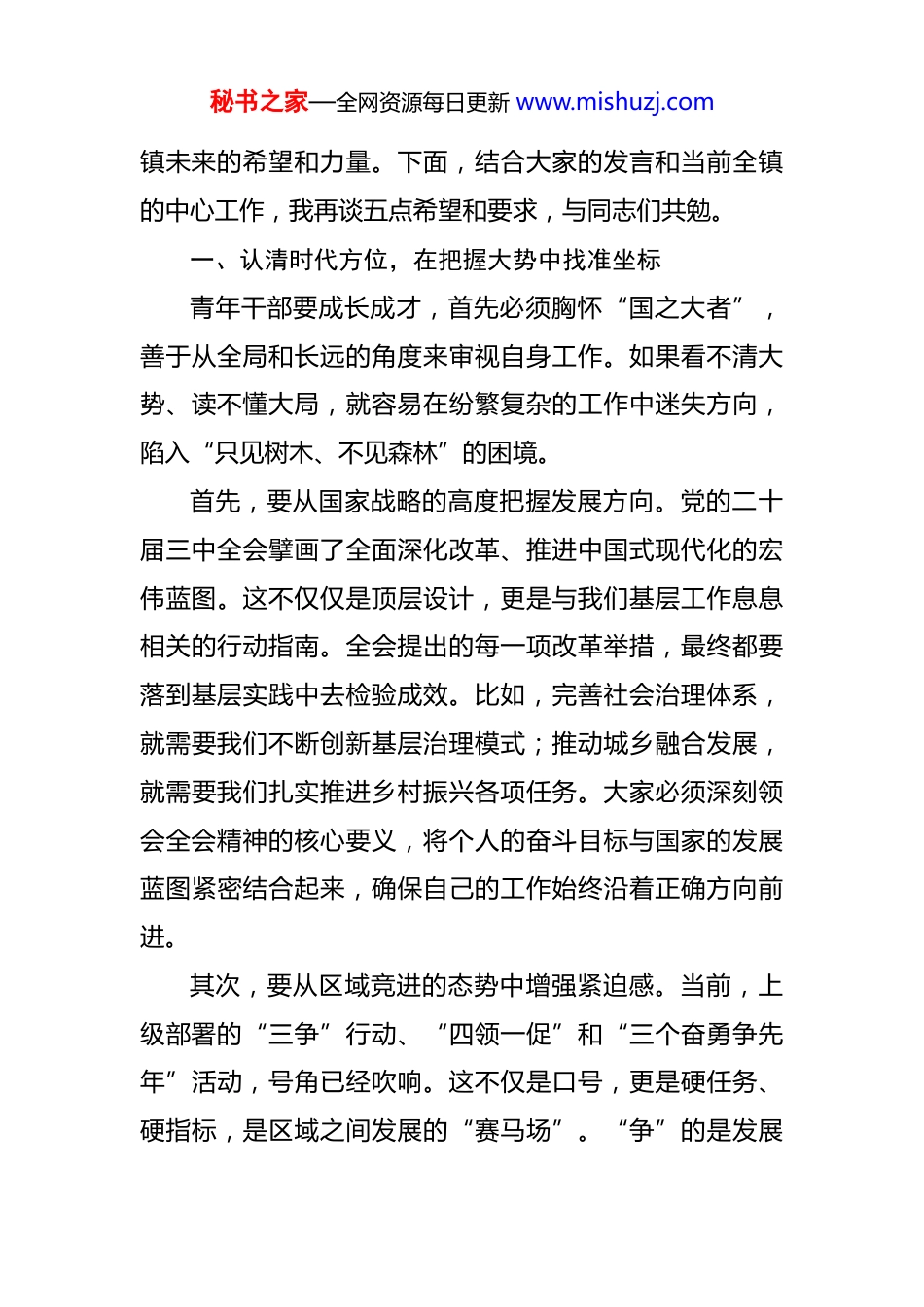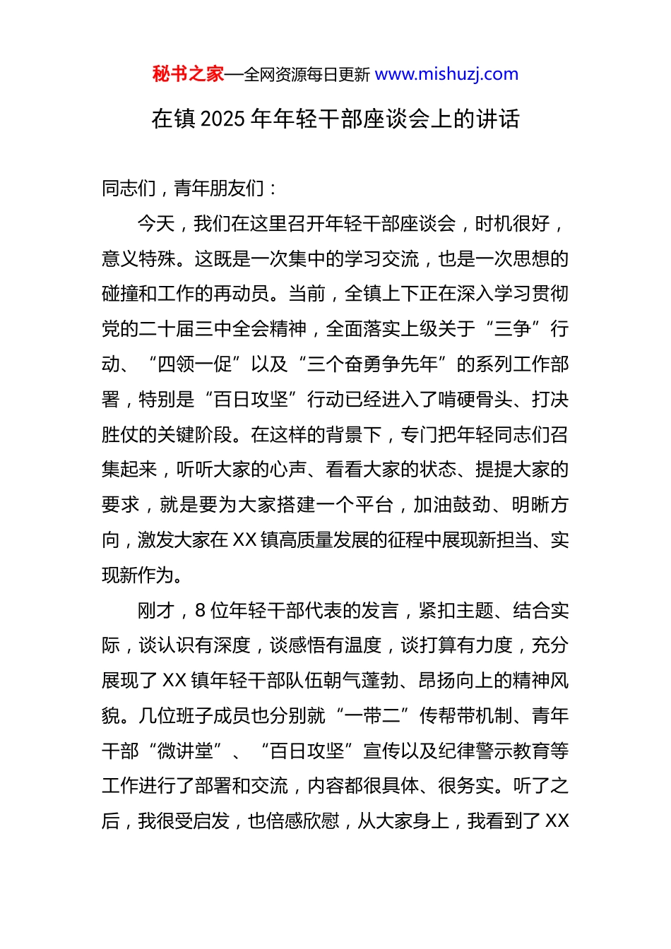 秘书之家—全网资源每日更新 www.mishuzj.com在镇 2025 年年轻干部座谈会上的讲话 同志们,青年朋友们:今天,我们在这里召开年轻干部座谈会,时机很好,意义特殊。这既是一次集中的学习交流,也是一次思想的碰撞和工作的再动员。当前,全镇上下正在深入学习贯彻党的二十届三中全会精神,全面落实上级关于“三争”行动、“四领一促”以及“三个奋勇争先年”的系列工作部署,特别是“百日攻坚”行动已经进入了啃硬骨头、打决胜仗的关键阶段。在这样的背景下,专门把年轻同志们召集起来,听听大家的心声、看看大家的状态、提提大家的要求,就是要为大家搭建一个平台,加油鼓劲、明晰方向,激发大家在 XX 镇高质量发展的征程中展现新担当、实现新作为。刚才,8 位年轻干部代表的发言,紧扣主题、结合实际,谈认识有深度,谈感悟有温度,谈打算有力度,充分展现了 XX 镇年轻干部队伍朝气蓬勃、昂扬向上的精神风貌。几位班子成员也分别就“一带二”传帮带机制、青年干部“微讲堂”、“百日攻坚”宣传以及纪律警示教育等工作进行了部署和交流,内容都很具体、很务实。听了之后,我很受启发,也倍感欣慰,从大家身上,我看到了 XX秘书之家—全网资源每日更新 www.mishuzj.com镇未来的希望和力量。下面,结合大家的发言和当前全镇的中心工作,我再谈五点希望和要求,与同志们共勉。一、认清时代方位,在把握大势中找准坐标青年干部要成长成才,首先必须胸怀“国之大者”,善于从全局和长远的角度来审视自身工作。如果看不清大势、读不懂大局,就容易在纷繁复杂的工作中迷失方向,陷入“只见树木、不见森林”的困境。首先,要从国家战略的高度把握发展方向。党的二十届三中全会擘画了全面深化改革、推进中国式现代化的宏伟蓝图。这不仅仅是顶层设计,更是与我们基层工作息息相关的行动指南。全会提出的每一项改革举措,最终都要落到基层实践中去检验成效。比如,完善社会治理体系,就需要我们不断创新基层治理模式;推动城乡融合发展,就需要我们扎实推进乡村振兴各项任务。大家必须深刻领会全会精神的核心要义,将个人的奋斗目标与国家的发展蓝图紧密结合起来,确保自己的工作始终沿着正确方向前进。其次,要从区域竞进的态势中增强紧迫感。当前,上级部署的“三争”行动、“四领一促”和“三个奋勇争先年”活动,号角已经吹响。这不仅是口号,更是硬任务、硬指标,是区域之间发展的“赛马场”。“争”的是发展秘书之家—全网资源每日更新 www.mishuzj.com机遇、政策支持和项目落地;“领”的是产业创新、乡村振兴、基层治理和队伍建设。我们 XX 镇身处其中,不进则退,慢进亦是退。全镇年轻干部必须清醒地认识到这种“标兵在前、追兵在后”的激烈竞争态势,把“争”的意识刻在骨子里,把“领”的行动落实在岗位上,以“时时放心不下”的责任感和“时不我待、只争朝夕”的紧迫感,投身到这场发展大竞赛中去。最后,要从全镇攻坚的实践中明确奋斗靶心。当前,全镇工作的重中之重就是“百日攻坚”行动。这是检验我们干部队伍战斗力的试金石,也是推动 XX 镇跨越发展的加速器。自行动启动以来,全镇上下凝心聚力,取得了阶段性显著成效。截至目前,全镇纳入攻坚清单的 35 个重点项目中,已有 28 个项目超序时进度推进,累计完成投资约3.8 亿元。特别是像 XX 溪流域综合治理工程,已完成投资近千万元,沿线生态环境得到显著改善;XX 工业园区的标准厂房三期项目,仅用 45 天就完成了全部征迁任务,跑出了项目建设的“XX 速度”,这些成绩的取得,离不开每一位一线干部的艰辛付出,其中也闪耀着在座许多年轻干部的身影。大家要将“百日攻坚”的主战场作为淬炼本领、建功立业的主阵地,把个人的成长融入到项目建设、产业发展、民生改善的生动实践中,在解决一个又一个难题、秘书之家—全网资源每日更新 www.mishuzj.com攻克一个又一个堡垒中,找准自己的价值坐标。二、淬炼政治品格,在坚定信念中把稳航向理想信念是共产党人精神上的“钙”,没有理想信念,或者理想信念不坚定,精神上就会“缺钙”,就会得“软骨病”。对年轻干部而言,事业的“第一粒扣子”就是理想...
