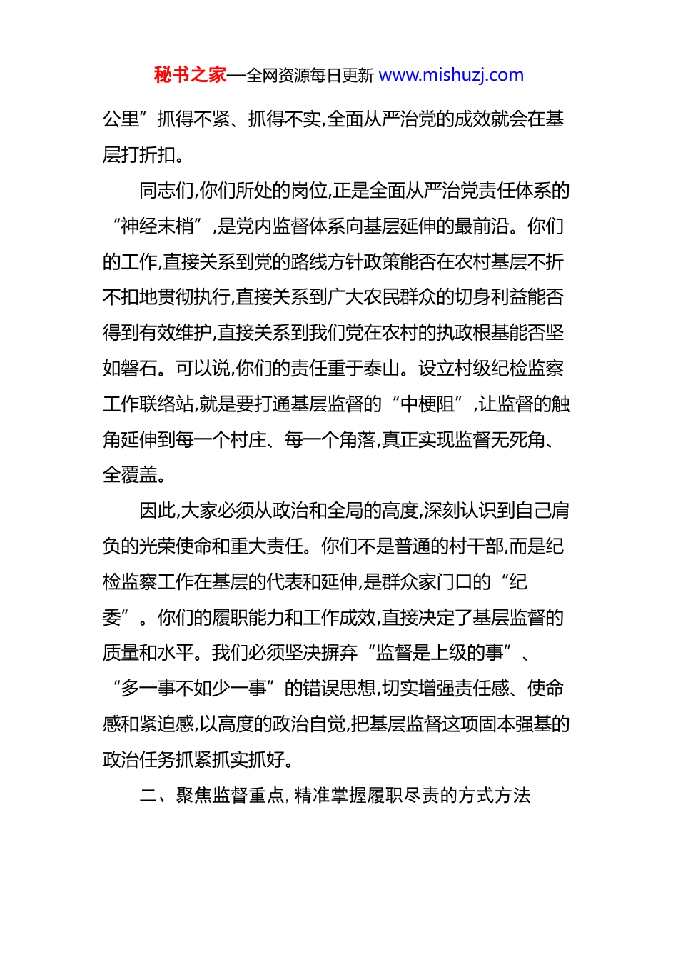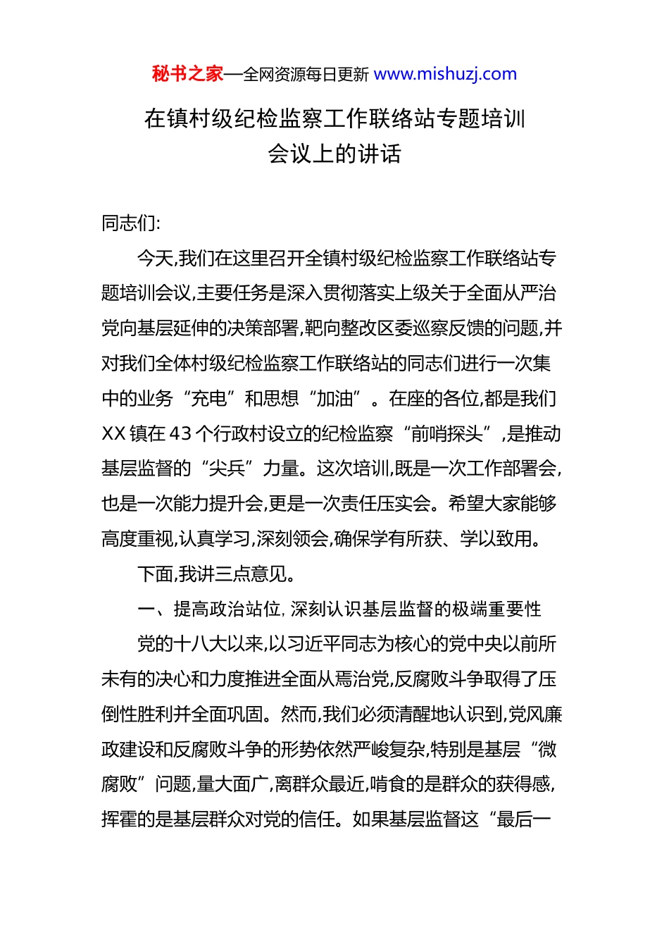 秘书之家—全网资源每日更新 www.mishuzj.com在镇村级纪检监察工作联络站专题培训会议上的讲话 同志们:今天,我们在这里召开全镇村级纪检监察工作联络站专题培训会议,主要任务是深入贯彻落实上级关于全面从严治党向基层延伸的决策部署,靶向整改区委巡察反馈的问题,并对我们全体村级纪检监察工作联络站的同志们进行一次集中的业务“充电”和思想“加油”。在座的各位,都是我们XX 镇在 43 个行政村设立的纪检监察“前哨探头”,是推动基层监督的“尖兵”力量。这次培训,既是一次工作部署会,也是一次能力提升会,更是一次责任压实会。希望大家能够高度重视,认真学习,深刻领会,确保学有所获、学以致用。下面,我讲三点意见。一、提高政治站位,深刻认识基层监督的极端重要性党的十八大以来,以习近平同志为核心的党中央以前所未有的决心和力度推进全面从焉治党,反腐败斗争取得了压倒性胜利并全面巩固。然而,我们必须清醒地认识到,党风廉政建设和反腐败斗争的形势依然严峻复杂,特别是基层“微腐败”问题,量大面广,离群众最近,啃食的是群众的获得感,挥霍的是基层群众对党的信任。如果基层监督这“最后一秘书之家—全网资源每日更新 www.mishuzj.com公里”抓得不紧、抓得不实,全面从严治党的成效就会在基层打折扣。同志们,你们所处的岗位,正是全面从严治党责任体系的“神经末梢”,是党内监督体系向基层延伸的最前沿。你们的工作,直接关系到党的路线方针政策能否在农村基层不折不扣地贯彻执行,直接关系到广大农民群众的切身利益能否得到有效维护,直接关系到我们党在农村的执政根基能否坚如磐石。可以说,你们的责任重于泰山。设立村级纪检监察工作联络站,就是要打通基层监督的“中梗阻”,让监督的触角延伸到每一个村庄、每一个角落,真正实现监督无死角、全覆盖。因此,大家必须从政治和全局的高度,深刻认识到自己肩负的光荣使命和重大责任。你们不是普通的村干部,而是纪检监察工作在基层的代表和延伸,是群众家门口的“纪委”。你们的履职能力和工作成效,直接决定了基层监督的质量和水平。我们必须坚决摒弃“监督是上级的事”、“多一事不如少一事”的错误思想,切实增强责任感、使命感和紧迫感,以高度的政治自觉,把基层监督这项固本强基的政治任务抓紧抓实抓好。二、聚焦监督重点,精准掌握履职尽责的方式方法秘书之家—全网资源每日更新 www.mishuzj.com做好基层监督工作,光有热情和责任心是远远不够的,还必须掌握科学有效的方式方法,做到“会监督、善监督”。联络站的核心职责,就是通过精准有效的监督,保障村级权力在阳光下运行。具体来说,要重点抓好以下三个方面:第一,必须拧紧集体“钱袋子”的“安全阀”,盯紧村级重大事项决策。村集体的资产、资源和资金,是全体村民的共同财富,一分一厘都不能乱花。近年来,从我们 XX 区查处的一些案例来看,诸如虚报冒领各类补贴、集体资产处置不公开不透明、工程项目暗箱操作等问题,在一些地方仍然存在,根源往往在于重大事项决策机制流于形式。对此,你们手中最有力、最管用的监督武器,就是“四议两公开”制度。根据相关规定,“四议两支持”工作法是一个严密的程序链条。“四议”指的是:首先由村党支部对涉及村民利益的重大事项进行提议;随后由村“两委”联席会进行商议,形成初步方案;再提交党员大会进行审议,广泛听取意见;最后由村民代表会议或村民会议进行最终决议。这个过程,一步都不能少,一次都不能乱。你们的监督职责,就是要全程“嵌入”这个决策链条,看提议是否符合实际、商议是否充分、审议是否民主、决议是否合规。决议作出后,更要监督好“两公开”的落实情况。决议内容和实施结果,都必须及时、全面地向全体村民公开,通常秘书之家—全网资源每日更新 www.mishuzj.com要在村务公开栏等固定场所公告,时间不能少于七天。你们要检查公开的内容是否真实完整,公开的形式是否便捷有效,公开的时间是否满足要求。要让每一个村民都成为监督者,共同守护好集体的“钱袋子”。第二,必须擦亮基层“探照灯”,用好小微权力监督的“新利器”。基层权力虽小,但如果失去监督,就容易滋生腐败,损害群众利益。为了让小微权力运行更加透明规范,中央纪委国家监委统一推...