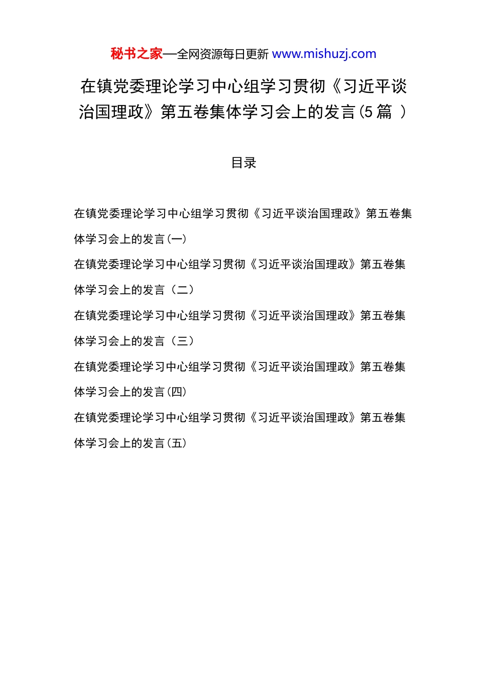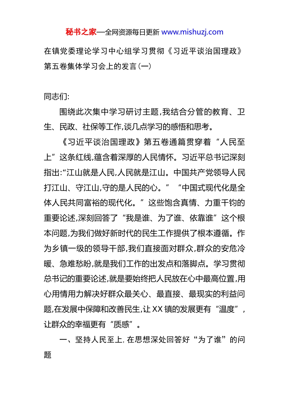 秘书之家—全网资源每日更新 www.mishuzj.com在镇党委理论学习中心组学习贯彻《习近平谈治国理政》第五卷集体学习会上的发言(5 篇 )目录在镇党委理论学习中心组学习贯彻《习近平谈治国理政》第五卷集体学习会上的发言(一)在镇党委理论学习中心组学习贯彻《习近平谈治国理政》第五卷集体学习会上的发言(二)在镇党委理论学习中心组学习贯彻《习近平谈治国理政》第五卷集体学习会上的发言(三)在镇党委理论学习中心组学习贯彻《习近平谈治国理政》第五卷集体学习会上的发言(四)在镇党委理论学习中心组学习贯彻《习近平谈治国理政》第五卷集体学习会上的发言(五)秘书之家—全网资源每日更新 www.mishuzj.com在镇党委理论学习中心组学习贯彻《习近平谈治国理政》第五卷集体学习会上的发言(一)同志们: 围绕此次集中学习研讨主题,我结合分管的教育、卫生、民政、社保等工作,谈几点学习的感悟和思考。《习近平谈治国理政》第五卷通篇贯穿着“人民至上”这条红线,蕴含着深厚的人民情怀。习近平总书记深刻指出:“江山就是人民,人民就是江山。中国共产党领导人民打江山、守江山,守的是人民的心。”“中国式现代化是全体人民共同富裕的现代化。”这些饱含真情、力重千钧的重要论述,深刻回答了“我是谁、为了谁、依靠谁”这个根本问题,为我们做好新时代的民生工作提供了根本遵循。作为乡镇一级的领导干部,我们直接面对群众,群众的安危冷暖、急难愁盼,就是我们工作的出发点和落脚点。学习贯彻总书记的重要论述,就是要始终把人民放在心中最高位置,用心用情用力解决好群众最关心、最直接、最现实的利益问题,在发展中保障和改善民生,让 XX 镇的发展更有“温度”,让群众的幸福更有“质感”。一、坚持人民至上,在思想深处回答好“为了谁”的问题秘书之家—全网资源每日更新 www.mishuzj.com思想是行动的先导。只有从思想上真正解决“为了谁”的问题,才能在行动上自觉做到“依靠谁”和“服务谁”。一要深刻感悟“人民就是江山”的政治分量。我们党来自于人民、根植于人民、服务于人民。忘记了人民,就意味着背叛。我们手中的权力是人民赋予的,只能用来为人民谋利益。在工作中,必须时刻扪心自问:我们的决策是不是符合最广大人民的根本利益?我们的工作是不是解决了群众的实际困难?我们的作风是不是得到了群众的认可?要经常深入村居、深入群众家中,听真话、察实情,了解群众在想什么、盼什么、愁什么,把群众的“表情包”作为我们工作的“晴雨表”。只有始终与人民群众想在一起、干在一起,风雨同舟、同甘共苦,我们的工作才能获得最广泛、最深厚的基础和力量。二要牢固树立“共同富裕”的目标追求。习近平总书记强调,共同富裕是中国特色社会主义的本质要求。我们抓民生工作,不能满足于“有没有”,更要关注“好不好”“均不均”。要坚持尽力而为、量力而行,聚焦群众需求,一件事情接着一件事情办,一年接着一年干。要特别关注城乡之间、不同群体之间的差异,在教育、医疗、养老等公共服务资源的配置上,要更多地向农村地区、向困难群众倾斜,努力秘书之家—全网资源每日更新 www.mishuzj.com让发展的成果更多更公平地惠及全体人民。比如,我镇的中心小学和地处偏远村的教学点,在硬件设施和师资力量上还存在一定差距。下一步,我们要通过集团化办学、教师轮岗交流等方式,促进优质教育资源共享,努力让每一个孩子都能在家门口享受到公平而有质量的教育。二、坚持问题导向,在履职尽责中回答好“干什么”的问题保障和改善民生没有终点站,只有连续不断的新起点。必须坚持问题导向,聚焦“一老一小”、特殊群体等重点领域,拿出实招硬招,补齐民生短板。一要办好人民满意的教育。教育是国之大计、党之大计。要持续加大教育投入,改善办学条件。去年,我们完成了镇中心幼儿园的新建工程,新增了 120 个优质学位,有效缓解了“入园难”问题。今年,我们的重点是启动镇中学的宿舍楼和食堂改扩建工程,彻底改善寄宿学生的学习生活环境。硬件要提升,软件更要跟上。要加强教师队伍建设,关心教师成长,让他们安心从教、热心从教。要全面落实“双减”政策,促进学生德智体美劳全面发展。二要建设更高水平的健康 XX。人民健康是社会...
