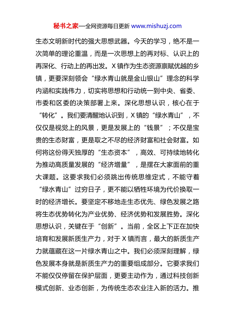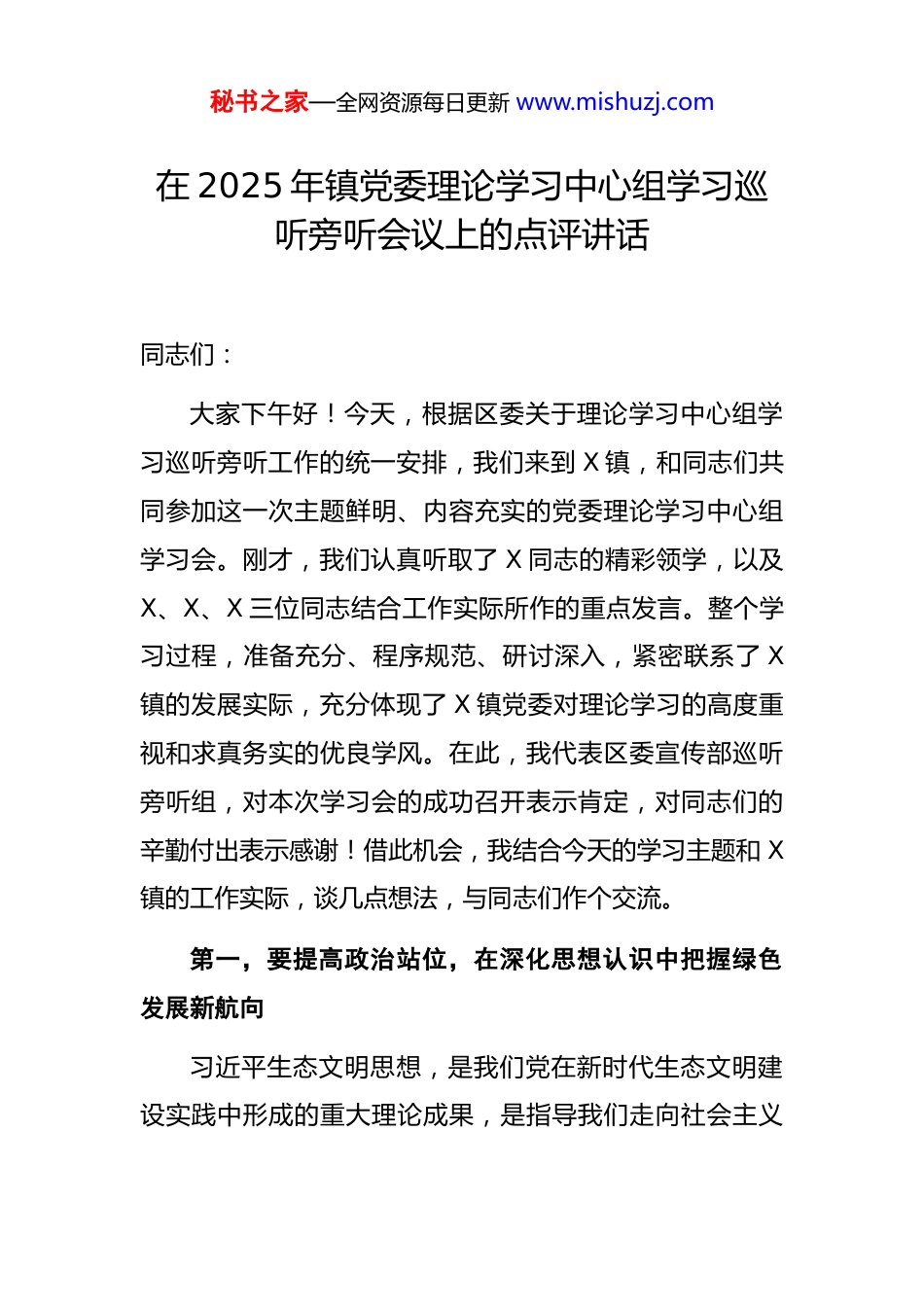 秘书之家—全网资源每日更新 www.mishuzj.com在 2025 年镇党委理论学习中心组学习巡听旁听会议上的点评讲话同志们:大家下午好!今天,根据区委关于理论学习中心组学习巡听旁听工作的统一安排,我们来到 X 镇,和同志们共同参加这一次主题鲜明、内容充实的党委理论学习中心组学习会。刚才,我们认真听取了 X 同志的精彩领学,以及X、X、X 三位同志结合工作实际所作的重点发言。整个学习过程,准备充分、程序规范、研讨深入,紧密联系了 X镇的发展实际,充分体现了 X 镇党委对理论学习的高度重视和求真务实的优良学风。在此,我代表区委宣传部巡听旁听组,对本次学习会的成功召开表示肯定,对同志们的辛勤付出表示感谢!借此机会,我结合今天的学习主题和 X镇的工作实际,谈几点想法,与同志们作个交流。第一,要提高政治站位,在深化思想认识中把握绿色发展新航向习近平生态文明思想,是我们党在新时代生态文明建设实践中形成的重大理论成果,是指导我们走向社会主义秘书之家—全网资源每日更新 www.mishuzj.com生态文明新时代的强大思想武器。今天的学习,绝不是一次简单的理论重温,而是一次思想上的再对标、认识上的再深化、行动上的再出发。X 镇作为生态资源禀赋优越的乡镇,更要深刻领会“绿水青山就是金山银山”理念的科学内涵和实践伟力,切实将思想和行动统一到中央、省委、市委和区委的决策部署上来。深化思想认识,核心在于“转化”。我们要清醒地认识到,X 镇的“绿水青山”,不仅仅是视觉上的风景,更是发展上的“钱景”;不仅是宝贵的生态财富,更是取之不尽的经济财富和社会财富。如何将这份得天独厚的“生态资本”,高效、可持续地转化为推动高质量发展的“经济增量”,是摆在大家面前的重大课题。这要求我们必须跳出传统思维定式,不能守着“绿水青山”过穷日子,更不能以牺牲环境为代价换取一时的经济增长。要坚定不移地走生态优先、绿色发展之路将生态优势转化为产业优势、经济优势和发展胜势。深化思想认识,关键在于“创新”。当前,全区上下正在加快培育和发展新质生产力,对于 X 镇而言,最大的新质生产力就蕴藏在这一片绿水青山之中。我们必须深刻理解,绿色发展本身就是新质生产力的重要组成部分。它要求我们不能仅仅停留在保护层面,更要主动作为,通过科技创新模式创新、业态创新,为传统生态农业注入新的活力。推秘书之家—全网资源每日更新 www.mishuzj.com动传统茶产业、果林产业向智慧农业、品牌农业、文旅农业转型升级,这本身就是培育新质生产力的生动实践。我们要用全新的视野审视脚下的土地,用创新的思维谋划未来的发展,让科技为绿水青山赋能,让生态为产业发展增值。第二,要聚焦重点任务,在强化协同推进中开创产业融合新局面学习的目的全在于运用。将习近平生态文明思想落到实处,关键在于形成一套行之有效的“施工图”,将宏伟蓝图细化为一个个具体项目、一项项扎实举措。从刚才的交流和我们了解到的情况看,X 镇党委思路清晰,抓手有力,特别是在“茶、梅、林”三篇文章上,已经有了很好的布局。接下来,关键在一个“干”字,要强化协同,挂图作战,确保各项部署落地生根、开花结果。一是要在“一杯茶”上做精做强,巩固核心优势。X 镇是“中国 X 茶发源地”,这块金字招牌分量极重。我们拥有超过 1.1 万亩的茶园,年产值达到 1.3 亿元,这是我们的基本盘,也是我们最大的底气。但我们不能满足于此,必须在传承中创新在创新中发展。如何让“发源地”的优势更加凸显?关键在“种”。我了解到,镇里计划在 X 山选址建立 X 茶育种育苗核心基地,打造“种质资源圃”。这个项目立意高远秘书之家—全网资源每日更新 www.mishuzj.com抓住了产业发展的“牛鼻子”,是从源头上保障品质、提升品牌价值的关键一招。区委对此高度关注,希望同志们能以超常规的力度加以推进。要尽快完成规划设计,明确建设规模、资金投入和时间节点,力争将其打造成一个集种质资源保护、新品种选育、标准化育苗和技术推广于一体的标杆性项目。同时,要加快推进像 X 生态茶园这样的改造项目,集成推广绿色防控技术和生态种植模式,全...