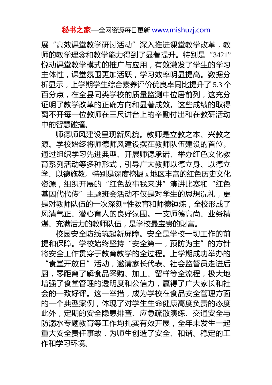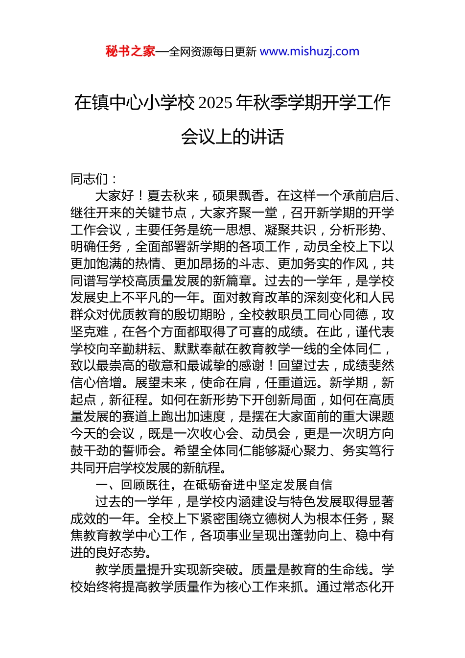 秘书之家—全网资源每日更新 www.mishuzj.com在镇中心小学校 2025 年秋季学期开学工作会议上的讲话同志们:大家好!夏去秋来,硕果飘香。在这样一个承前启后、继往开来的关键节点,大家齐聚一堂,召开新学期的开学工作会议,主要任务是统一思想、凝聚共识,分析形势、明确任务,全面部署新学期的各项工作,动员全校上下以更加饱满的热情、更加昂扬的斗志、更加务实的作风,共同谱写学校高质量发展的新篇章。过去的一学年,是学校发展史上不平凡的一年。面对教育改革的深刻变化和人民群众对优质教育的殷切期盼,全校教职员工同心同德,攻坚克难,在各个方面都取得了可喜的成绩。在此,谨代表学校向辛勤耕耘、默默奉献在教育教学一线的全体同仁,致以最崇高的敬意和最诚挚的感谢!回望过去,成绩斐然信心倍增。展望未来,使命在肩,任重道远。新学期,新起点,新征程。如何在新形势下开创新局面,如何在高质量发展的赛道上跑出加速度,是摆在大家面前的重大课题今天的会议,既是一次收心会、动员会,更是一次明方向鼓干劲的誓师会。希望全体同仁能够凝心聚力、务实笃行共同开启学校发展的新航程。一、回顾既往,在砥砺奋进中坚定发展自信过去的一学年,是学校内涵建设与特色发展取得显著成效的一年。全校上下紧密围绕立德树人为根本任务,聚焦教育教学中心工作,各项事业呈现出蓬勃向上、稳中有进的良好态势。教学质量提升实现新突破。质量是教育的生命线。学校始终将提高教学质量作为核心工作来抓。通过常态化开秘书之家—全网资源每日更新 www.mishuzj.com展“高效课堂教学研讨活动”深入推进课堂教学改革,教师的教学理念和教学能力得到了显著提升。特别是“3421”悦动课堂教学模式的推广与应用,有效激发了学生的学习主体性,课堂氛围更加活跃,学习效率明显提高。数据分析显示,上学期学生综合素养评价优良率同比提升了 5.3 个百分点,在全县同类学校的质量监测中位居前列,这充分证明了教学改革的正确方向和显著成效。这些成绩的取得离不开每一位教师在三尺讲台上的辛勤付出和在教研活动中的智慧碰撞。师德师风建设呈现新风貌。教师是立教之本、兴教之源。学校始终将师德师风建设摆在教师队伍建设的首位。通过组织学习先进典型、开展师德承诺、举办红色文化教育系列活动等多种形式,引导广大教师以德立身、以德立学、以德施教。特别是深度挖掘 x 地区丰富的红色历史文化资源,组织开展的“红色故事我来讲”演讲比赛和“红色基因代代传”主题班会活动不仅是对学生的思想洗礼,更是对教师队伍的一次深刻*性教育和师德锤炼,全校形成了风清气正、潜心育人的良好氛围。一支师德高尚、业务精湛、充满活力的教师队伍,是学校最宝贵的财富。校园安全防线筑起新屏障。安全是学校一切工作的前提和保障。学校始终坚持“安全第一,预防为主”的方针将安全工作贯穿于教育教学的全过程。上学期成功举办的“食堂开放日”活动,邀请家长代表、社会监督员走进后厨,零距离了解食品采购、加工、留样等全流程,极大地增强了食堂管理的透明度和公信力,赢得了广大家长和社会的一致好评。这一举措,成为学校在食品安全管理方面的一个典型案例,体现了对学生生命健康高度负责的态度此外,定期的安全隐患排查、应急疏散演练、交通安全与防溺水专题教育等工作均扎实有效开展,全年未发生一起重大安全责任事故,为师生创造了安全、和谐、稳定的工作和学习环境。秘书之家—全网资源每日更新 www.mishuzj.com这些成绩的取得,是全校 100 余名教职员工团结协作、奋力拼搏的结果,凝聚着大家的智慧和汗水。它雄辩地证明,学校的干部教师队伍是一支想干事、能干事、干成事的队伍,学校的发展战略是符合实际、富有成效的。这些成绩,为新学期的发展奠定了坚实的基础,也给予了大家应对挑战、勇毅前行的强大底气和自信。二、审视当下,在时代变局中明确前进方向当前,正处在一个深刻变革的时代,教育事业的发展也面临着前所未有的机遇与挑战。作为基础教育的一线阵地,必须清醒地认识到所处的历史方位和肩负的时代使命准确把握上级政策导向,主动顺应时代发展潮流。深刻领会高质量发展的核心要义。...