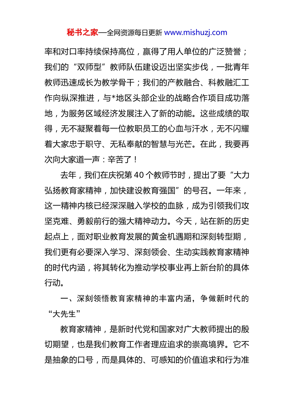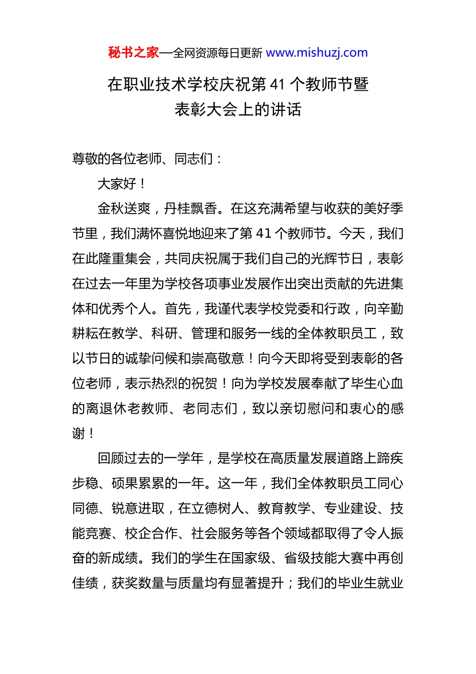 秘书之家—全网资源每日更新 www.mishuzj.com在职业技术学校庆祝第 41 个教师节暨表彰大会上的讲话 尊敬的各位老师、同志们:大家好!金秋送爽,丹桂飘香。在这充满希望与收获的美好季节里,我们满怀喜悦地迎来了第 41 个教师节。今天,我们在此隆重集会,共同庆祝属于我们自己的光辉节日,表彰在过去一年里为学校各项事业发展作出突出贡献的先进集体和优秀个人。首先,我谨代表学校党委和行政,向辛勤耕耘在教学、科研、管理和服务一线的全体教职员工,致以节日的诚挚问候和崇高敬意!向今天即将受到表彰的各位老师,表示热烈的祝贺!向为学校发展奉献了毕生心血的离退休老教师、老同志们,致以亲切慰问和衷心的感谢!回顾过去的一学年,是学校在高质量发展道路上蹄疾步稳、硕果累累的一年。这一年,我们全体教职员工同心同德、锐意进取,在立德树人、教育教学、专业建设、技能竞赛、校企合作、社会服务等各个领域都取得了令人振奋的新成绩。我们的学生在国家级、省级技能大赛中再创佳绩,获奖数量与质量均有显著提升;我们的毕业生就业秘书之家—全网资源每日更新 www.mishuzj.com率和对口率持续保持高位,赢得了用人单位的广泛赞誉;我们的“双师型”教师队伍建设迈出坚实步伐,一批青年教师迅速成长为教学骨干;我们的产教融合、科教融汇工作向纵深推进,与*地区头部企业的战略合作项目成功落地,为服务区域经济发展注入了新的动能。这些成绩的取得,无不凝聚着每一位教职员工的心血与汗水,无不闪耀着大家忠于职守、无私奉献的智慧与光芒。在此,我要再次向大家道一声:辛苦了!去年,我们在庆祝第 40 个教师节时,提出了要“大力弘扬教育家精神,加快建设教育强国”的号召。一年来,这一精神内核已经深深融入学校的血脉,成为引领我们攻坚克难、勇毅前行的强大精神动力。今天,站在新的历史起点上,面对职业教育发展的黄金机遇期和深刻转型期,我们更有必要深入学习、深刻领会、生动实践教育家精神的时代内涵,将其转化为推动学校事业再上新台阶的具体行动。一、深刻领悟教育家精神的丰富内涵,争做新时代的“大先生”教育家精神,是新时代党和国家对广大教师提出的殷切期望,也是我们教育工作者理应追求的崇高境界。它不是抽象的口号,而是具体的、可感知的价值追求和行为准秘书之家—全网资源每日更新 www.mishuzj.com则。一是要有心有大我、至诚报国的理想信念。这是教育家精神的灵魂。作为人民教师,我们的讲台虽小,但连接着国家的未来和民族的希望。要把个人的理想追求融入党和国家的事业之中,深刻认识到我们所从事的职业教育,是培养大国工匠、能工巧匠的摇篮,是推动产业升级、技术革新的重要支撑。每一堂精心准备的课程,每一次耐心细致的辅导,每一次对学生职业生涯的规划指导,都是在为国家现代化建设添砖加瓦。要坚定为党育人、为国育才的初心使命,引导学生树立正确的世界观、人生观、价值观,将爱国情、强国志、报国行自觉融入实现中华民族伟大复兴的奋斗之中。二是要有言为士则、行为世范的道德情操。这是教育家精神的基石。师者,所以传道授业解惑也。“传道”是第一位的。教师的言行举止,对学生具有潜移默化的深远影响。我们必须时刻自重、自省、自警、自励,以高尚的人格魅力和学识风范去感染学生、影响学生。要自觉遵守新时代教师职业行为十项准则,严守师德底线,坚决抵制任何形式的学术不端和有损教师形象的行为。在日常工作中,要做到课上课下一致、网上网下一致,以德立身、以德立学、以德施教,真正成为学生锤炼品格的引路人、学秘书之家—全网资源每日更新 www.mishuzj.com习知识的引路人、创新思维的引路人、奉献祖国的引路人。三是要有启智润心、因材施教的育人智慧。这是教育家精神的核心。我们的教育对象是活生生的、充满个性的个体。职业教育的特点决定了我们面对的学生在学习基础、兴趣特长、发展潜能上更加多元化。这就要求我们必须具备高超的育人智慧,摒弃“一刀切”的教学模式,真正做到因材施-教。要深入研究职业教育规律和学生成长成才规律,积极探索项目式教学、案例式教学、模块化教学等新型教学模式改革,将思政元素如...