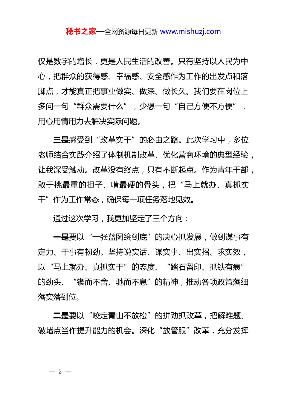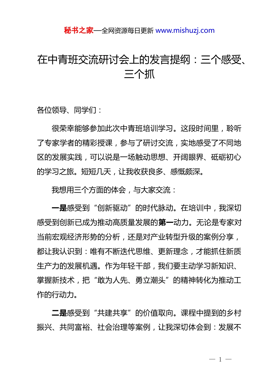 秘书之家—全网资源每日更新 www.mishuzj.com在中青班交流研讨会上的发言提纲:三个感受、三个抓各位领导、同学们:很荣幸能够参加此次中青班培训学习。这段时间里,聆听了专家学者的精彩授课,参与了研讨交流,实地感受了不同地区的发展实践,可以说是一场触动思想、开阔眼界、砥砺初心的学习之旅。短短几天,让我收获良多、感慨颇深。我想用三个方面的体会,与大家交流:一是感受到“创新驱动”的时代脉动。在培训中,我深切感受到创新已成为推动高质量发展的第一动力。无论是专家对当前宏观经济形势的分析,还是对产业转型升级的案例分享,都让我认识到:唯有不断迭代思维、更新理念,才能抓住新质生产力的发展机遇。作为年轻干部,我们要主动学习新知识、掌握新技术,把“敢为人先、勇立潮头”的精神转化为推动工作的行动力。二是感受到“共建共享”的价值取向。课程中提到的乡村振兴、共同富裕、社会治理等案例,让我深切体会到:发展不— 1 —秘书之家—全网资源每日更新 www.mishuzj.com仅是数字的增长,更是人民生活的改善。只有坚持以人民为中心,把群众的获得感、幸福感、安全感作为工作的出发点和落脚点,才能真正把事业做实、做深、做长久。我们要在岗位上多问一句“群众需要什么”,少想一句“自己方便不方便”,用心用情用力去解决实际问题。三是感受到“改革实干”的必由之路。此次学习中,多位老师结合实践介绍了体制机制改革、优化营商环境的典型经验,让我深受触动。改革没有终点,只有不断起点。作为青年干部,敢于挑最重的担子、啃最硬的骨头,把“马上就办、真抓实干”作为工作常态,确保每一项任务落地见效。通过这次学习,我更加坚定了三个方向:一是要以“一张蓝图绘到底”的决心抓发展,做到谋事有定力、干事有韧劲。坚持说实话、谋实事、出实招、求实效,以“马上就办、真抓实干”的态度、“踏石留印、抓铁有痕”的劲头、“锲而不舍、驰而不息”的精神,推动各项政策落细落实落到位。二是要以“咬定青山不放松”的拼劲抓改革,把解难题、破堵点当作提升能力的机会。深化“放管服”改革,充分发挥— 2 —秘书之家—全网资源每日更新 www.mishuzj.com互联网的优势,简化办事流程,提高服务效率,强化干部服务意识,杜绝效率低下、遇事推诿、随意执法、“小鬼难缠”等损坏营商环境的现象。三是要以“不破楼兰终不还”的执着抓落实,确保各项部署真正见效。坚持“以财辅政”工作导向,“攥指成拳”统筹财政资源,“放水养鱼”培植财源,“颗粒归仓”征管财税,“翻箱倒柜”盘活财力,千方百计做大财政“蛋糕”,强化预算绩效管理,有效防范化解财政运行风险,推动财政保障能力全面提升,不断夯实服务经济社会高质量发展的基础。“临渊羡鱼,不如退而结网”。学习的意义,不仅在于开阔眼界,更在于反思不足、对标先进、知行合一。接下来,我将把这次培训收获转化为做好本职工作的动力和方法,坚持多务实功、多打基础、多出成果,在各自岗位上书写新时代青年干部的担当与作为。谢谢大家!— 3 —