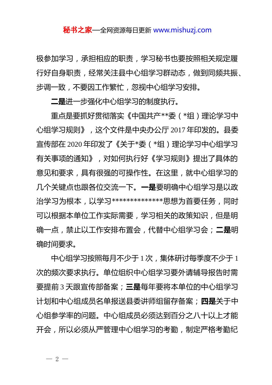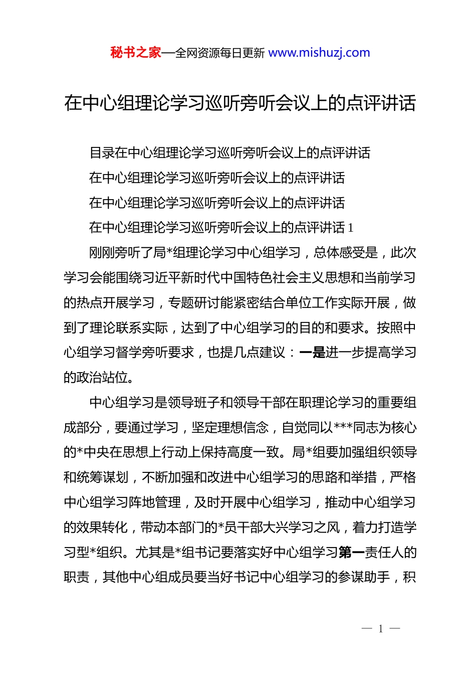 秘书之家—全网资源每日更新 www.mishuzj.com在中心组理论学习巡听旁听会议上的点评讲话目录在中心组理论学习巡听旁听会议上的点评讲话在中心组理论学习巡听旁听会议上的点评讲话在中心组理论学习巡听旁听会议上的点评讲话在中心组理论学习巡听旁听会议上的点评讲话 1刚刚旁听了局*组理论学习中心组学习,总体感受是,此次学习会能围绕习近平新时代中国特色社会主义思想和当前学习的热点开展学习,专题研讨能紧密结合单位工作实际开展,做到了理论联系实际,达到了中心组学习的目的和要求。按照中心组学习督学旁听要求,也提几点建议:一是进一步提高学习的政治站位。中心组学习是领导班子和领导干部在职理论学习的重要组成部分,要通过学习,坚定理想信念,自觉同以***同志为核心的*中央在思想上行动上保持高度一致。局*组要加强组织领导和统筹谋划,不断加强和改进中心组学习的思路和举措,严格中心组学习阵地管理,及时开展中心组学习,推动中心组学习的效果转化,带动本部门的*员干部大兴学习之风,着力打造学习型*组织。尤其是*组书记要落实好中心组学习第一责任人的职责,其他中心组成员要当好书记中心组学习的参谋助手,积— 1 —秘书之家—全网资源每日更新 www.mishuzj.com极参加学习,承担相应的职责,学习秘书也要按照相关规定履行好自身职责,经常关注县中心组学习群动态,做到同频共振、步调一致,不要因工作繁忙,忽视中心组学习安排。二是进一步强化中心组学习的制度执行。重点是要抓好贯彻落实《中国共产**委(*组)理论学习中心组学习规则》,这个文件是中央办公厅 2017 年印发的。县委宣传部在 2020 年印发了《关于*委(*组)理论学习中心组学习有关事项的通知》,对如何执行好《学习规则》提出了具体的意见和要求,具有很强的可操作性。在这里,就中心组学习的几个关键点也跟各位交流一下。一是要明确中心组学习是以政治学习为根本,以学习**************思想为首要任务,同时可以根据本单位工作实际需要,学习相关的政策知识,但是明确一点,禁止以工作安排布置会,代替中心组学习会;二是明确时间要求。中心组学习按照每月不少于 1 次,集体研讨每季度不少于 1次的频次要求执行。单位组织中心组学习要外请辅导报告时需要提前 3 天跟宣传部备案;三是每年要将本单位的中心组学习计划和中心组成员名单报送县委讲师组留存备案;四是关于中心组参学率的问题。中心组成员必须达到百分之八十以上才能开会,所以必须从严管理中心组学习的考勤,制定严格考勤纪— 2 —秘书之家—全网资源每日更新 www.mishuzj.com律;五要注重学习档案的整理归档。学习档案主要包括学习制度、学习计划、人员名单、学习资料、学习记录、发言材料、考勤记录(签到簿),以及每次会议主持讲话等。(规定的学习资料要发放及时)三是进一步做到理论联系实际,突出问题导向。中心组学习必须坚持问题导向,在解决突出问题上下功夫将理论与实际更加紧密地联系起来,真正做到“在学中干、在干中学”。这就要求我们在谋划和组织中心组学习时,必须紧密联系当前的具体工作实际,要针对在当前工作中的问题、难题来学,在解决突出问题上聚焦用力,努力推动理论学习成果向实际工作成效转化,杜绝出现学用两张皮现象。要对标省委“一改两为五做到”聚焦重点工作,真抓实干埋头苦干、抬头巧干,以优异成绩迎接*的二十大胜利召开。在中心组理论学习巡听旁听会议上的点评讲话 2 同志们:为深入贯彻《中国共产**委(*组)理论学习中心组学习规则》和《中国共产*宣传工作条例》,推动理论武装工作深入开展,提高*委(*组)领导班子和*员领导干部理论水平和工作能力,在全县上下进一步树立依规管理、从严治学的鲜明导向,按照县委统一安排部署,今天我们第 x 指导小组到 x 单位开展*委(*组)理论学习中心组学习巡听旁听工作。通过巡听旁听对— 3 —秘书之家—全网资源每日更新 www.mishuzj.comx*委(*组)理论学习中心组学习进行督查指导,了解掌握和综合研判 x*委(*组)理论学习中心组学习情况,重点掌握相关责任人履职尽责情况、学习计划制定和完成情况、重点内容学习与研讨...
