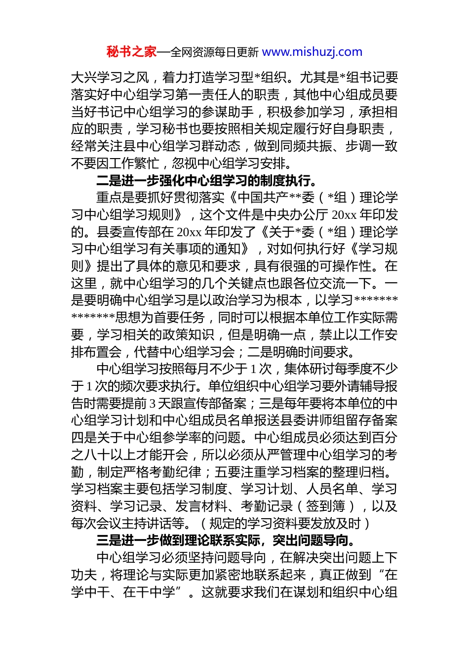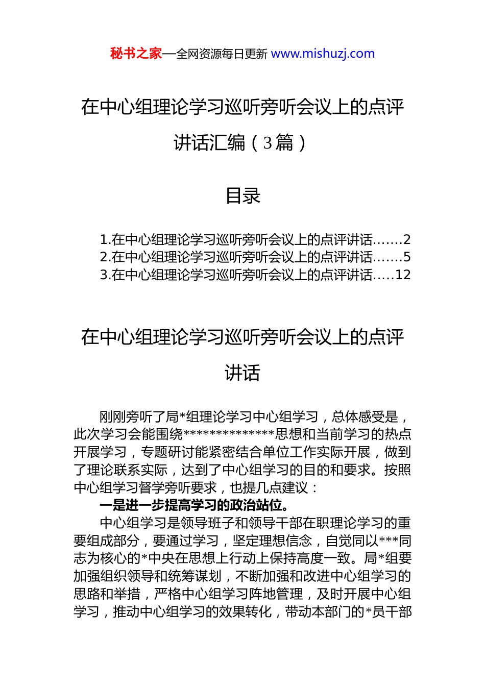 秘书之家—全网资源每日更新 www.mishuzj.com在中心组理论学习巡听旁听会议上的点评讲话汇编(3 篇)目录1.在中心组理论学习巡听旁听会议上的点评讲话.......22.在中心组理论学习巡听旁听会议上的点评讲话.......53.在中心组理论学习巡听旁听会议上的点评讲话.....12在中心组理论学习巡听旁听会议上的点评讲话刚刚旁听了局*组理论学习中心组学习,总体感受是,此次学习会能围绕**************思想和当前学习的热点开展学习,专题研讨能紧密结合单位工作实际开展,做到了理论联系实际,达到了中心组学习的目的和要求。按照中心组学习督学旁听要求,也提几点建议:一是进一步提高学习的政治站位。中心组学习是领导班子和领导干部在职理论学习的重要组成部分,要通过学习,坚定理想信念,自觉同以***同志为核心的*中央在思想上行动上保持高度一致。局*组要加强组织领导和统筹谋划,不断加强和改进中心组学习的思路和举措,严格中心组学习阵地管理,及时开展中心组学习,推动中心组学习的效果转化,带动本部门的*员干部秘书之家—全网资源每日更新 www.mishuzj.com大兴学习之风,着力打造学习型*组织。尤其是*组书记要落实好中心组学习第一责任人的职责,其他中心组成员要当好书记中心组学习的参谋助手,积极参加学习,承担相应的职责,学习秘书也要按照相关规定履行好自身职责,经常关注县中心组学习群动态,做到同频共振、步调一致不要因工作繁忙,忽视中心组学习安排。二是进一步强化中心组学习的制度执行。重点是要抓好贯彻落实《中国共产**委(*组)理论学习中心组学习规则》,这个文件是中央办公厅 20xx 年印发的。县委宣传部在 20xx 年印发了《关于*委(*组)理论学习中心组学习有关事项的通知》,对如何执行好《学习规则》提出了具体的意见和要求,具有很强的可操作性。在这里,就中心组学习的几个关键点也跟各位交流一下。一是要明确中心组学习是以政治学习为根本,以学习**************思想为首要任务,同时可以根据本单位工作实际需要,学习相关的政策知识,但是明确一点,禁止以工作安排布置会,代替中心组学习会;二是明确时间要求。中心组学习按照每月不少于 1 次,集体研讨每季度不少于 1 次的频次要求执行。单位组织中心组学习要外请辅导报告时需要提前 3 天跟宣传部备案;三是每年要将本单位的中心组学习计划和中心组成员名单报送县委讲师组留存备案四是关于中心组参学率的问题。中心组成员必须达到百分之八十以上才能开会,所以必须从严管理中心组学习的考勤,制定严格考勤纪律;五要注重学习档案的整理归档。学习档案主要包括学习制度、学习计划、人员名单、学习资料、学习记录、发言材料、考勤记录(签到簿),以及每次会议主持讲话等。(规定的学习资料要发放及时)三是进一步做到理论联系实际,突出问题导向。中心组学习必须坚持问题导向,在解决突出问题上下功夫,将理论与实际更加紧密地联系起来,真正做到“在学中干、在干中学”。这就要求我们在谋划和组织中心组秘书之家—全网资源每日更新 www.mishuzj.com学习时,必须紧密联系当前的具体工作实际,要针对在当前工作中的问题、难题来学,在解决突出问题上聚焦用力努力推动理论学习成果向实际工作成效转化,杜绝出现学用两张皮现象。要对标省委“一改两为五做到”聚焦重点工作,真抓实干、埋头苦干、抬头巧干,以优异成绩迎接*的二十大胜利召开。在中心组理论学习巡听旁听会议上的点评讲话同志们:为深入贯彻《中国共产**委(*组)理论学习中心组学习规则》和《中国共产*宣传工作条例》,推动理论武装工作深入开展,提高*委(*组)领导班子和*员领导干部理论水平和工作能力,在全县上下进一步树立依规管理、从严治学的鲜明导向,按照县委统一安排部署,今天我们第 x 指导小组到 x 单位开展*委(*组)理论学习中心组学习巡听旁听工作。通过巡听旁听对 x*委(*组)理论学习中心组学习进行督查指导,了解掌握和综合研判 x*委(*组)理论学习中心组学习情况,重点掌握相关责任人履职尽责情况、学习计划制定和完成情况、重点内容学习与研讨交流情况、学风和学习档案建设情况、学习制度建立健...