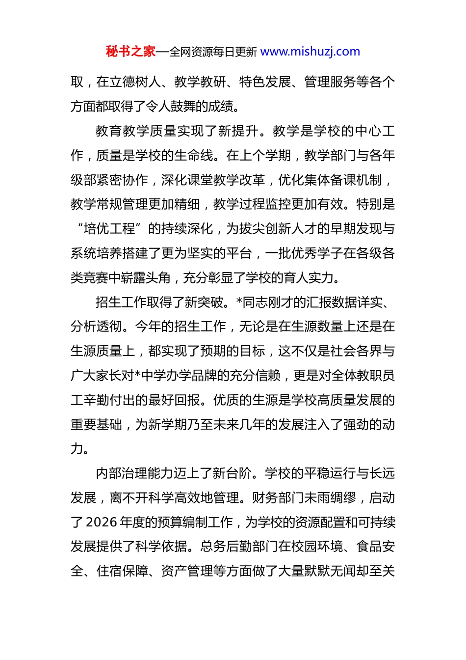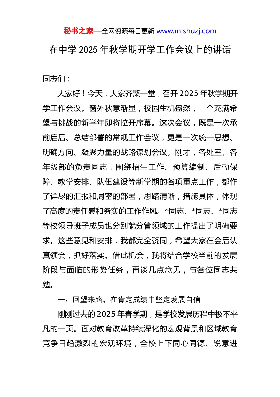 秘书之家—全网资源每日更新 www.mishuzj.com在中学 2025 年秋学期开学工作会议上的讲话 同志们:大家好!今天,大家齐聚一堂,召开 2025 年秋学期开学工作会议。窗外秋意渐显,校园生机盎然,一个充满希望与挑战的新学年即将拉开序幕。这次会议,既是一次承前启后、总结部署的常规工作会议,更是一次统一思想、明确方向、凝聚力量的战略谋划会议。刚才,各处室、各年级部的负责同志,围绕招生工作、预算编制、后勤保障、教学安排、队伍建设等新学期的各项重点工作,都作了详尽的汇报和周密的部署,思路清晰,措施具体,体现了高度的责任感和务实的工作作风。*同志、*同志、*同志等校领导班子成员也分别就分管领域的工作提出了明确要求。这些意见和安排,我都完全赞同,希望大家在会后认真领会,抓好落实。借此机会,我将结合学校当前的发展阶段与面临的形势任务,再谈几点意见,与各位同志共勉。一、回望来路,在肯定成绩中坚定发展自信刚刚过去的 2025 年春学期,是学校发展历程中极不平凡的一页。面对教育改革持续深化的宏观背景和区域教育竞争日趋激烈的宏观环境,全校上下同心同德、锐意进秘书之家—全网资源每日更新 www.mishuzj.com取,在立德树人、教学教研、特色发展、管理服务等各个方面都取得了令人鼓舞的成绩。教育教学质量实现了新提升。教学是学校的中心工作,质量是学校的生命线。在上个学期,教学部门与各年级部紧密协作,深化课堂教学改革,优化集体备课机制,教学常规管理更加精细,教学过程监控更加有效。特别是“培优工程”的持续深化,为拔尖创新人才的早期发现与系统培养搭建了更为坚实的平台,一批优秀学子在各级各类竞赛中崭露头角,充分彰显了学校的育人实力。招生工作取得了新突破。*同志刚才的汇报数据详实、分析透彻。今年的招生工作,无论是在生源数量上还是在生源质量上,都实现了预期的目标,这不仅是社会各界与广大家长对*中学办学品牌的充分信赖,更是对全体教职员工辛勤付出的最好回报。优质的生源是学校高质量发展的重要基础,为新学期乃至未来几年的发展注入了强劲的动力。内部治理能力迈上了新台阶。学校的平稳运行与长远发展,离不开科学高效地管理。财务部门未雨绸缪,启动了 2026 年度的预算编制工作,为学校的资源配置和可持续发展提供了科学依据。总务后勤部门在校园环境、食品安全、住宿保障、资产管理等方面做了大量默默无闻却至关秘书之家—全网资源每日更新 www.mishuzj.com重要的工作,为师生创造了安全、舒适、和谐的工作学习环境。各部门协同配合,管理服务的精细化水平显著提高。这些成绩的取得,凝聚着在座各位以及全校广大教职员工的心血与汗水,是大家恪尽职守、团结奋斗的结果。在此,我谨代表学校党总支和校领导班子,向辛勤工作在各个岗位上的全体同志,表示最衷心的感谢!二、审视当下,在认清形势中增强忧患意识成绩属于过去,未来始于足下。在肯定成绩、坚定自信的同时,更要清醒地认识到当前学校发展所处的历史方位和面临的深刻变革。机遇与挑战并存,动力与压力同在,只有准确识变、科学应变、主动求变,才能在新的征程中牢牢把握发展主动权。从外部环境看,教育改革的深化带来了新要求。随着新课程、新教材、新高考改革的全面推进,对学校的课程建设能力、教师的专业发展水平、学生的综合素质评价都提出了前所未有的高标准。育人模式正在从“知识传授”向“核心素养培育”深刻转型,评价体系正在从“唯分数”向“德智体美劳全面发展”深刻转变。这种系统性的变革,要求大家必须跳出传统思维定式,主动适应,积极探索,否则就可能在新一轮的教育竞争中落伍掉队。秘书之家—全网资源每日更新 www.mishuzj.com从区域发展看,百舸争流的态势带来了新压力。周边兄弟学校都在抢抓机遇、加快发展,在特色创建、品牌塑造、人才引进等方面动作频频、亮点纷呈。教育资源的竞争,本质上是办学质量和办学特色的竞争。如果满足于现状、故步自封,就如同逆水行舟,不进则退。大家必须要有强烈的危机感和紧迫感,始终保持奔跑的姿态,才能在激烈的竞争中巩固优势、再创辉煌。从内在需求看,师生成长期待带来了新课题...