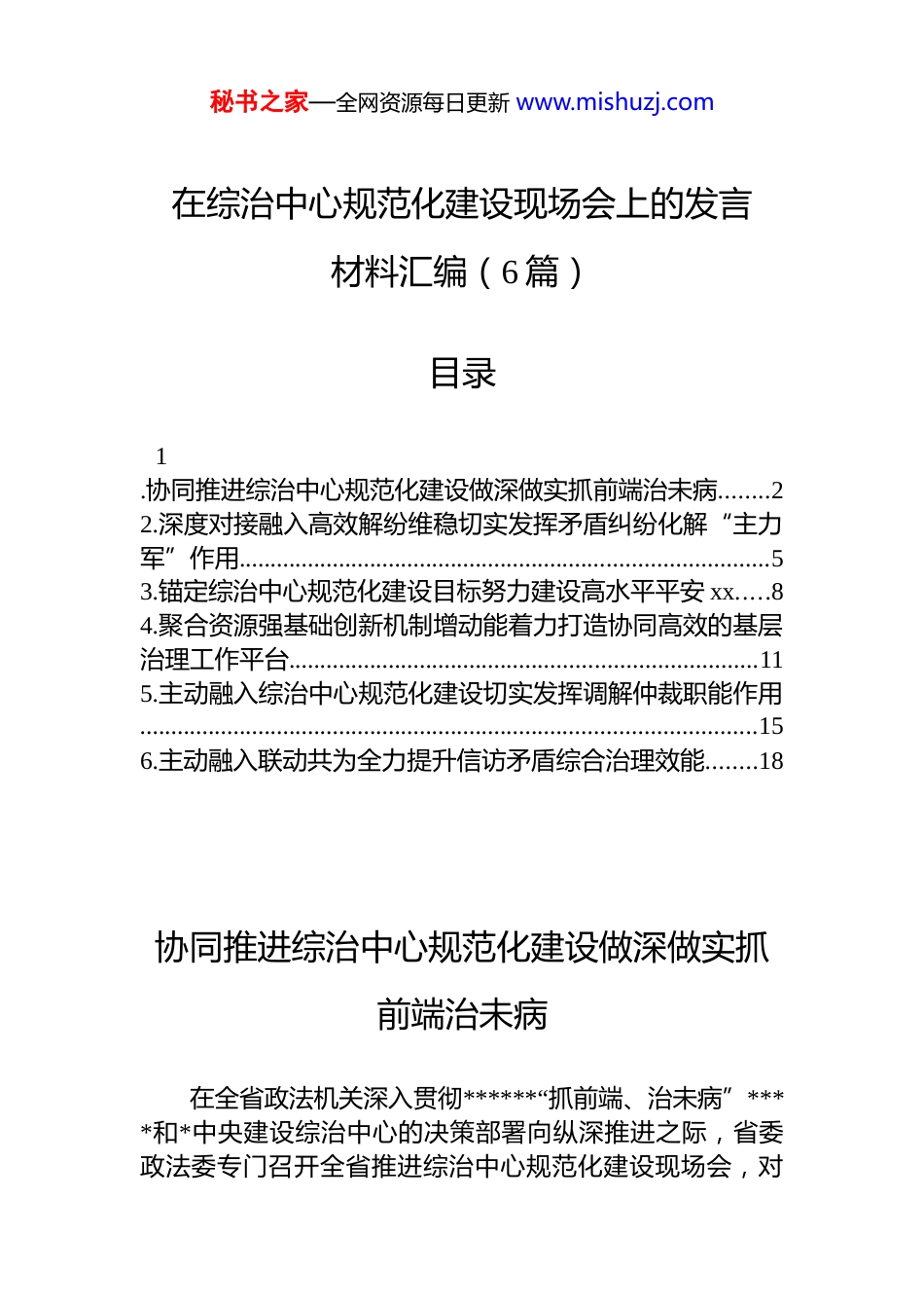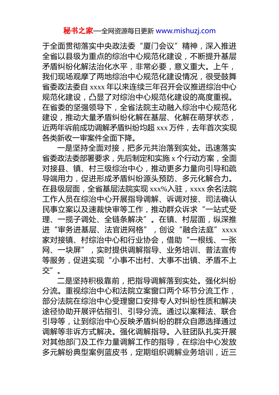 秘书之家—全网资源每日更新 www.mishuzj.com在综治中心规范化建设现场会上的发言材料汇编(6 篇)目录1.协同推进综治中心规范化建设做深做实抓前端治未病........22.深度对接融入高效解纷维稳切实发挥矛盾纠纷化解“主力军”作用.....................................................................................53.锚定综治中心规范化建设目标努力建设高水平平安 xx.....84.聚合资源强基础创新机制增动能着力打造协同高效的基层治理工作平台...........................................................................115.主动融入综治中心规范化建设切实发挥调解仲裁职能作用...................................................................................................156.主动融入联动共为全力提升信访矛盾综合治理效能........18协同推进综治中心规范化建设做深做实抓前端治未病在全省政法机关深入贯彻******“抓前端、治未病”****和*中央建设综治中心的决策部署向纵深推进之际,省委政法委专门召开全省推进综治中心规范化建设现场会,对秘书之家—全网资源每日更新 www.mishuzj.com于全面贯彻落实中央政法委“厦门会议”精神,深入推进全省以县级为重点的综治中心规范化建设,不断提升基层矛盾纠纷化解法治化水平,非常必要,意义重大。上午,我们现场观摩了两地综治中心规范化建设情况,很受鼓舞省委政法委自 xxxx 年以来连续三年召开会议推进综治中心规范化建设,凸显了对综治中心规范化建设的高度重视。在省委的坚强领导下,全省法院主动融入综治中心规范化建设,推动大量矛盾纠纷化解在基层、化解在萌芽状态,近两年诉前成功调解矛盾纠纷均超 xxx 万件,去年首次实现各类新收一审案件全面下降。一是坚持全面对接,把多元共治落到实处。迅速落实省委政法委部署要求,先后制定和实施 x 个行动方案,全面对接县、镇、村三级综治中心,推动更多力量向引导和疏导端用力,促进形成矛盾纠纷源头预防、多元化解合力。在县级层面,全省基层法院实现 xxx%入驻,xxxx 余名法院工作人员在综治中心开展指导调解、诉调对接、司法确认民事立案以及速裁快审等工作,推动群众诉求“一站式受理、一揽子调处、全链条解决”。在镇、村层面,纵深推进“审务进基层、法官进网格”,创设“融合法庭”xxxx家对接镇、村综治中心和行业协会,借助“一根线、一张网、一块屏”,实时提供调解指导、业务培训、普法宣传等服务,促进实现“小事不出村、大事不出镇、矛盾不上交”。二是坚持积极靠前,把指导调解落到实处。强化纠纷分流。重视综治中心和法院立案窗口两个环节分流工作,部分法院在综治中心受理窗口安排专人对纠纷性质和解决途径协助开展评估指引、引导分流。通过以案释法、联合引导等,让到综治中心反映矛盾纠纷的群众自愿选择通过调解等非诉方式解决。强化调解指导。入驻团队扎实开展对其他部门及工作力量调解工作的指导,在综治中心发放多元解纷典型案例蓝皮书,定期组织调解业务培训,近三秘书之家—全网资源每日更新 www.mishuzj.com年培训各类调解人员 x.xx 万人次,与扬州大学共建 xx 调解学院,与省人社厅等 x 部门共同开展金牌劳动人事争议调解员培育选树活动,与省司法厅联合发布法治实训项目十大典型经验等,促推人民调解、行政调解、行业性专业性调解增强调解能力水平。强化诉调对接。整合多元解纷力量深化“总对总”在线诉调对接和人民法院调解平台“进乡村、进社区、进网格”工作,全省 xxxx 个调解组织、x.x 万名调解员、x.x 万个基层治理单位入驻人民法院调解平台,通过综治中心等平台邀请 xxx 名人大代表设立调解工作室,聘请 xxx 多名退休法官参与调解,线上线下开展司法确认和出具调解书,加强调解协议履行的司法保障。强化先行调解。对当事人不愿选择分流或综治中心调解不成的纠纷,及时登记立案,并在当事人同意的基础上开展先行调解。今年上半年开展先行调解 xx.x 万件,调解成功 xx.xx 万件;先行调解成功率 xx.xx%。三是坚持依法断后,把定分止争落到实处。依法开展诉中调解,坚持应调尽调、当判则判,在综...